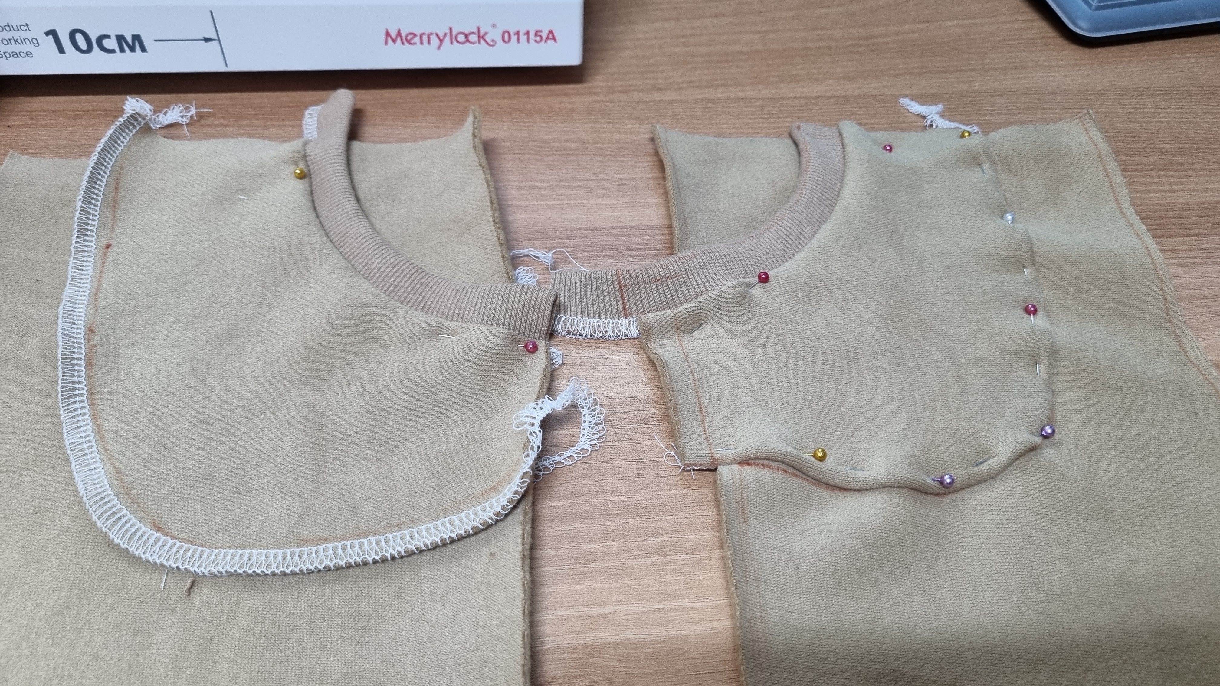 주머니의 올이 풀리지 않도록 오버룩 하고 다리 앞판에 고정시켜 줘요. 기모라 그런지 확실히 엄청 두꺼워요. 시침핀으로 고정하면서 '이게 혼스 미싱으로 재봉이 될까?' 걱정스러운 마음이 가득했어요.