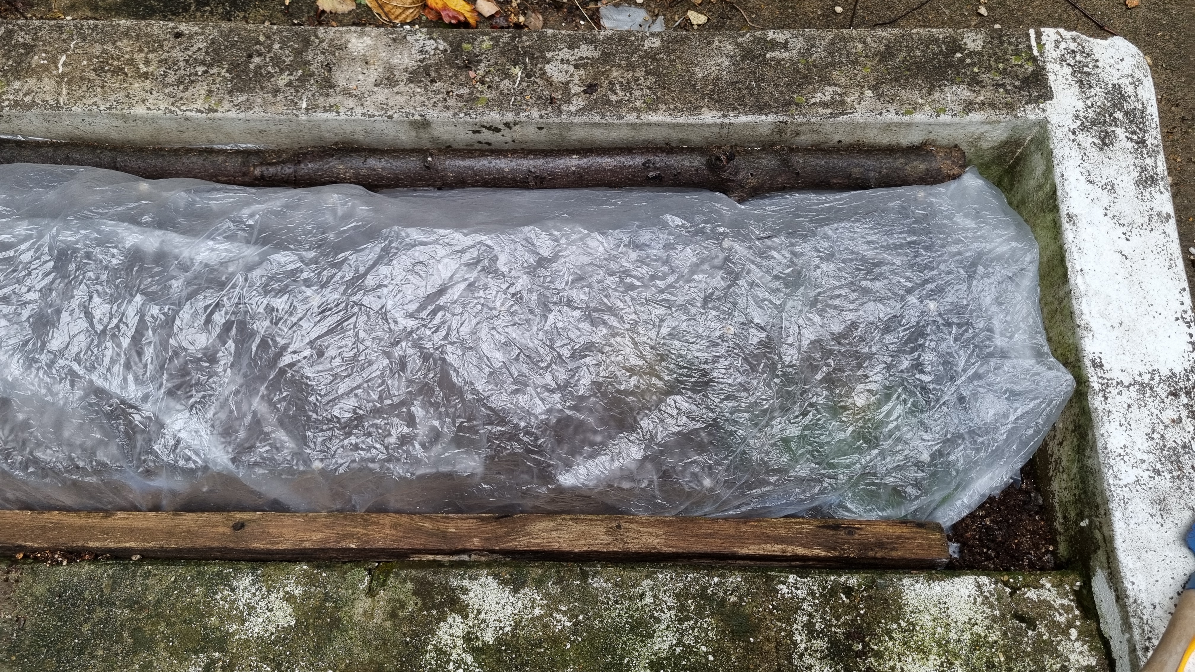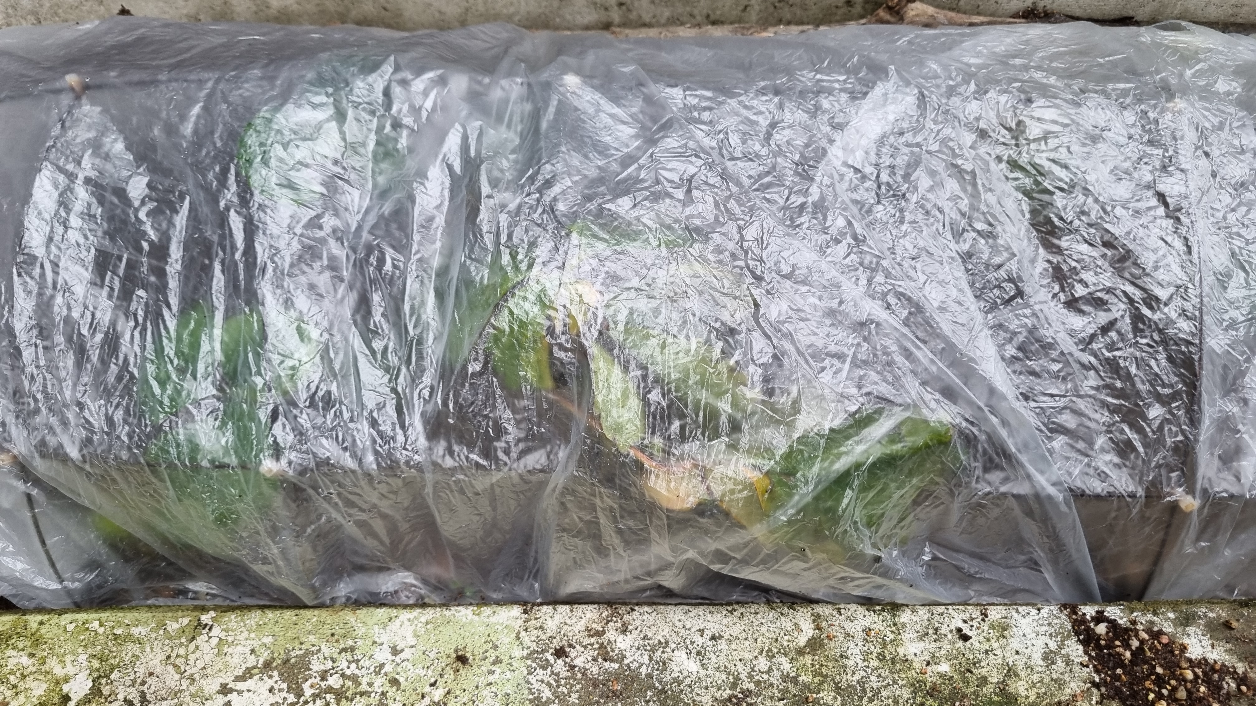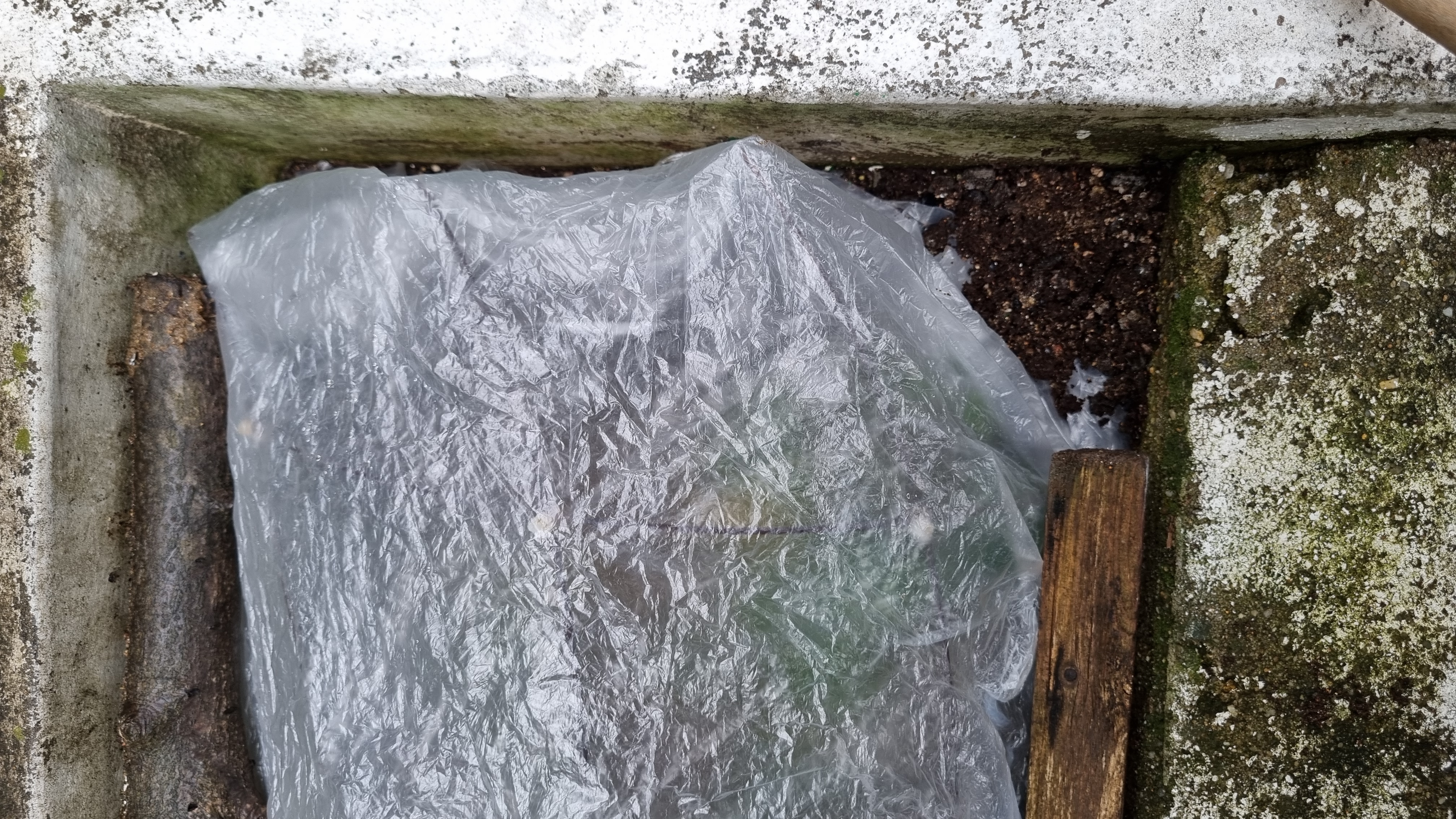 창고에 아주 큰 봉지가 있었어요. 버리지 않고 모아두길 잘했어요. 이 얇은 봉지 두 겹을 딸기 위에 씌웠어요. 지지대가 봉지 2겹을 잘 버텨주고 있어요. 정말 투명하진 않지만 이 정도면 충분히 빛은 받을 수 있을 것 같아요. 겨울은 딸기도 휴면 상태라 빛이 많이 필요할 것 같지도 않아요. 비닐 안으로 딸기 잎이 조금 보여서 비닐을 걷지 않아도 죽었는지 살았는지 쉽게 확인할 수 있을 것 같아요.