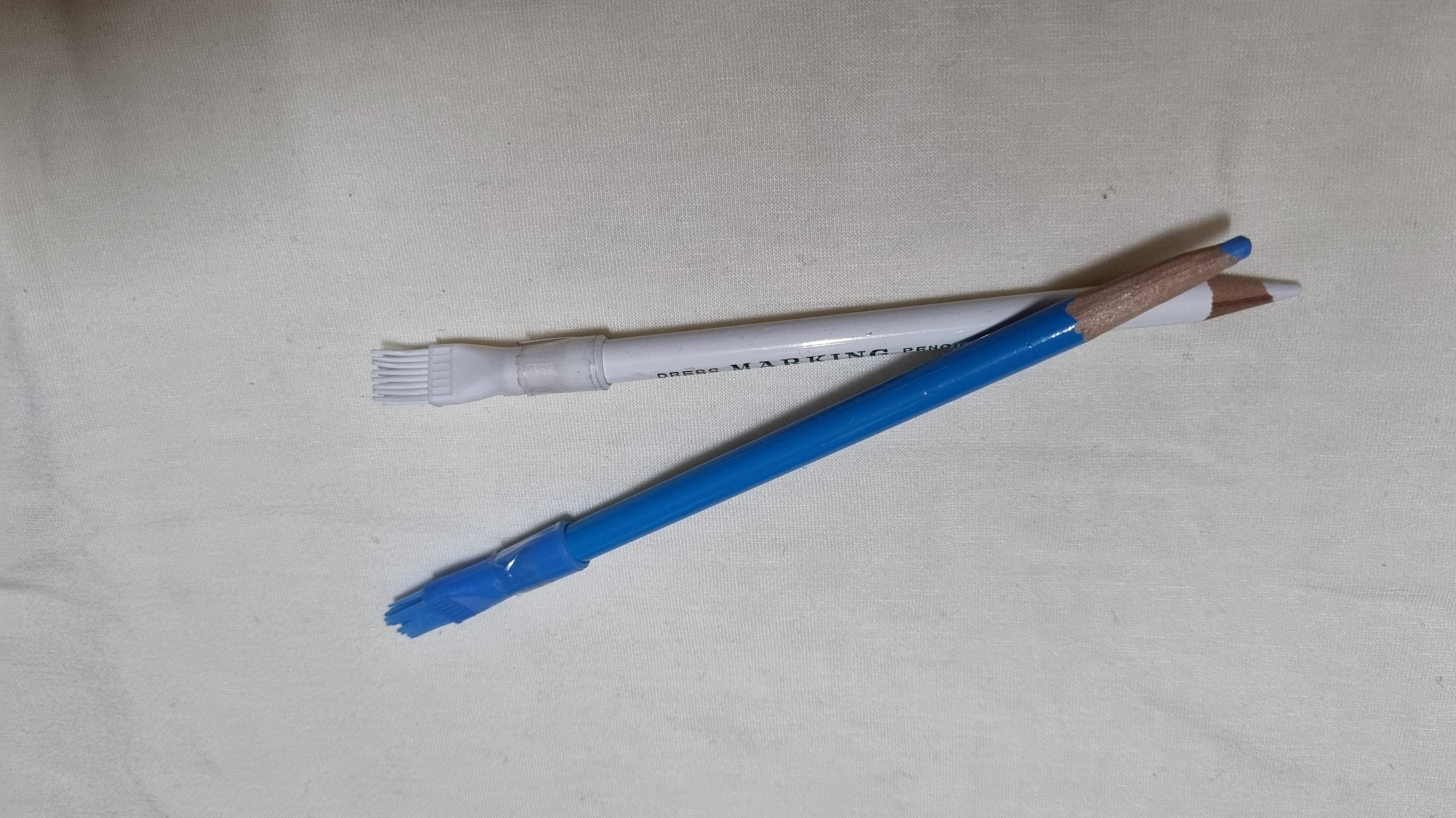 가끔 사용하지만 웬만하면 잘 사용하지 않아요. 사용하는데 익숙하지 않아서 그런지 원단에 사용하면 어딘 진하게 그려지고 어딘 잘 보이지도 않게 흐리게 그려져요. 그래서 초크칠을 여러 번 해요. 너무 불편해요. 위의 사진에서 초크가 많이 비어 있네요. 아이들이 꺼내서 써서 그래요. 저는 안 썼어요.