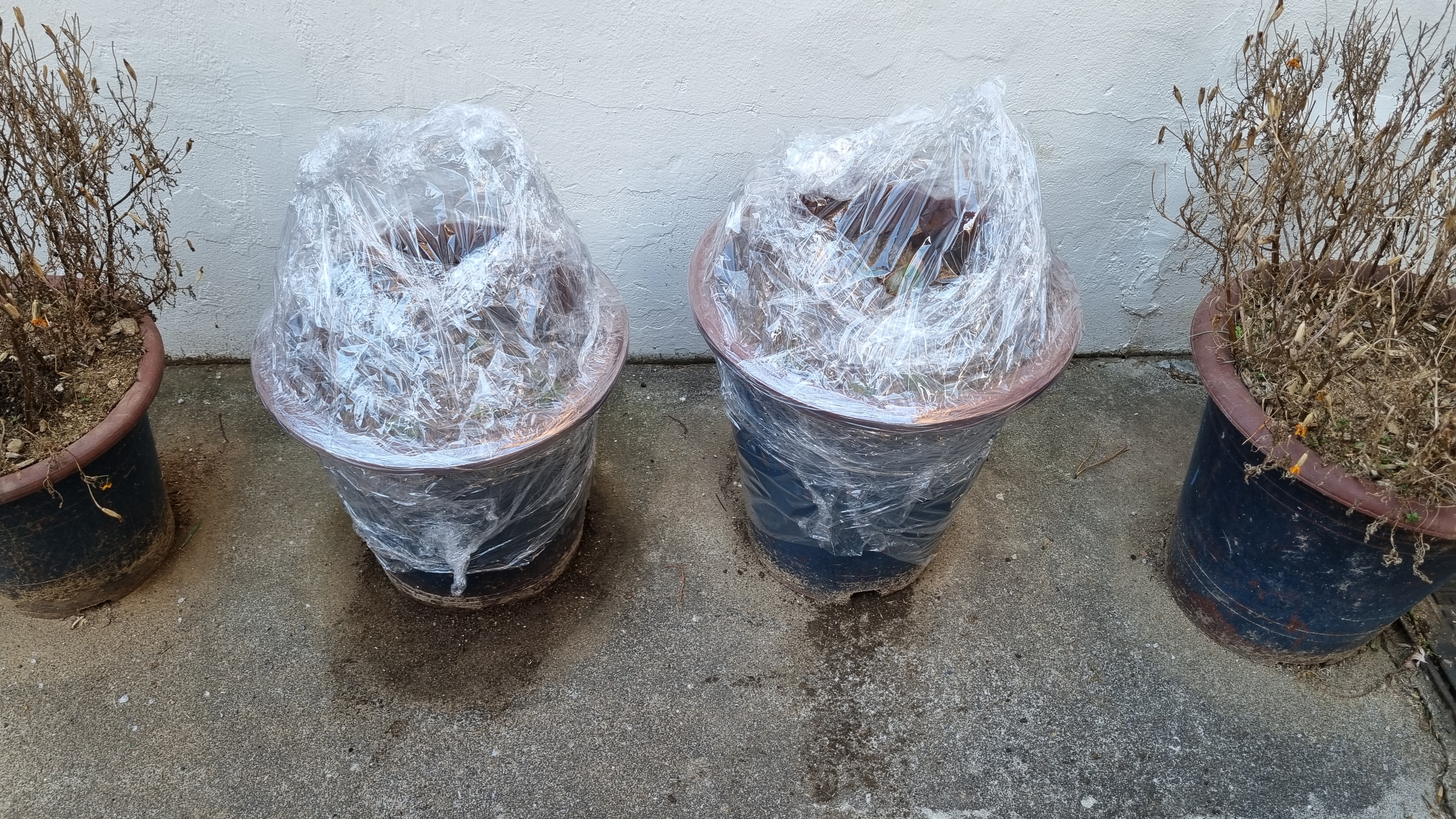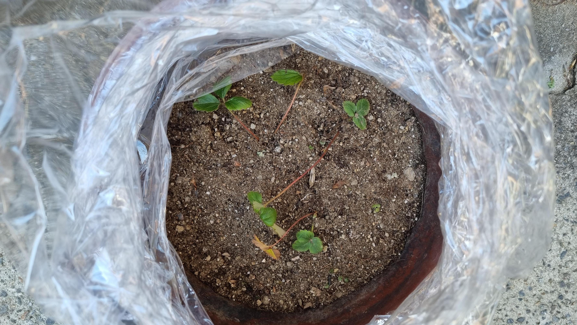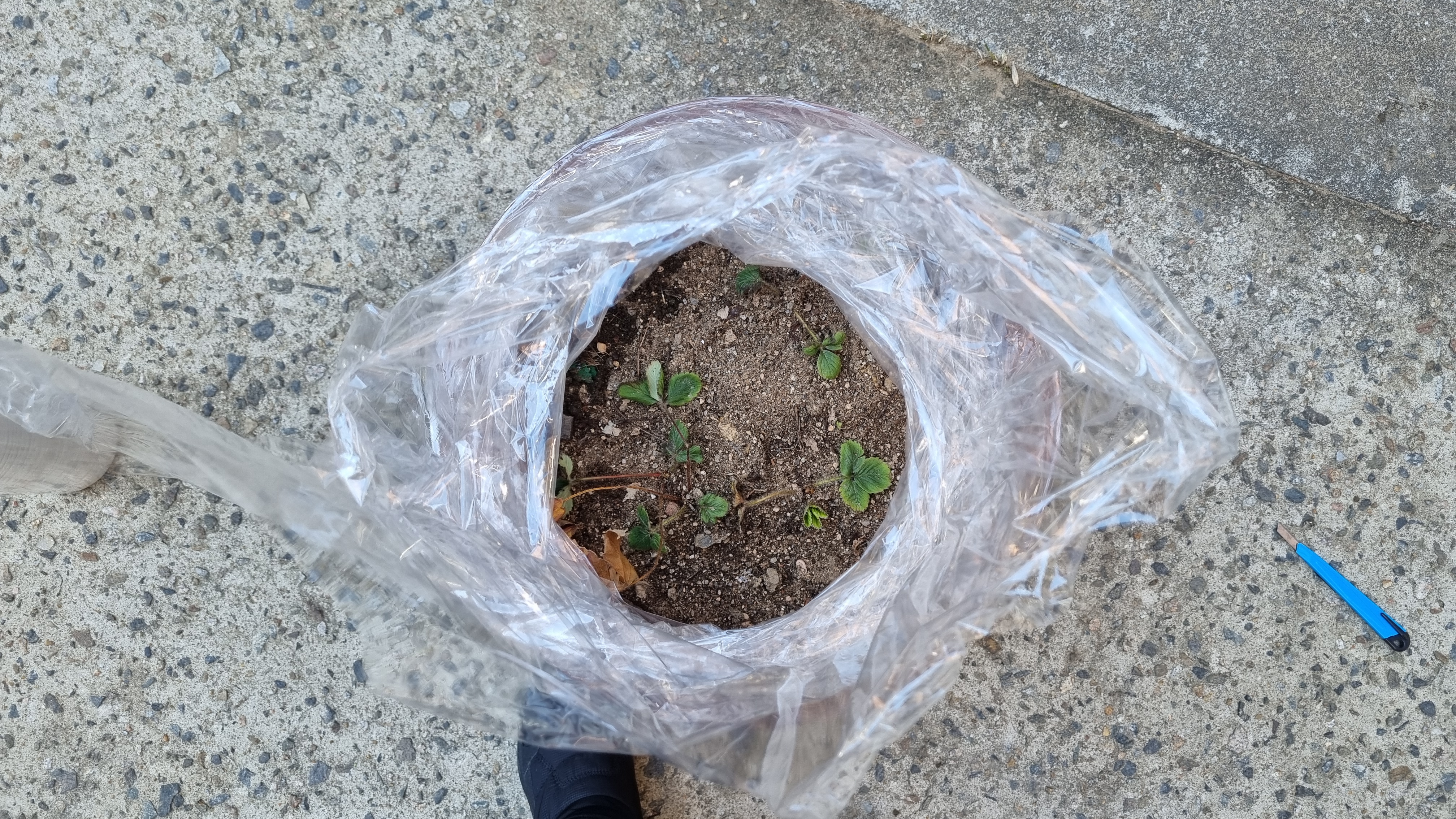 화분 딸기를 랩으로 돌돌 말아서 보온했어요. 사진으로 보니깐 귀엽네요. 랩도 분명 보온 효과가 있을 거라 믿어요. 아마 이 화분 딸기들도 시간이 지나면 랩 안쪽으로 물방울이 맺혀 있겠죠? 다음주에 확인해 볼게요.