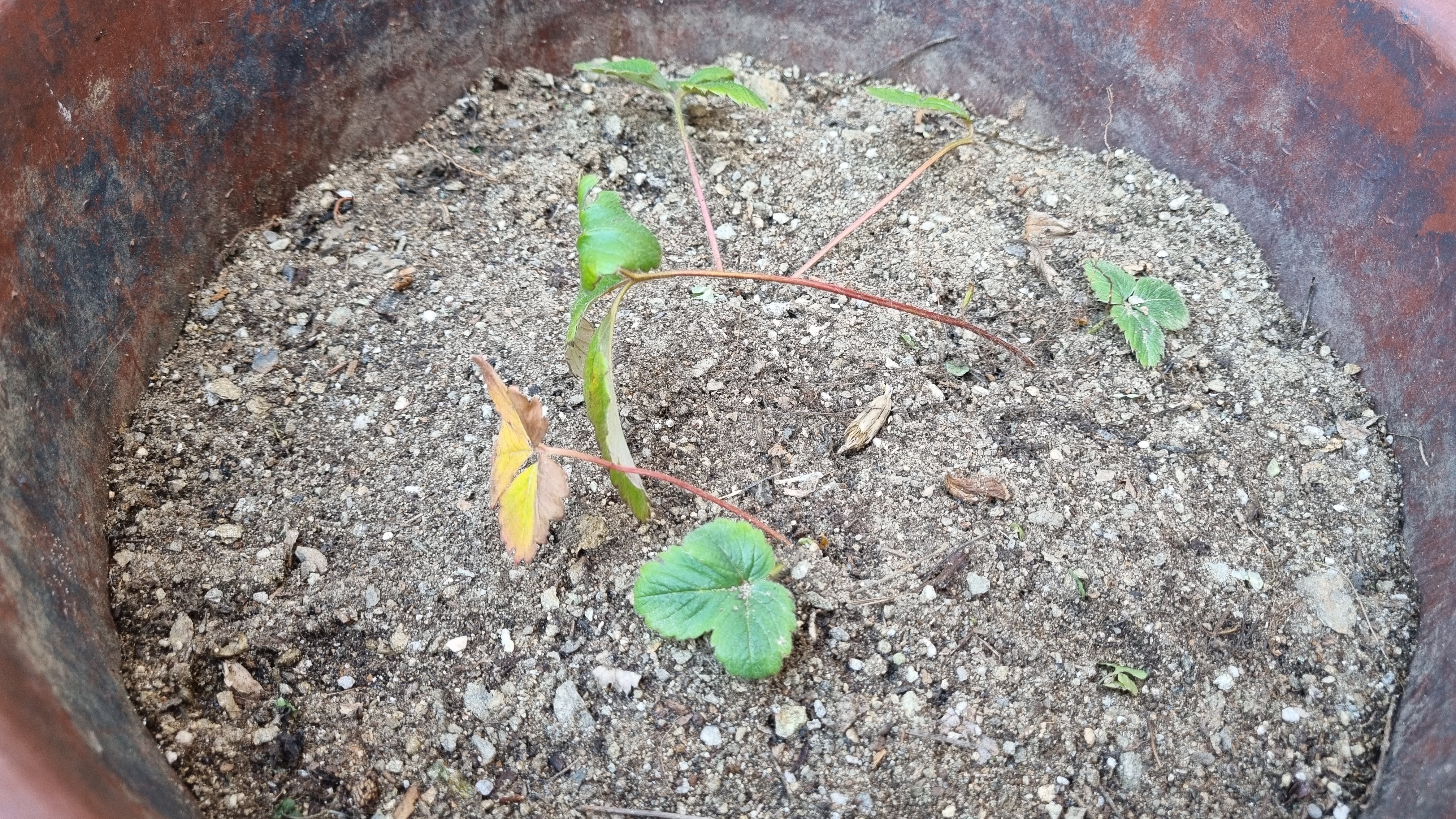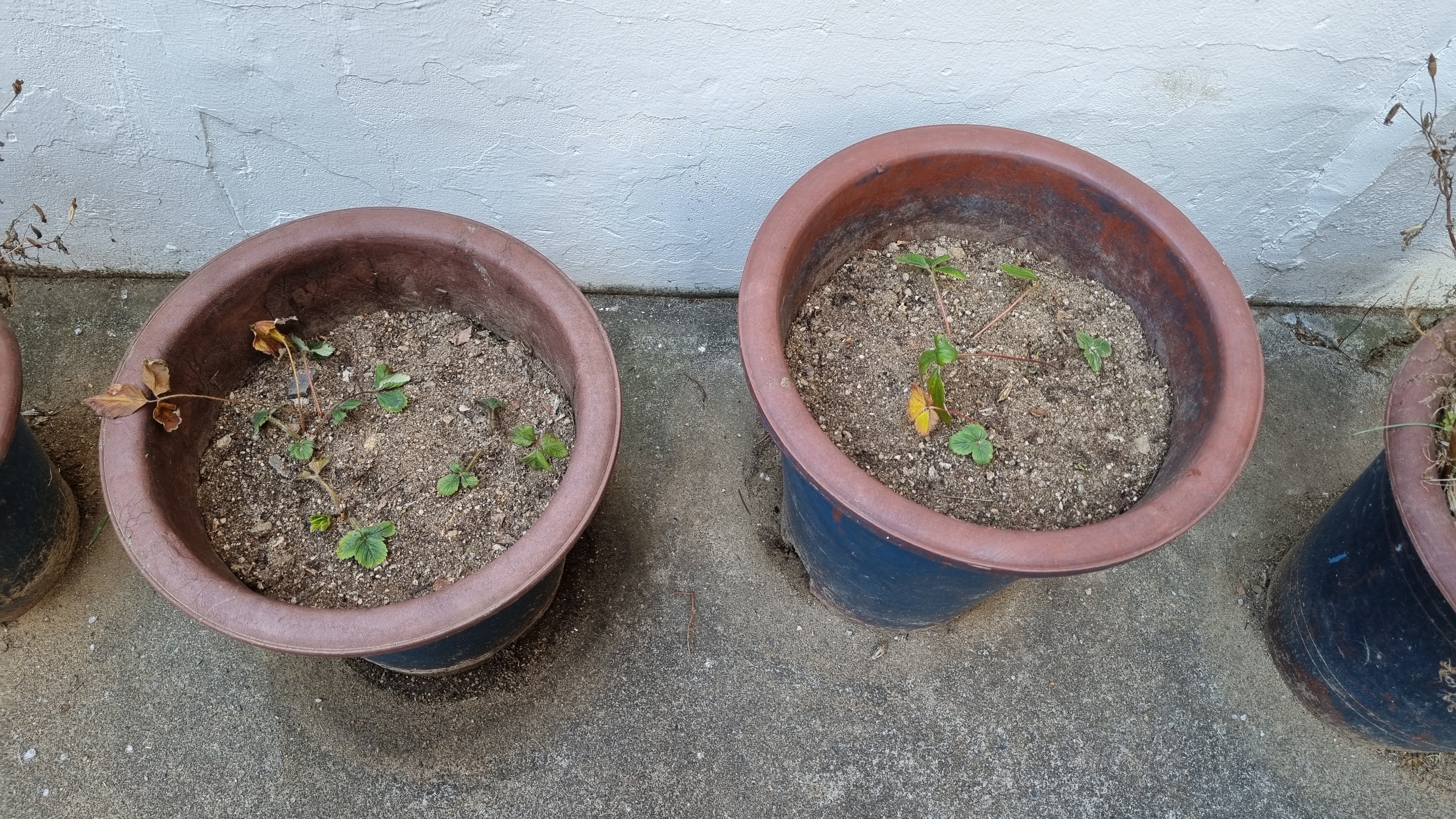 큰 화분 딸기예요. 흙도 딱딱하고 건조해 보여요. 이 큰 화분 딸기가 겨울을 잘 버티고 살 수 있을까요?