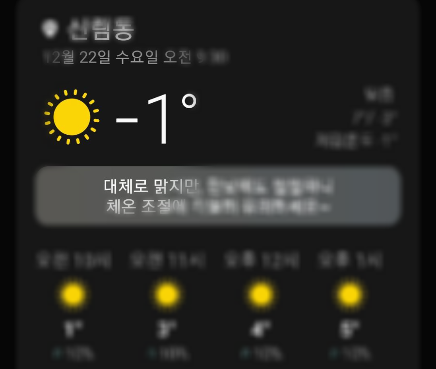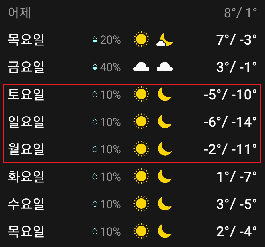 이번주 날씨를 확인했더니 참 좋아요. 비 소식도 없고 눈 소식도 없고 해가 둥둥 떠있어요. 하지만 이번주 주말 최저기온이 살인적이에요. -14 º.