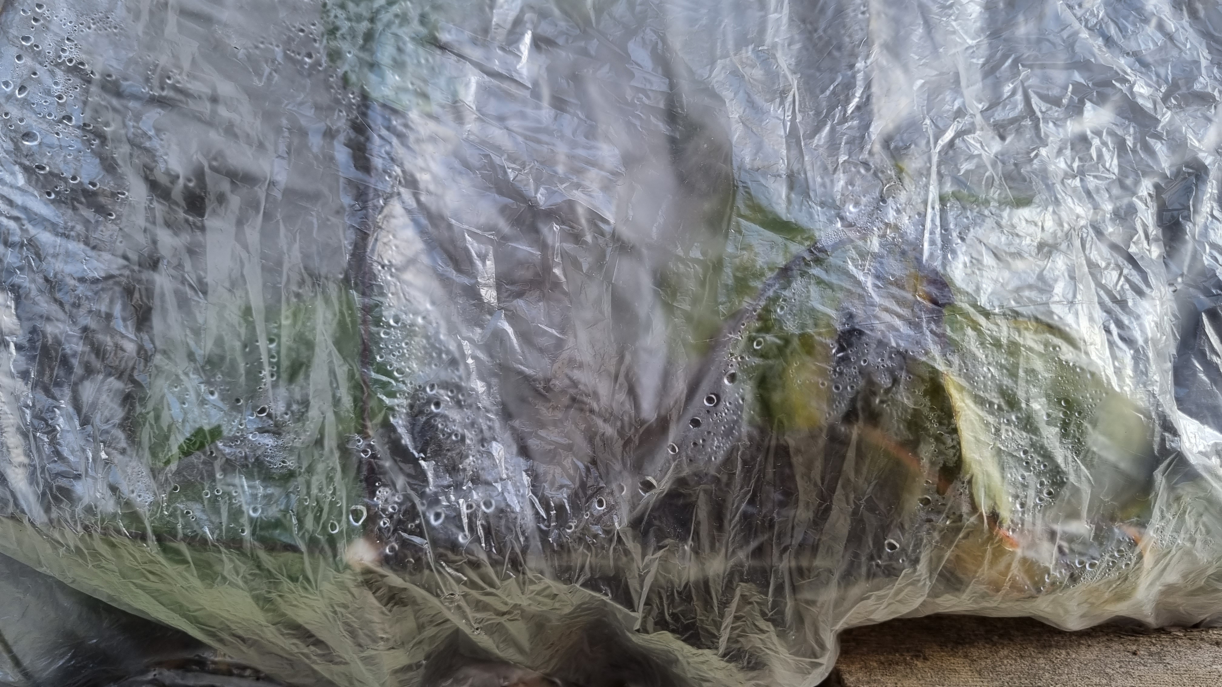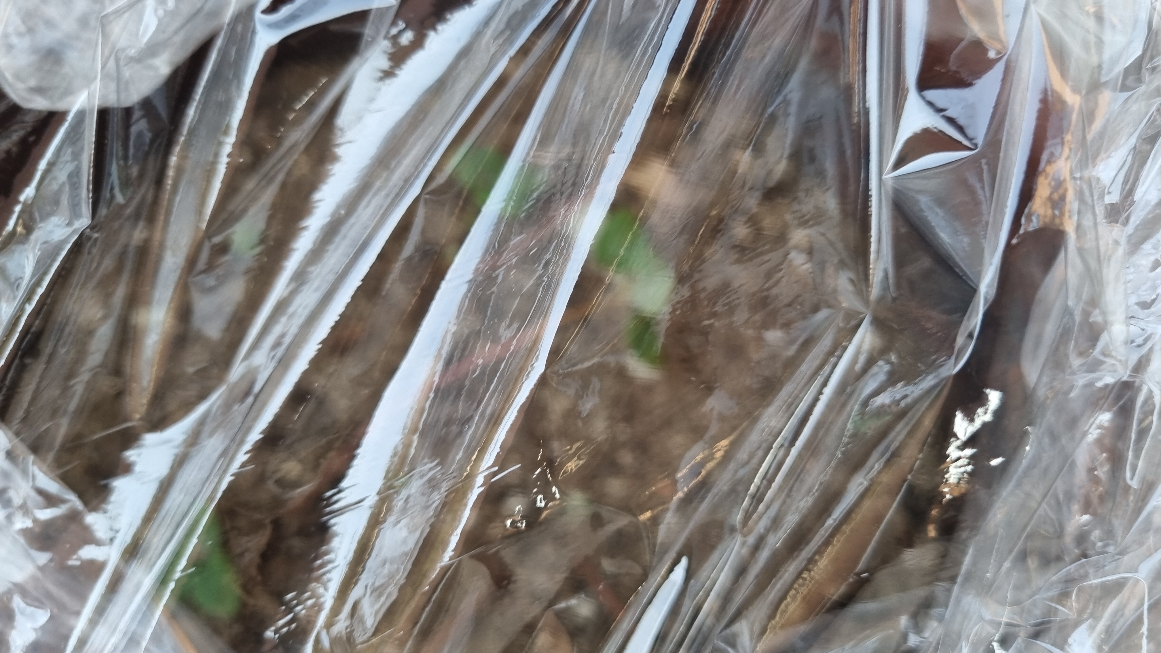 지난주에 비닐로 덮어서 보온한 킹스베리와 8번 딸기가 너무 궁금했어요. 비닐 안쪽으로 초록색의 딸기 잎들이 보여요. 비닐 안쪽에 물방울이 맺혀 있어요.