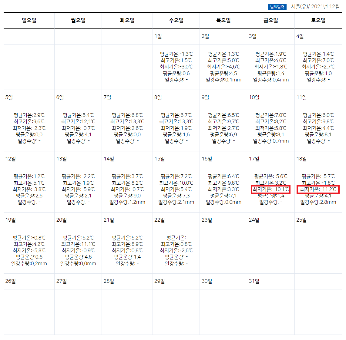 21년 12월 과거 관측 자료를 보면 최저기온이 -10º인 날이 종종 있어요. 딸기를 키우는데 -10 º 까지는 괜찮을 것이라 생각해요. 작년에도 그랬고 재작년에도 그랬고 분명 잘 버티고 살 수 있을 것 같아요.