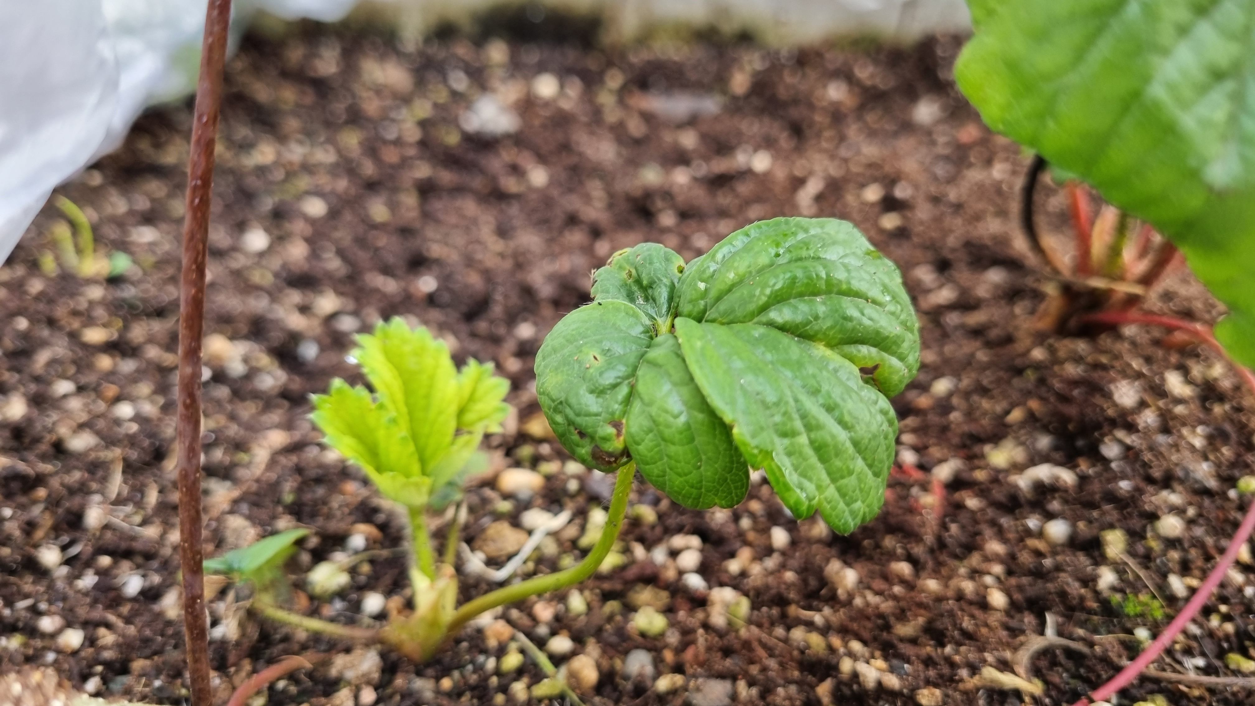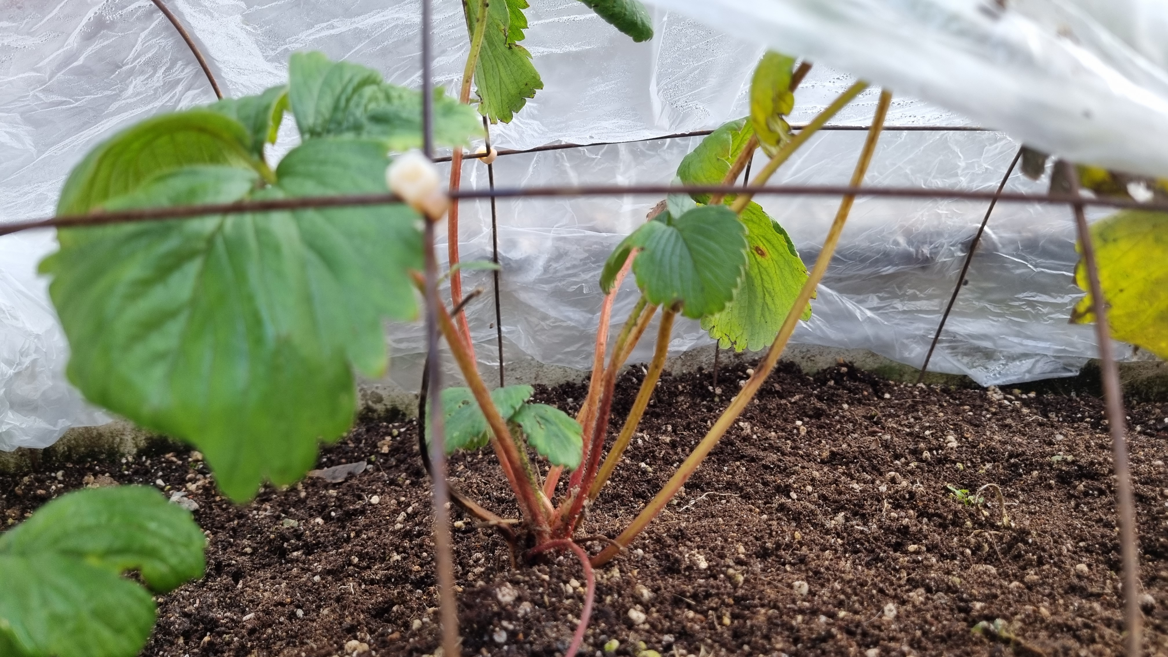 비닐하우스 안에 있는 딸기들이 너무 궁금해서 비닐을 안 들춰 볼 수가 없었어요. 비닐을 살짝 들어서 딸기들을 확인했어요. 위의 사진은 킹스베리 1번에서 나온 자식이에요. 죽지 않고 잘 자라고 있어요. 아마도 이번 겨울은 문제없이 살 수 있을 것 같아요. 그리고 고양이가 맨날 땅 파고 실례하고 갔는데 비닐을 덮어 두니까 고양이의 습격을 피할 수 있어서 너무 좋아요.