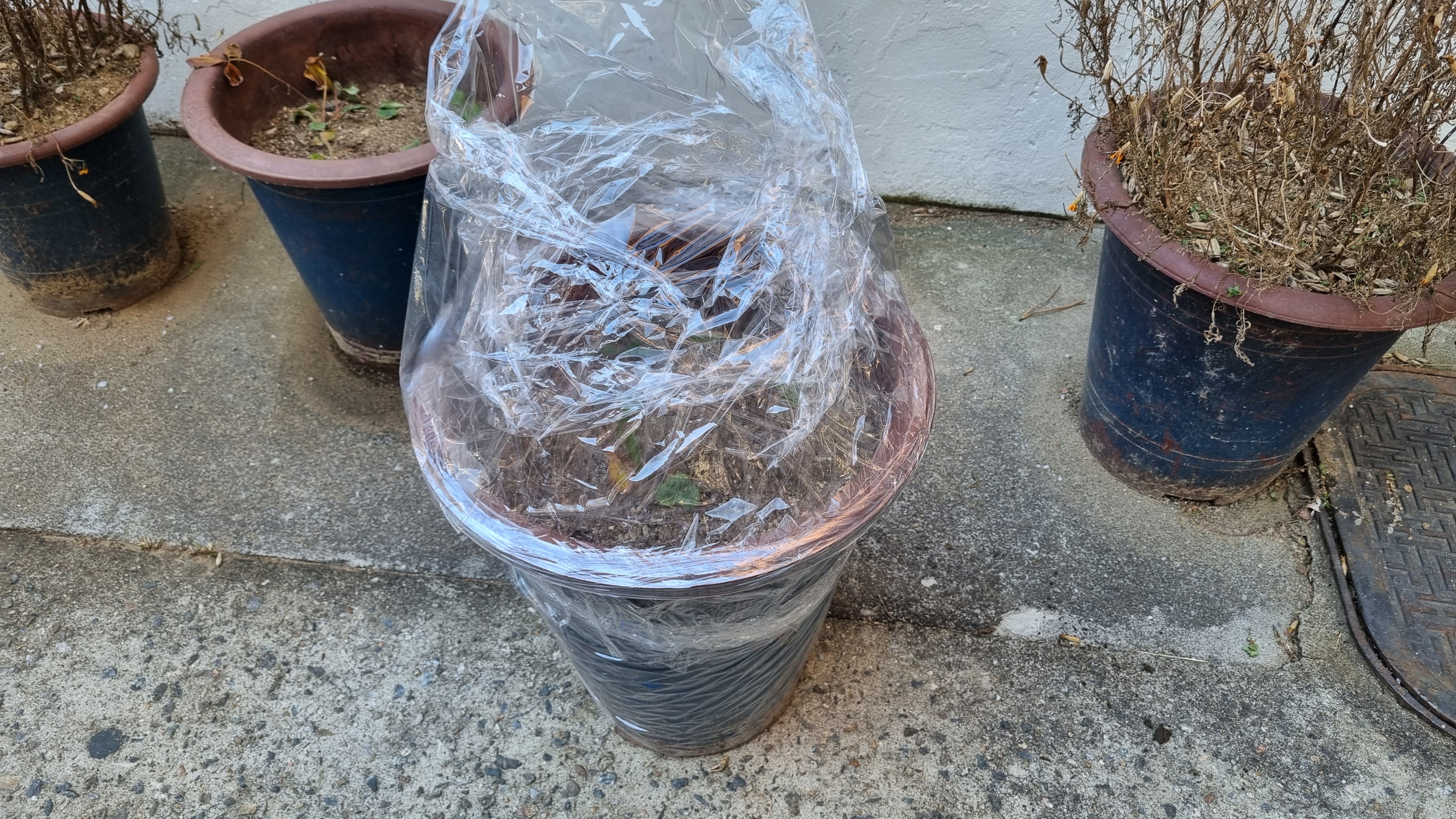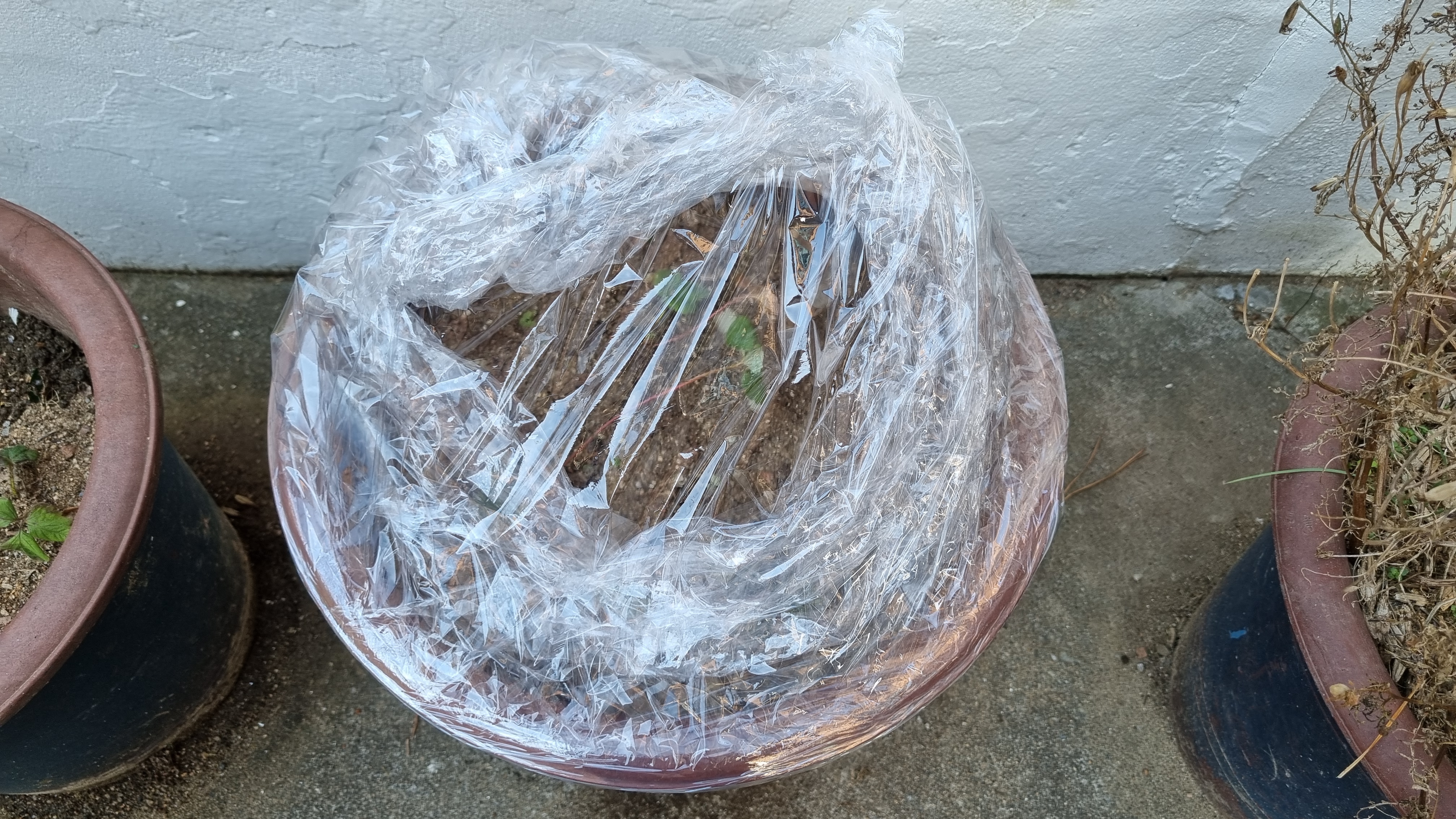 큰 화분 딸기를 보온해 주기 위해 랩으로 화분을 돌돌 말았어요.