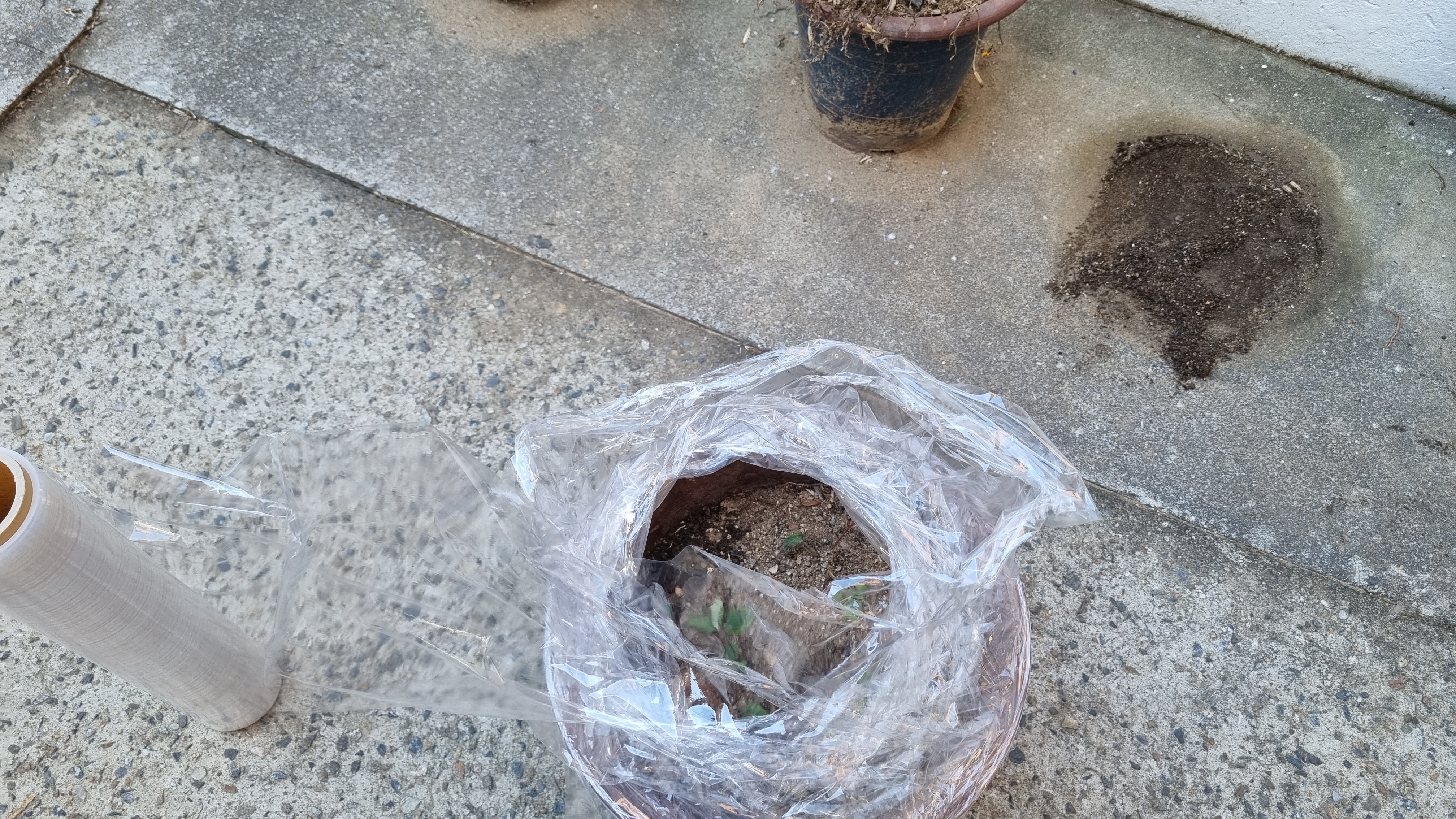 밖으로 나가기 전 위의 사진과 같은 아이템을 갖고 나갔어요. 랩이에요. 공업용 랩. 용량도 엄청 많고 크기도 커서 무거워요. 이사할 때 쓰고 남았어요. 사용할 일이 별로 없어서 버리려고 했는데 이번에 화분 보온하는데 요긴하게 썼어요.