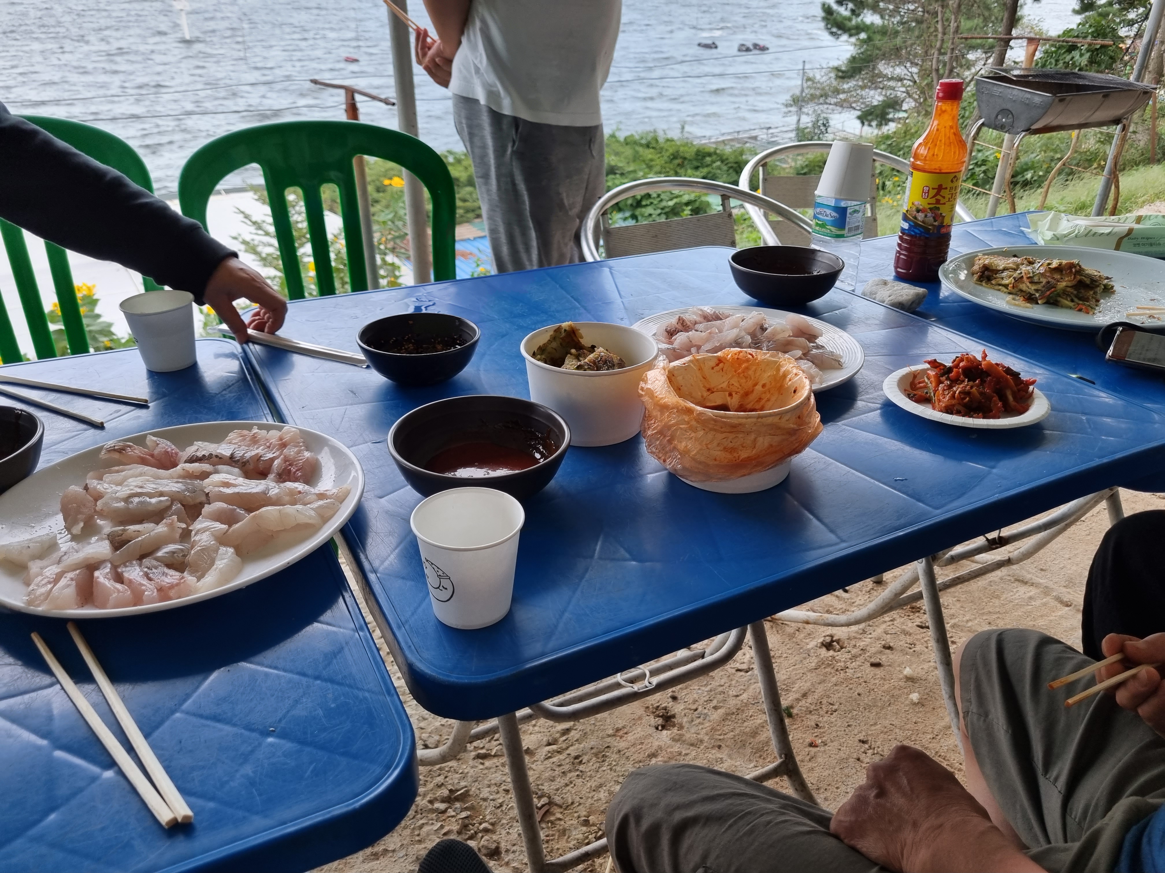 원주민 민박은 이렇게 방 앞에 마당 같은 공간이 있어요. 이 마당에 테이블을 펴고 바다를 바라보며 끼니를 해결했어요. 끼니만 해결한 게 아니고 알코올도 섭취하고 카페인도 섭취했어요. 저 위의 사진에서 회는 원주민 민박 사장님한테 샀어요. 원래 그물떼기를 하려고 했는데 요즘 고기 안 잡힌다고 사먹는게 싸다고 하셔서 샀어요. 1kg 3만원 정도 했던 거 같아요. 대목이라 그당시 수산 시장에서 4만~4만5천원 이었는데 싸게 먹었죠. 그리고 회 뜨는건 매점 사장님이 떠주시는데 1kg에 5천원 정도 했던거 같아요.