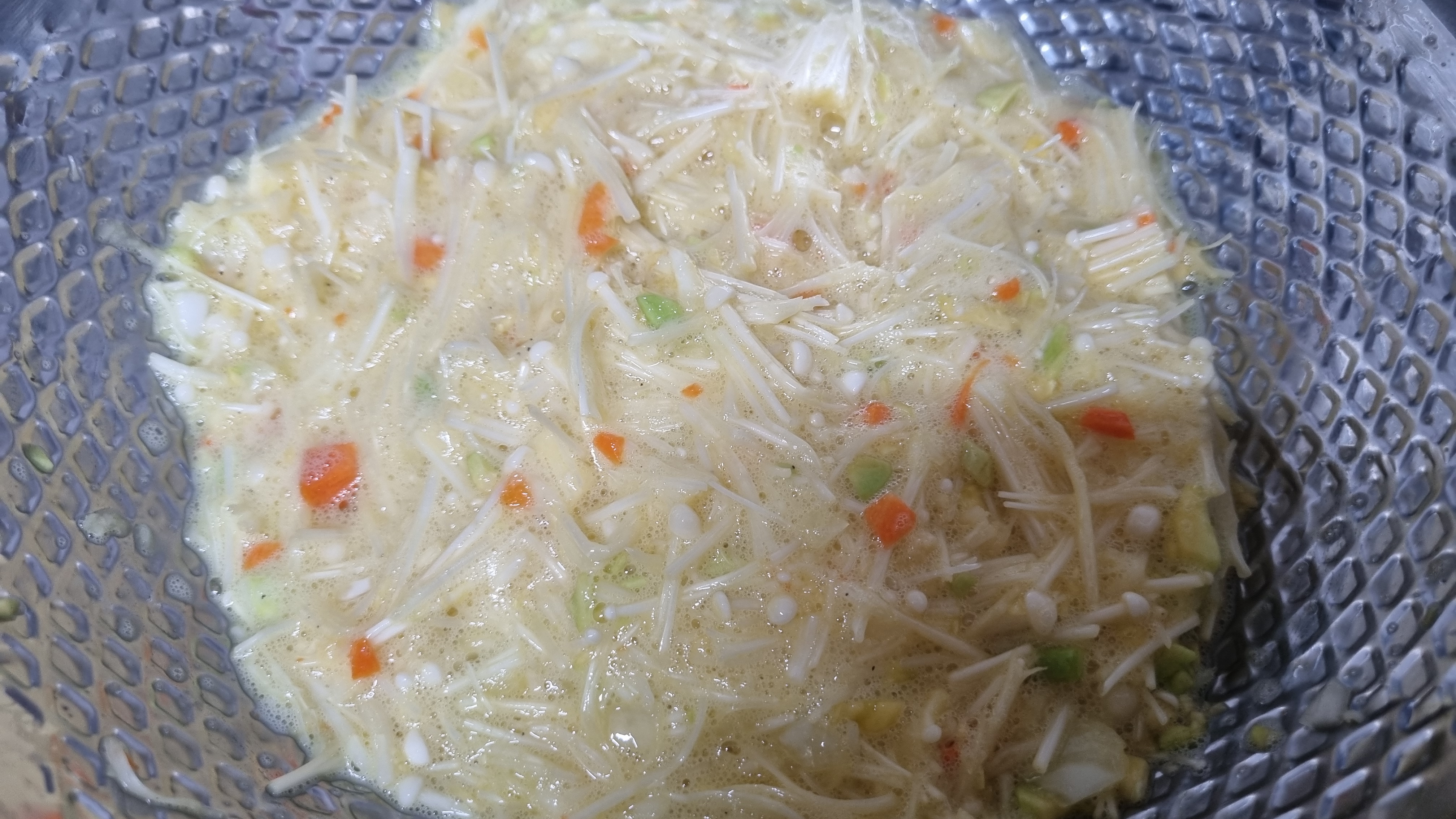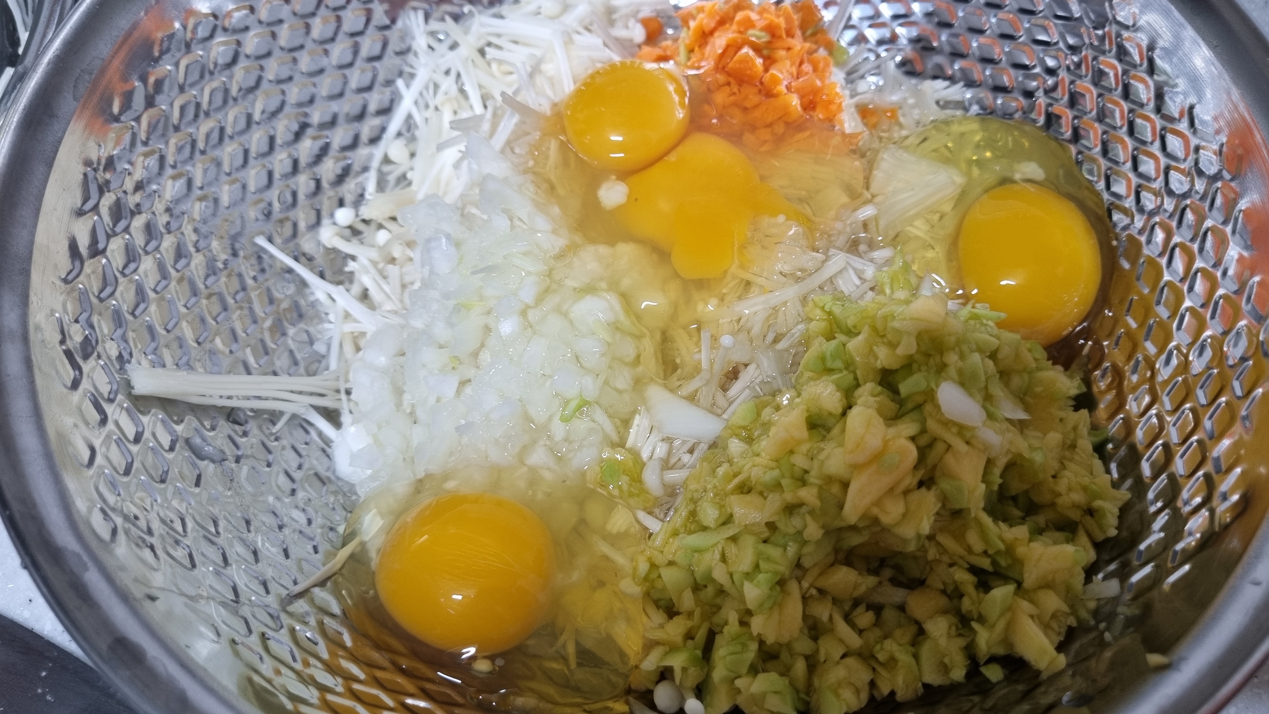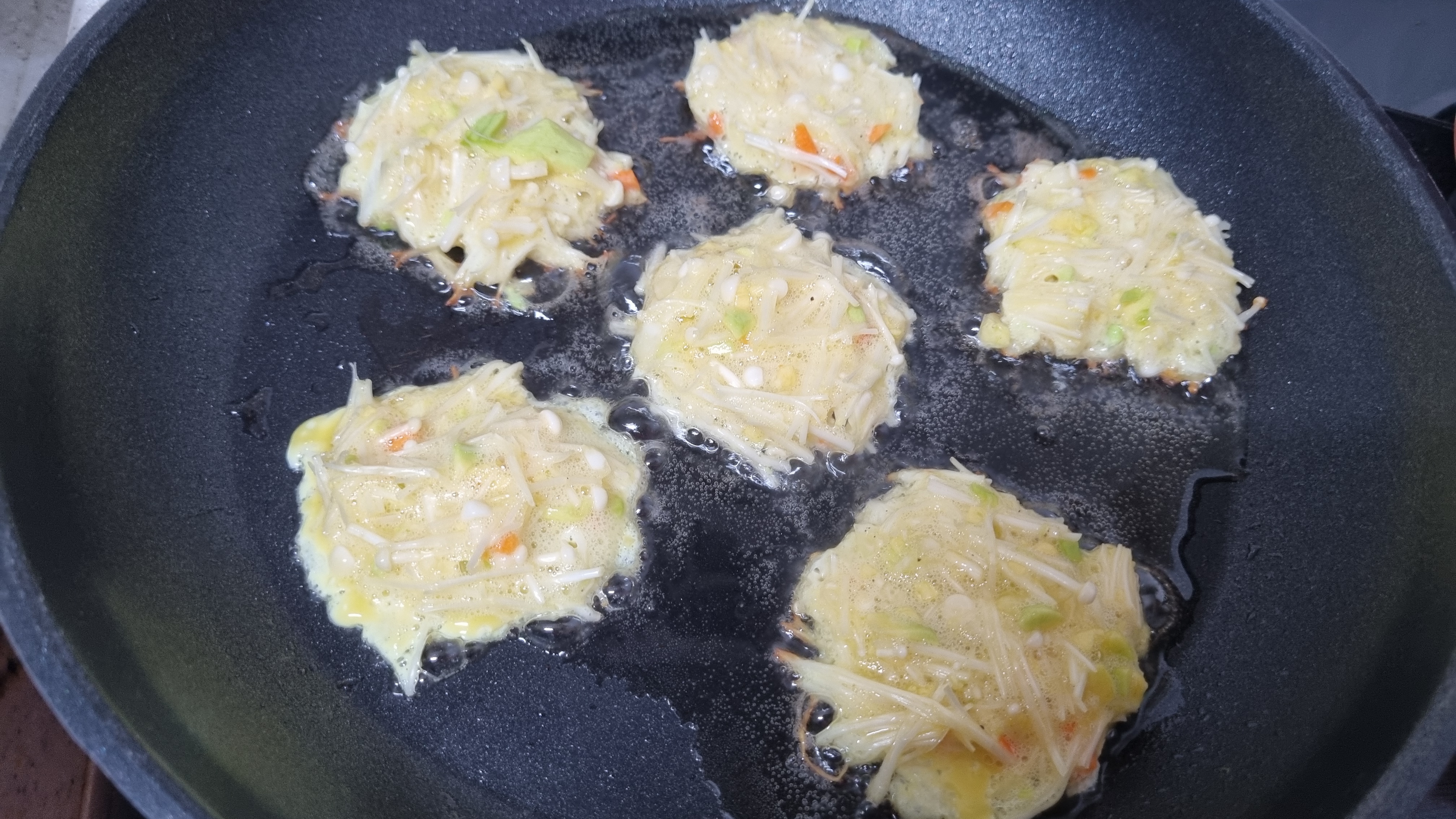 밀가루는 절대 사용하지 않아요. 밀가루 넣으면 맛이 없어요. 팽이버섯 식감도 다 죽어버려요. 밀가루를 넣지 않으면 부치기는 확실히 힘들어요. 뒤집을 때도 모양이 다 망가져요. 하지만 저는 맛을 선택했어요.