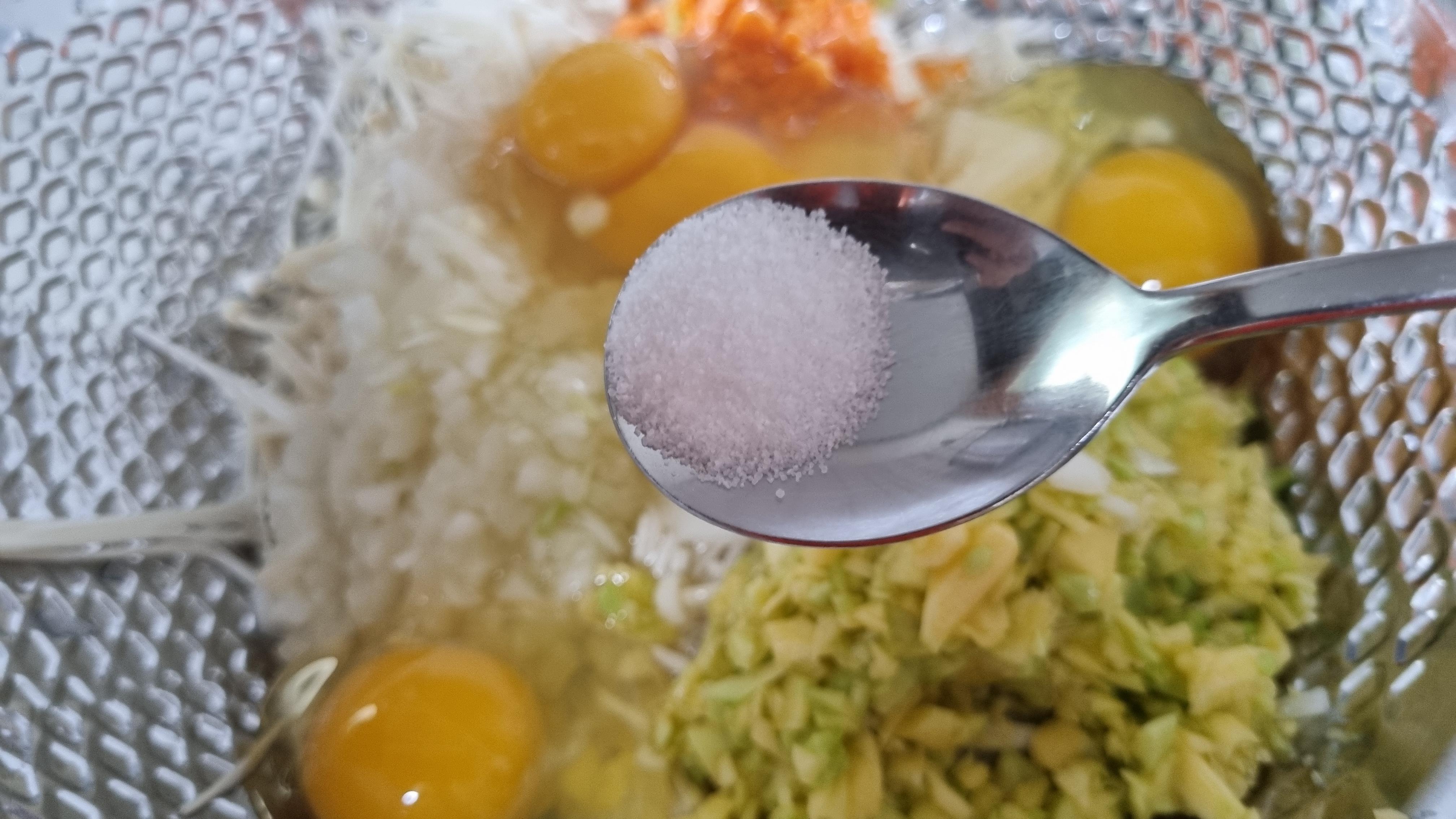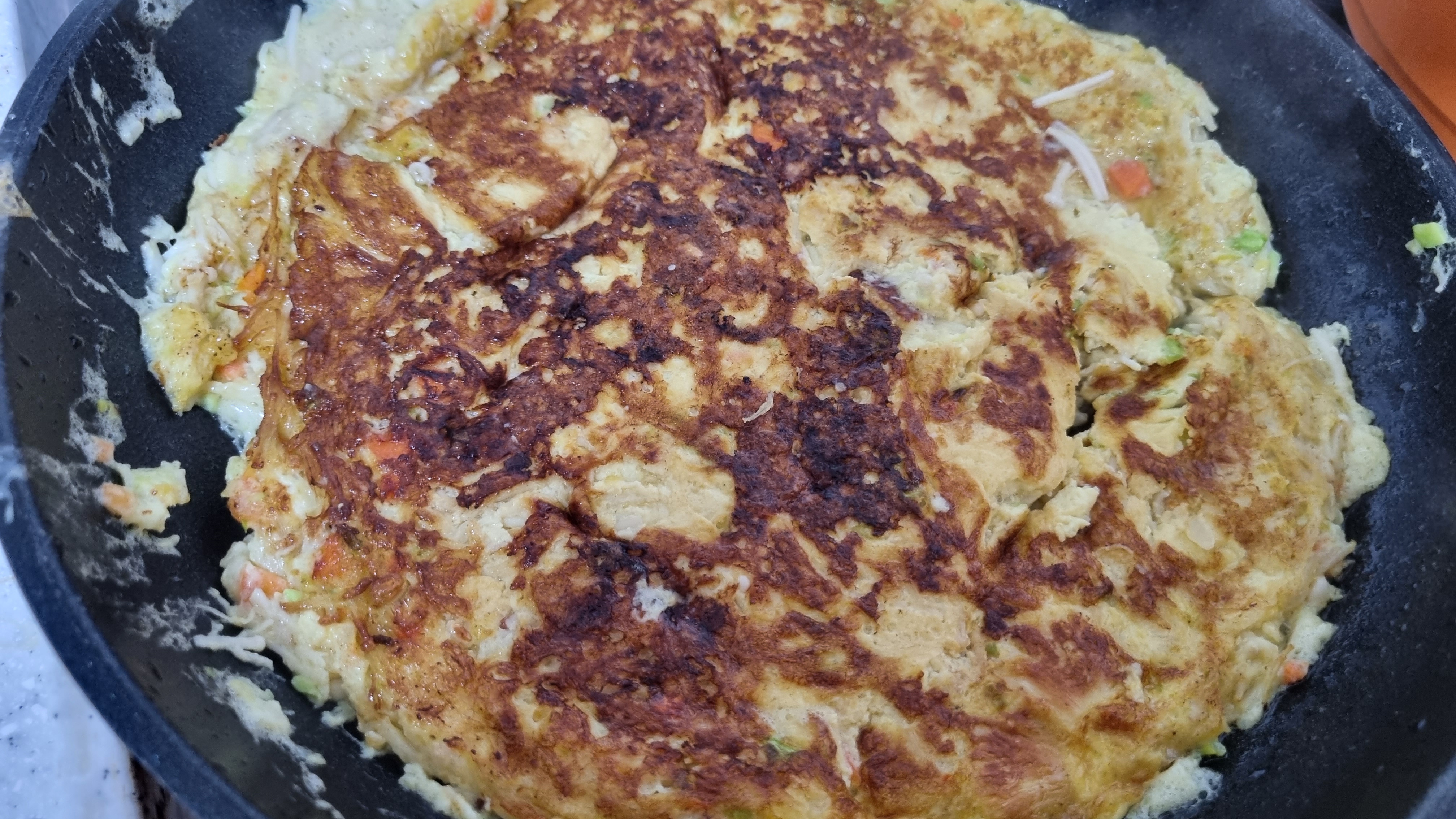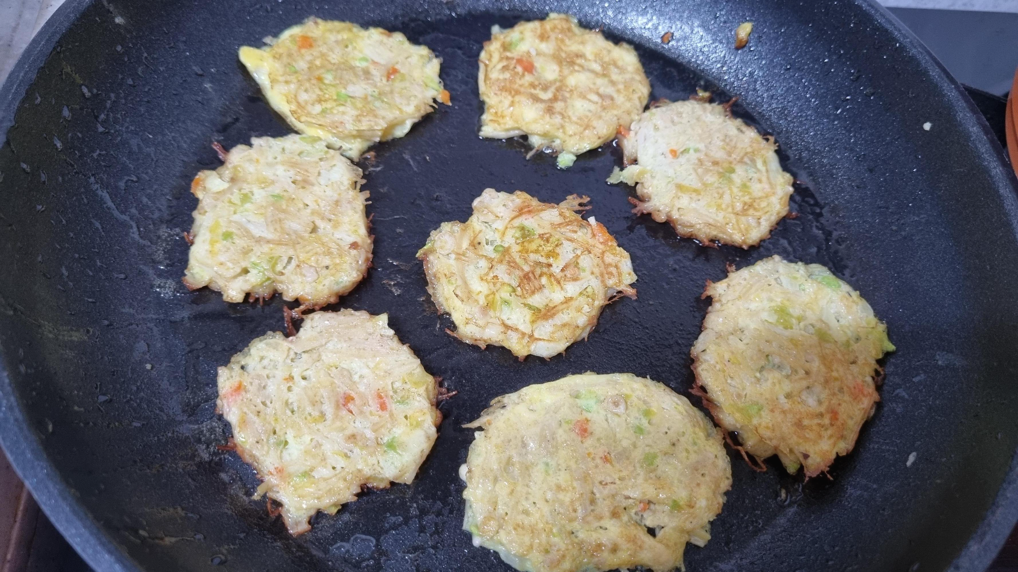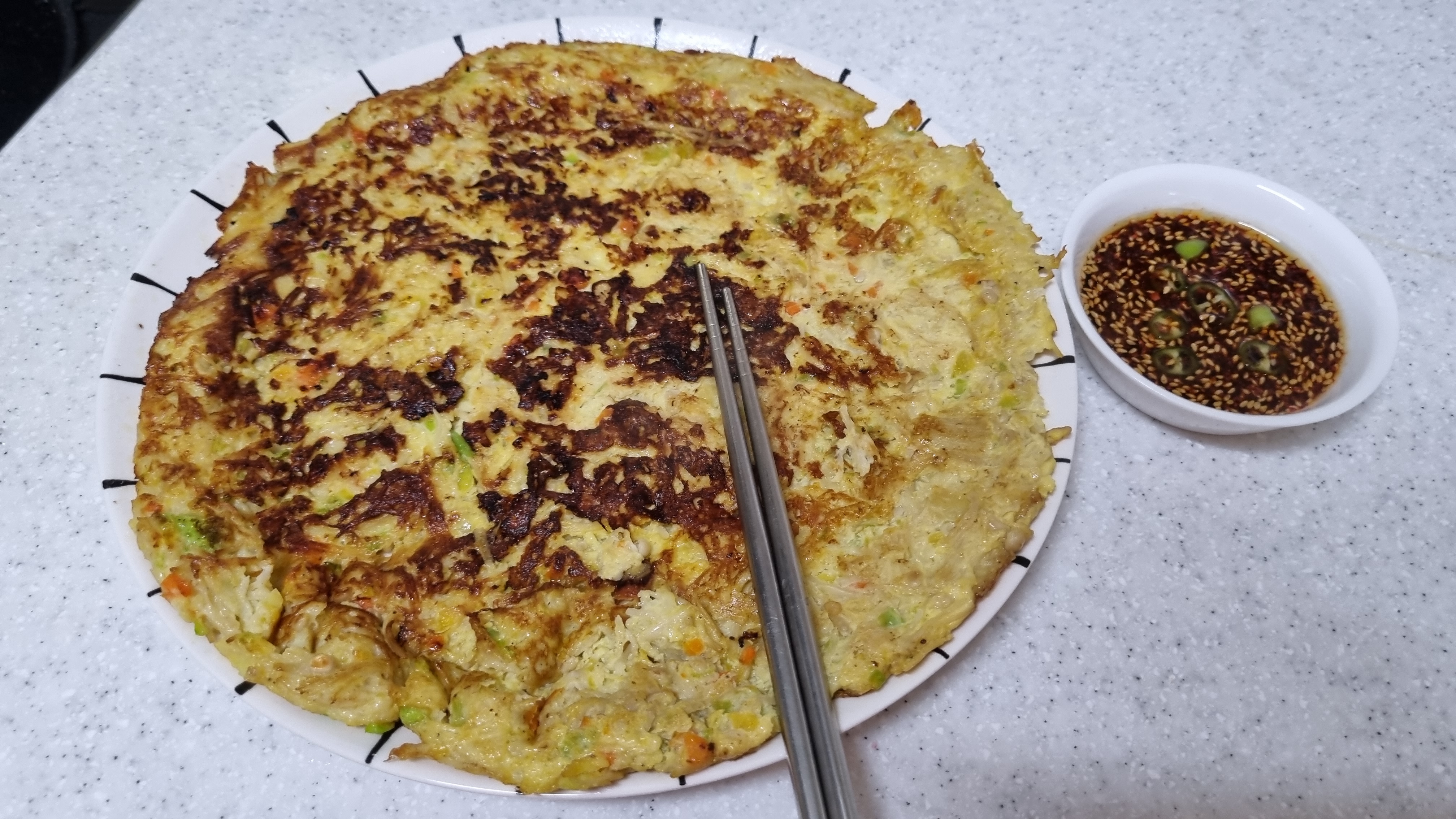 밀가루는 절대 사용하지 않아요. 밀가루 넣으면 맛이 없어요. 팽이버섯 식감도 다 죽어버려요. 밀가루를 넣지 않으면 부치기는 확실히 힘들어요. 뒤집을 때도 모양이 다 망가져요. 하지만 저는 맛을 선택했어요.