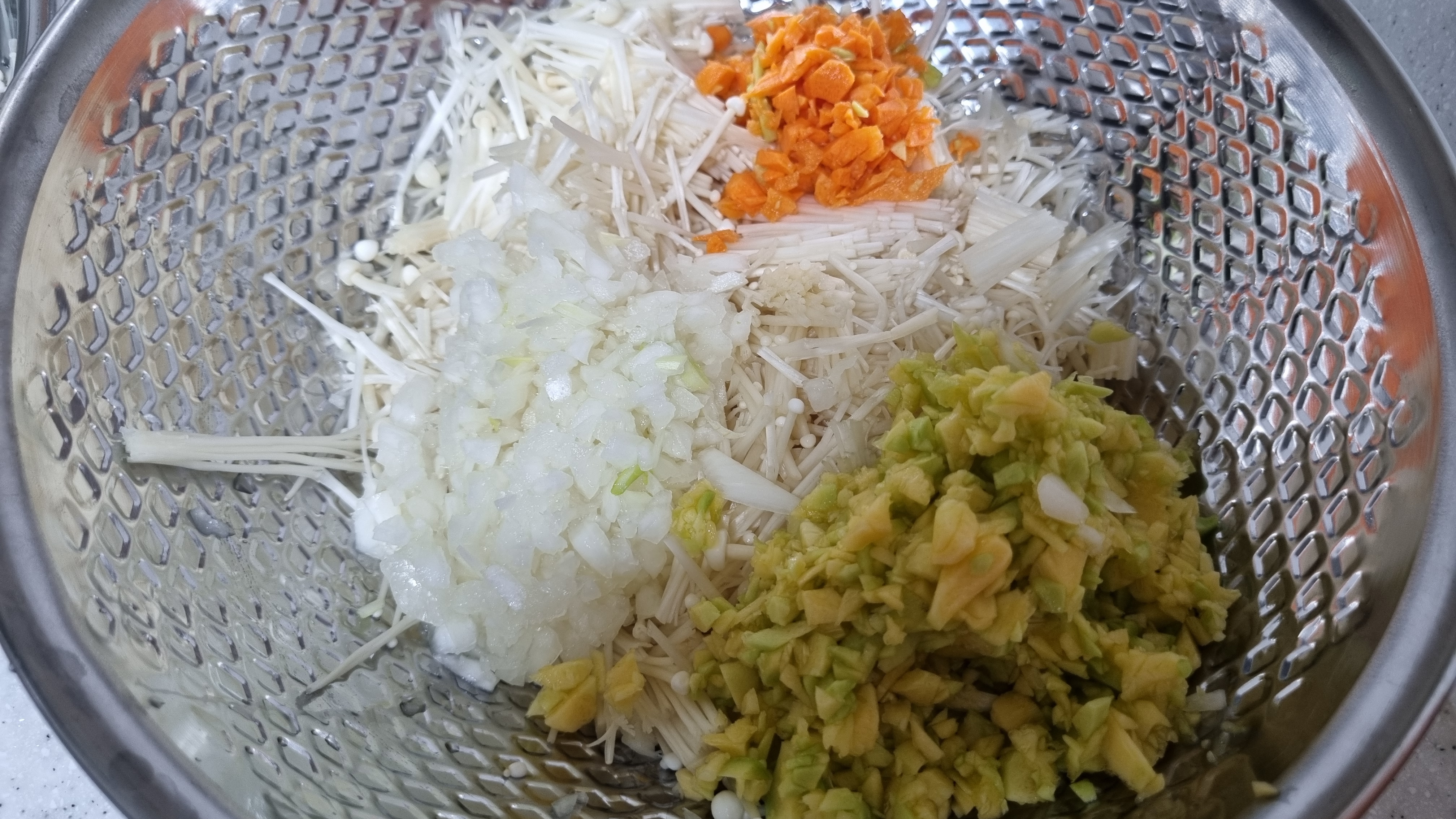 모든 야채들을 다져서 볼에 넣었어요. 팽이버섯은 다지지 않고 3cm 크기로 잘랐어요. 갑자기 당근이 어디서 나왔냐면 냉장고에서 나왔어요. 붉은색이 없어서 그냥 조금 넣었어요. 곰돌이 칼로 야채를 다지곤 하는데 전동 야채 다지기가 갖고 싶어요. 홈쇼핑에 나왔던 야채 다지기. 전동!!!