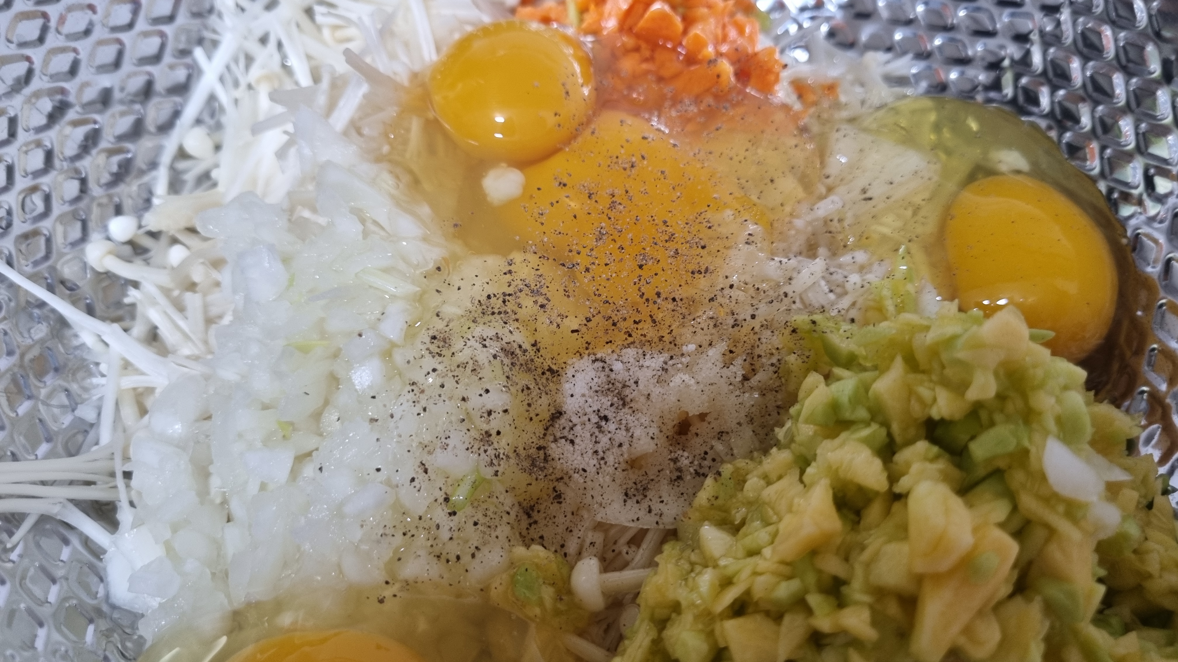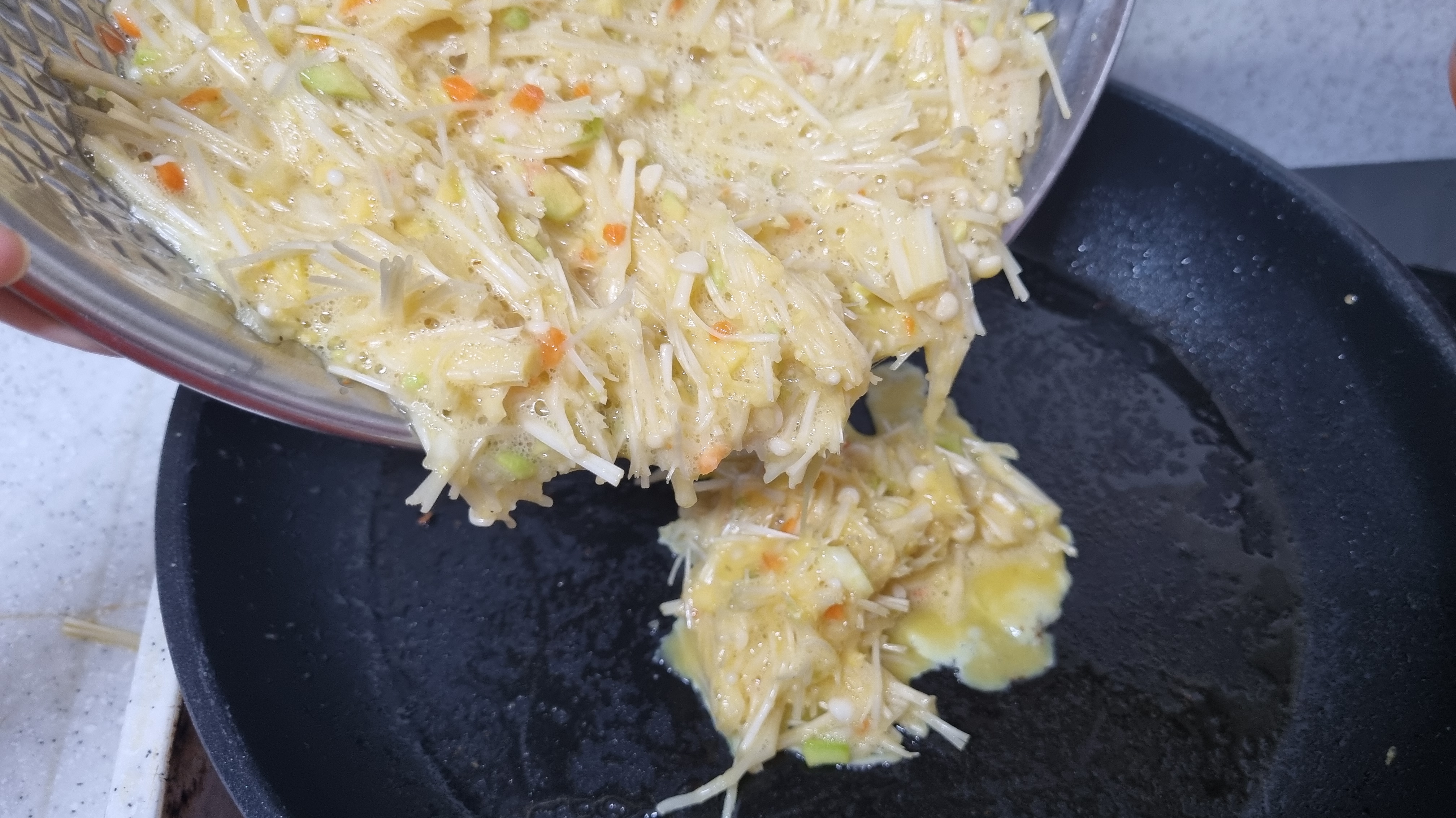 밀가루는 절대 사용하지 않아요. 밀가루 넣으면 맛이 없어요. 팽이버섯 식감도 다 죽어버려요. 밀가루를 넣지 않으면 부치기는 확실히 힘들어요. 뒤집을 때도 모양이 다 망가져요. 하지만 저는 맛을 선택했어요.
