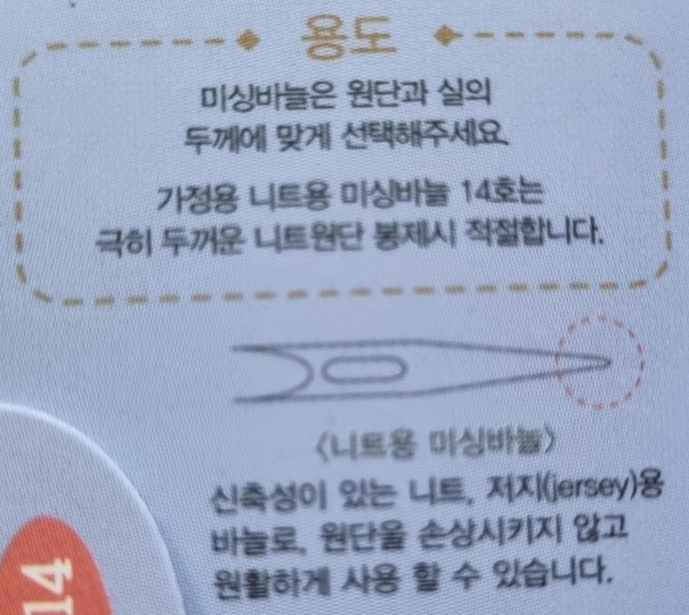 HAN 14 KN. 위의 사진은 니트용 바늘 14호예요. 극히 두꺼운 니트 원단 봉제 시 적절하다고 나왔어요. 역시나 극히 두꺼운 니트용 원단을 아직 봉제해 보지 못했어요.