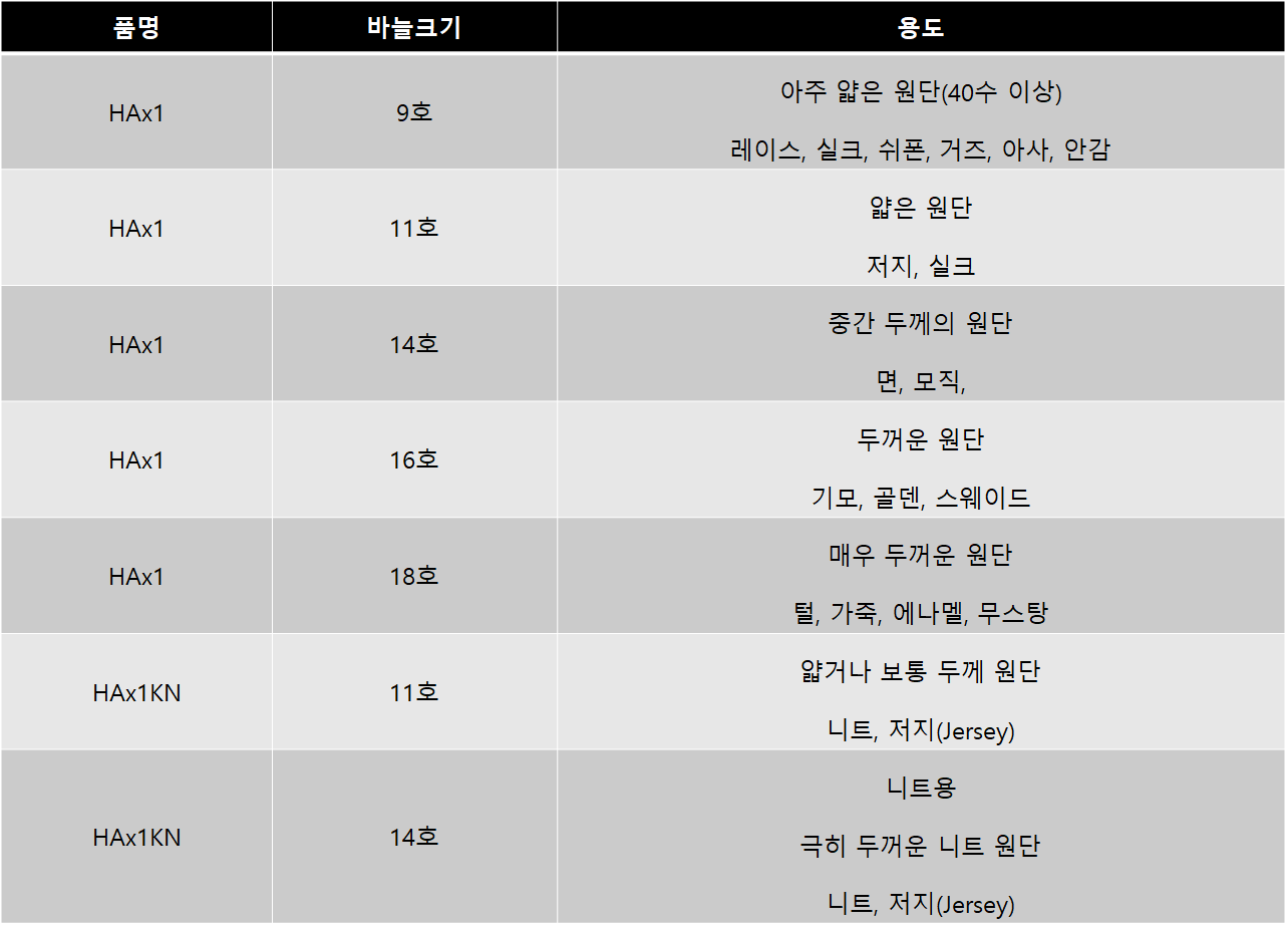 가정용 미싱 바늘은 품명이 H로 시작해요. 공업용 바늘은 D로 시작하고.