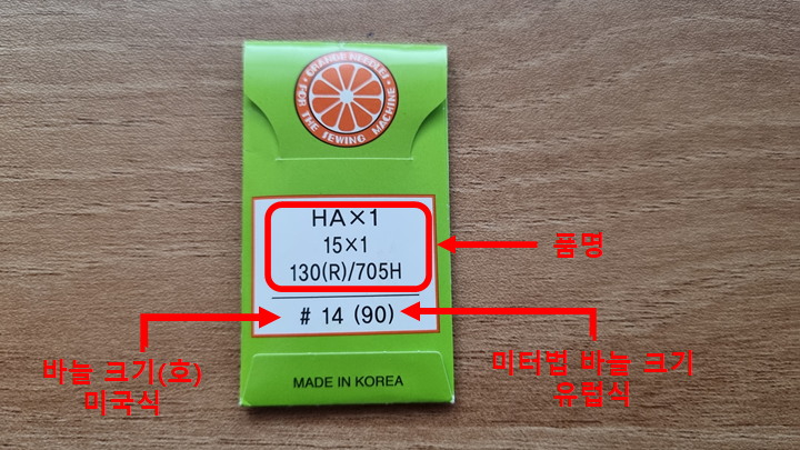 고작 미싱 바늘인데 해석할 수 없는 숫자들이 있어요. HAx1, 15x1, 130R, 705H, 130R/705H는 품명을 나타내는 말로 모두 같은 뜻이라고 하네요. 바늘 파는 해외 사이트에서 본 내용이에요. 품명의 저 숫자와 문자가 무엇을 가리키는지는 잘 모르겠어요. 중요한 건 바늘의 크기예요. 미국식으로 나타낸 바늘 크기.
