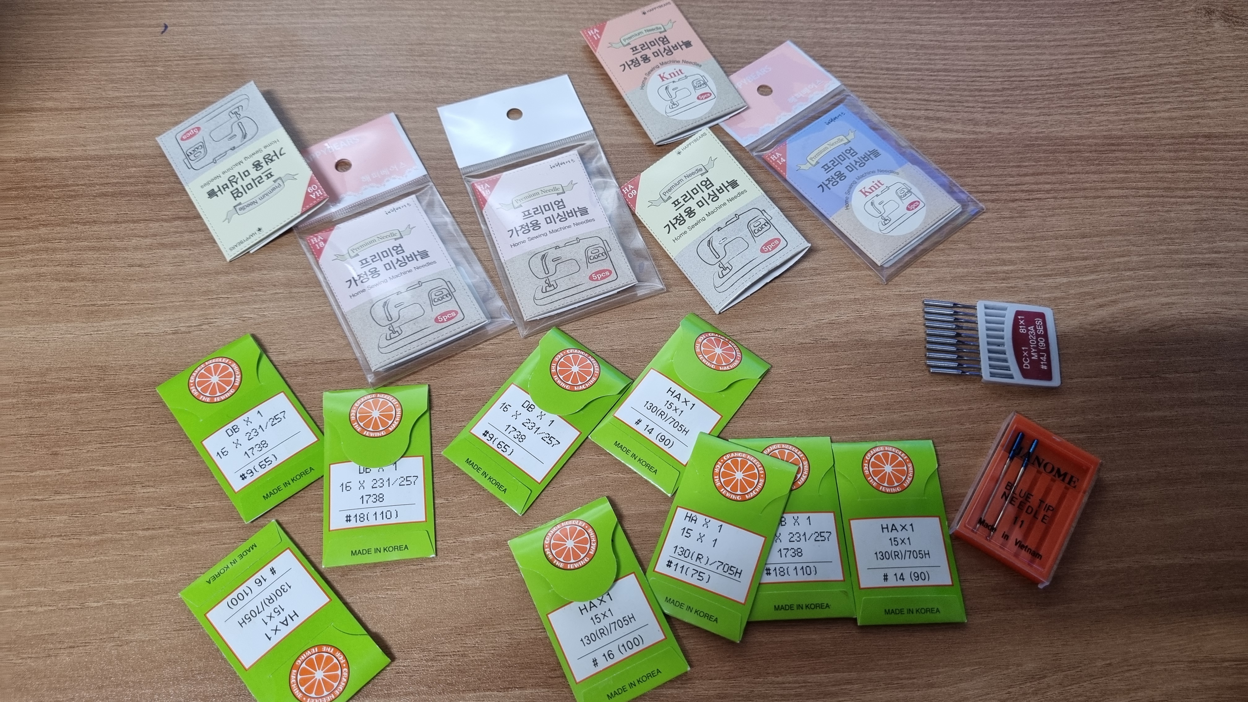 처음엔 원단에 맞는 바늘을 선택하는 방법도 몰랐고 바늘의 종류가 이렇게 많은지도 몰랐어요. 시간이 흐르고 익숙해지니깐 대충 몇 호 바늘을 써야 되는지 감이 잡히는 것 같아요. 그리고 저는 신축성이 강한 니트, 다이마루, 스판, 저지는 무조건 니트용 바늘을 사용해요. 그래야 땀도 뜨지 않고 바늘땀도 예뻐요. 다른 미싱은 어떤지 모르겠는데 저의 혼스 미싱은 니트용 바늘이 아니면 옷을 만들 수 없어요.