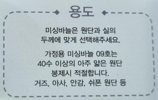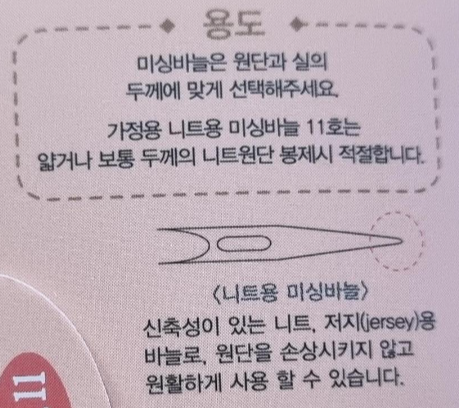 HA 9. 위의 사진은 9호 바늘의 용도예요. 아주 얇은 천에 사용할 수 있는 바늘이에요. 거즈, 시폰, 레이스, 망사, 아사 등등. 이 바늘을 왜 샀는지 잘 모르겠는데 아무튼 재봉이 잘 안 돼서 바늘을 바꾸려고 이것저것 샀던 거 같아요. 하지만 이 바늘은 너무 얇아서 사용할 일이 별로 없어요.