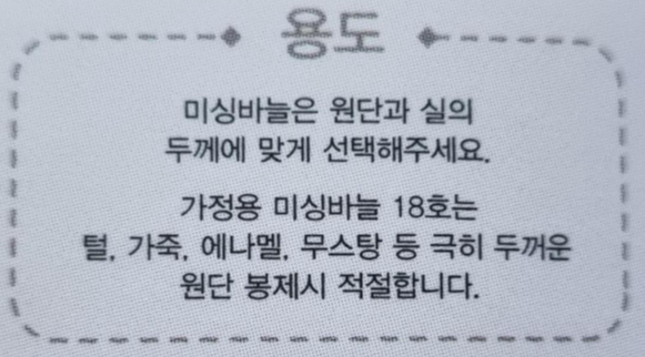 HA 18. 위의 사진은 18호 바늘 용도예요. 털, 가죽, 무스탕 등 극히 두꺼운 원단 봉제 시 적절하다고 쓰여있어요. 저는 아직 미싱 초보라 저런 두꺼운 원단은 사용하지 못해요. 역시 이것도 사용할 일이 없어요.