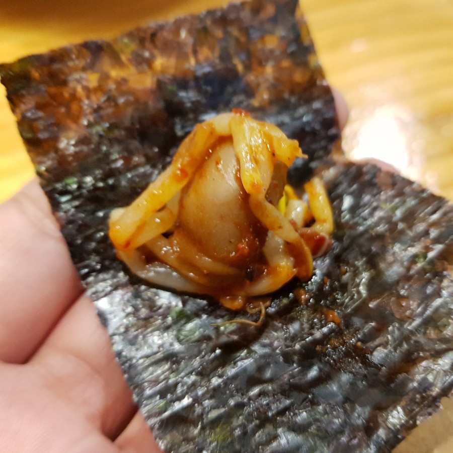 약간 비린맛이 있다. 단무지가 들어가 있어서 그런지 짭쪼름하며 약간의 단맛이 느껴진다. 알쌈에 쭈꾸미와 알밥을 넣고 싸 먹으면 매운맛도 줄어들고 포만감도 느껴진다.