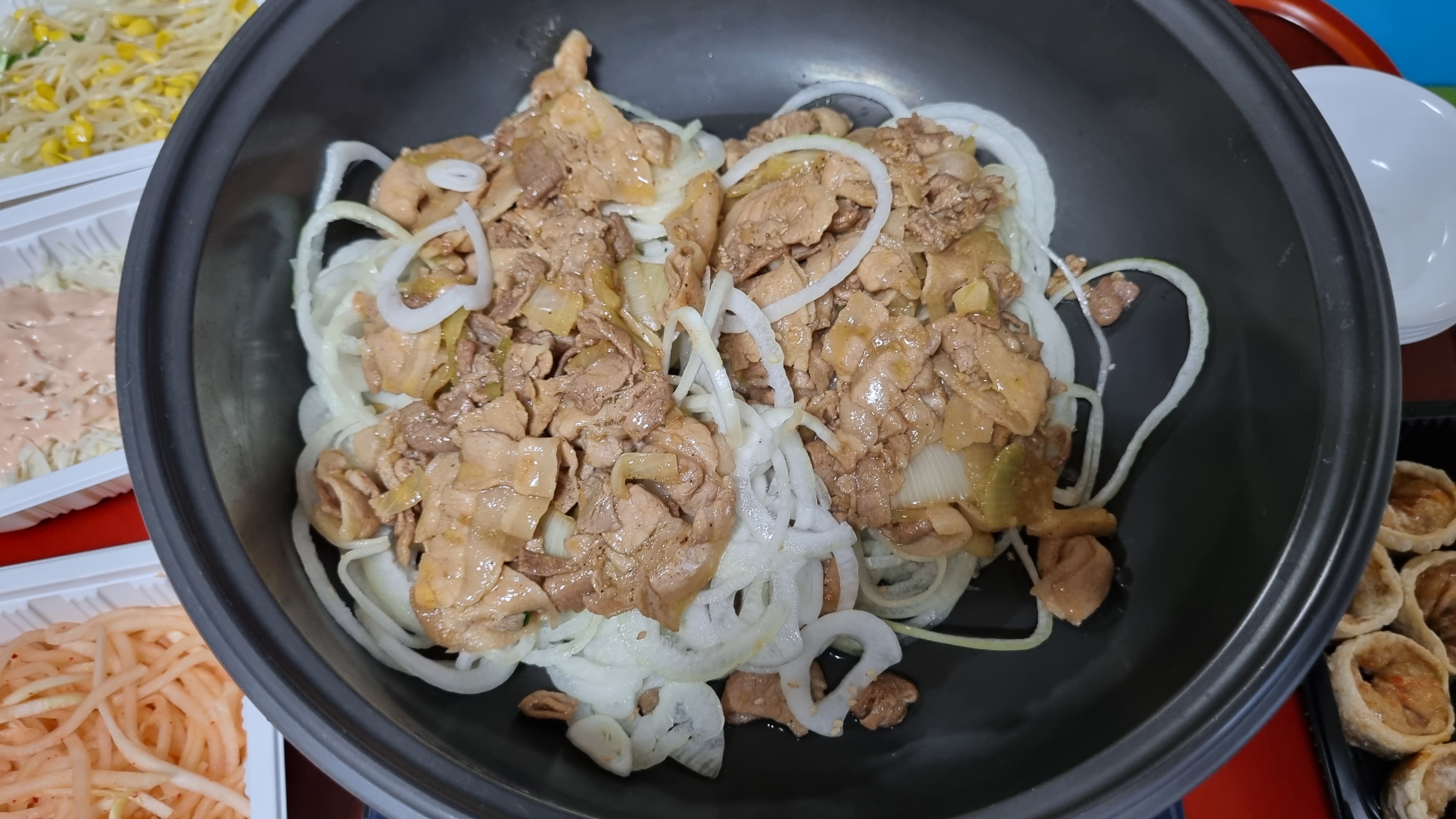 삽겹살도 따로 포장되어 왔는데 사진을 못 찍었어요. 볶으면서 먹으려고 전골 냄비에 삼겹살 부었어요.