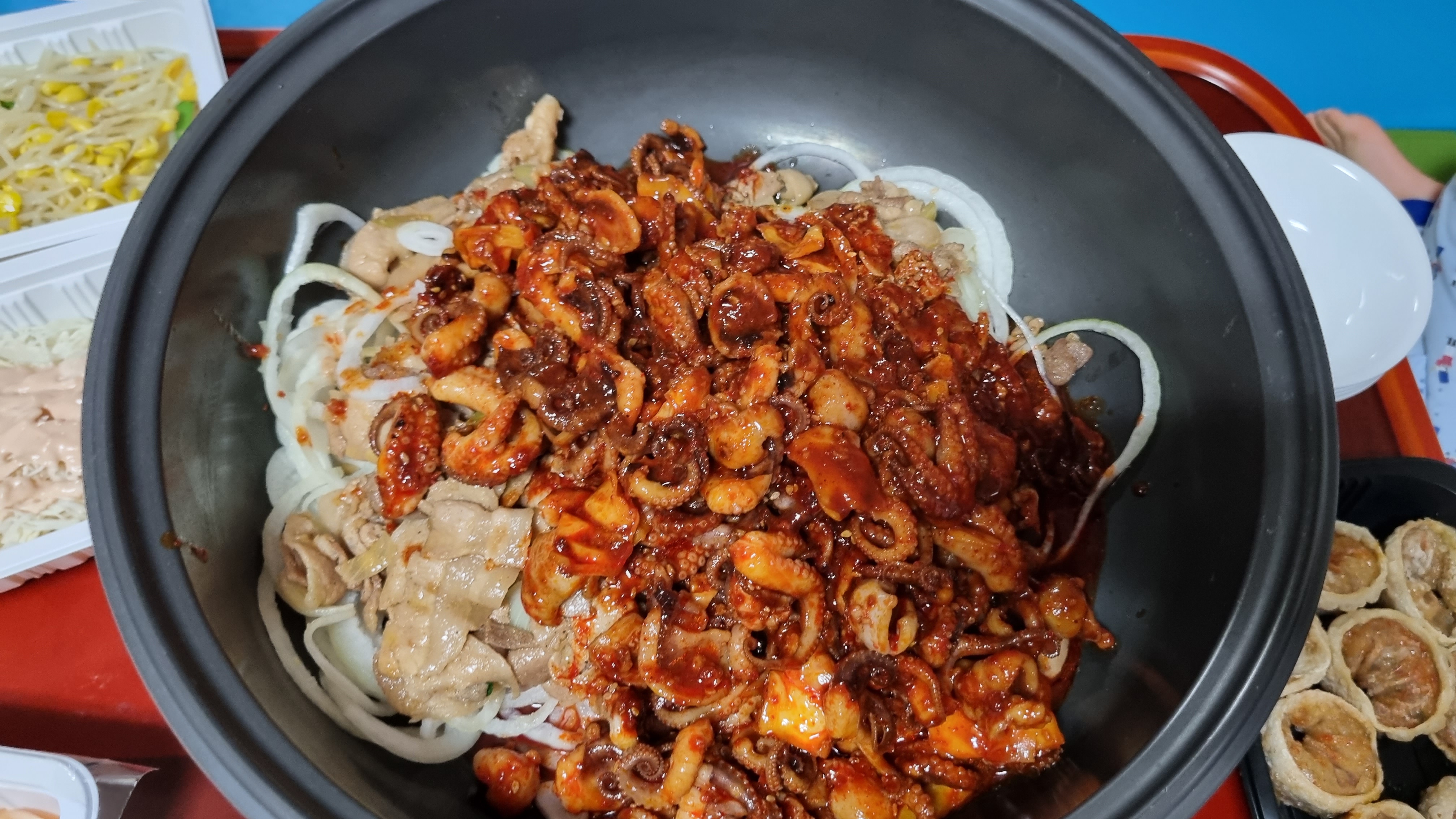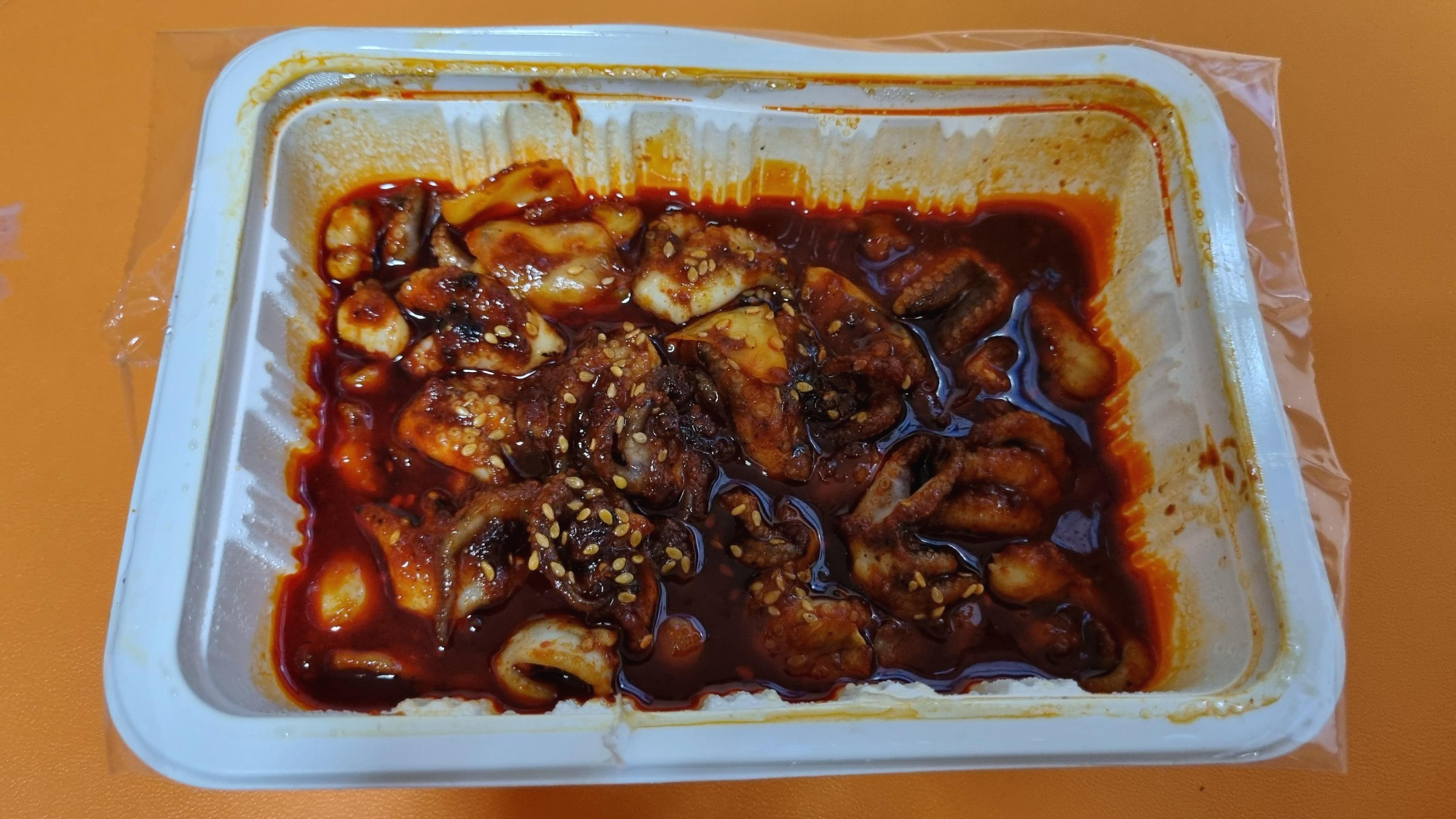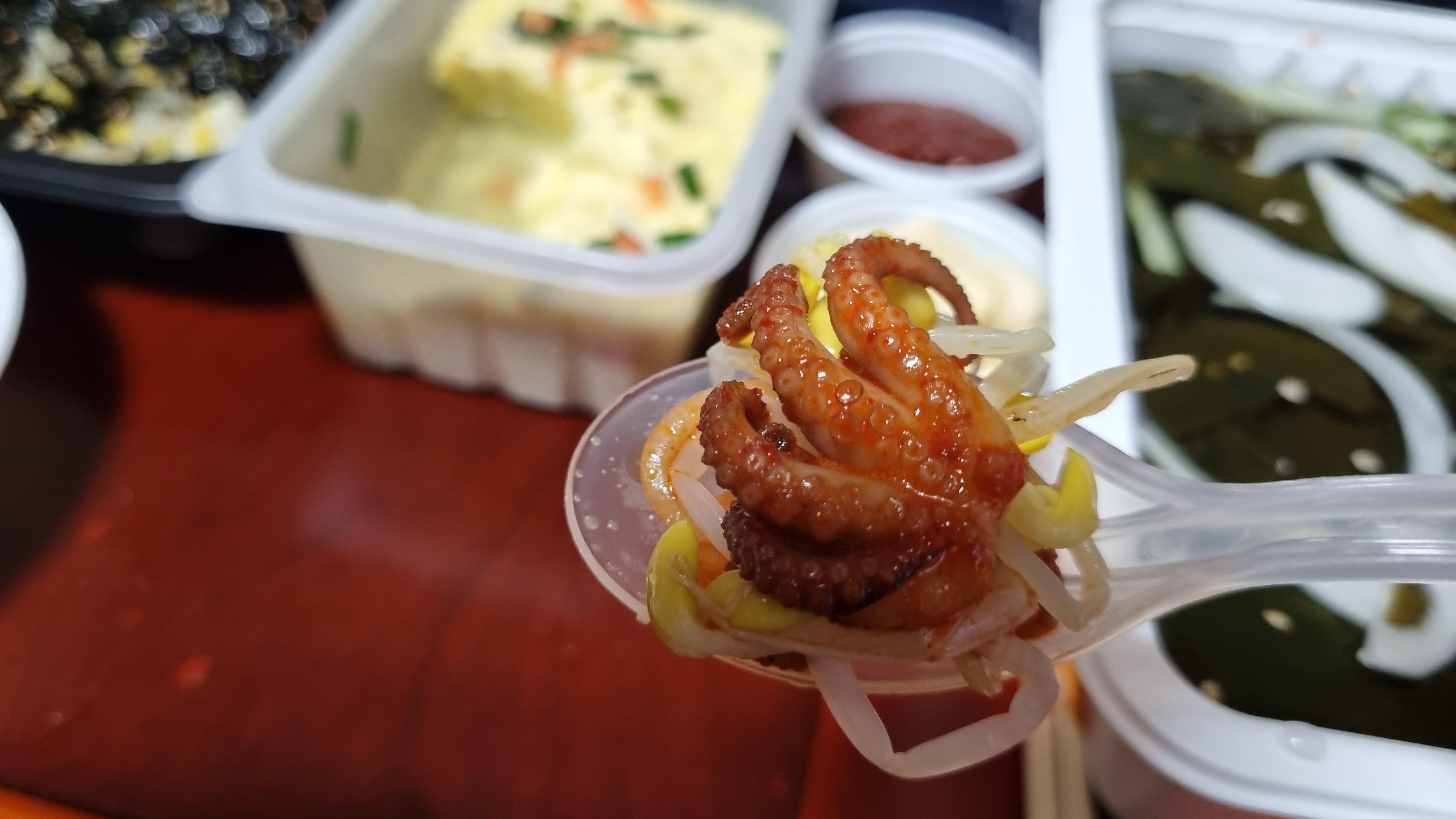 드디어 메인이에요. 쭈꾸미 볶음. 따뜻하게 볶아져서 왔어요. 포장을 뜯자 마자 매운 냄새가 확~ 났어요. 나이스~ 맵찔이도 매운거 좋아해요.