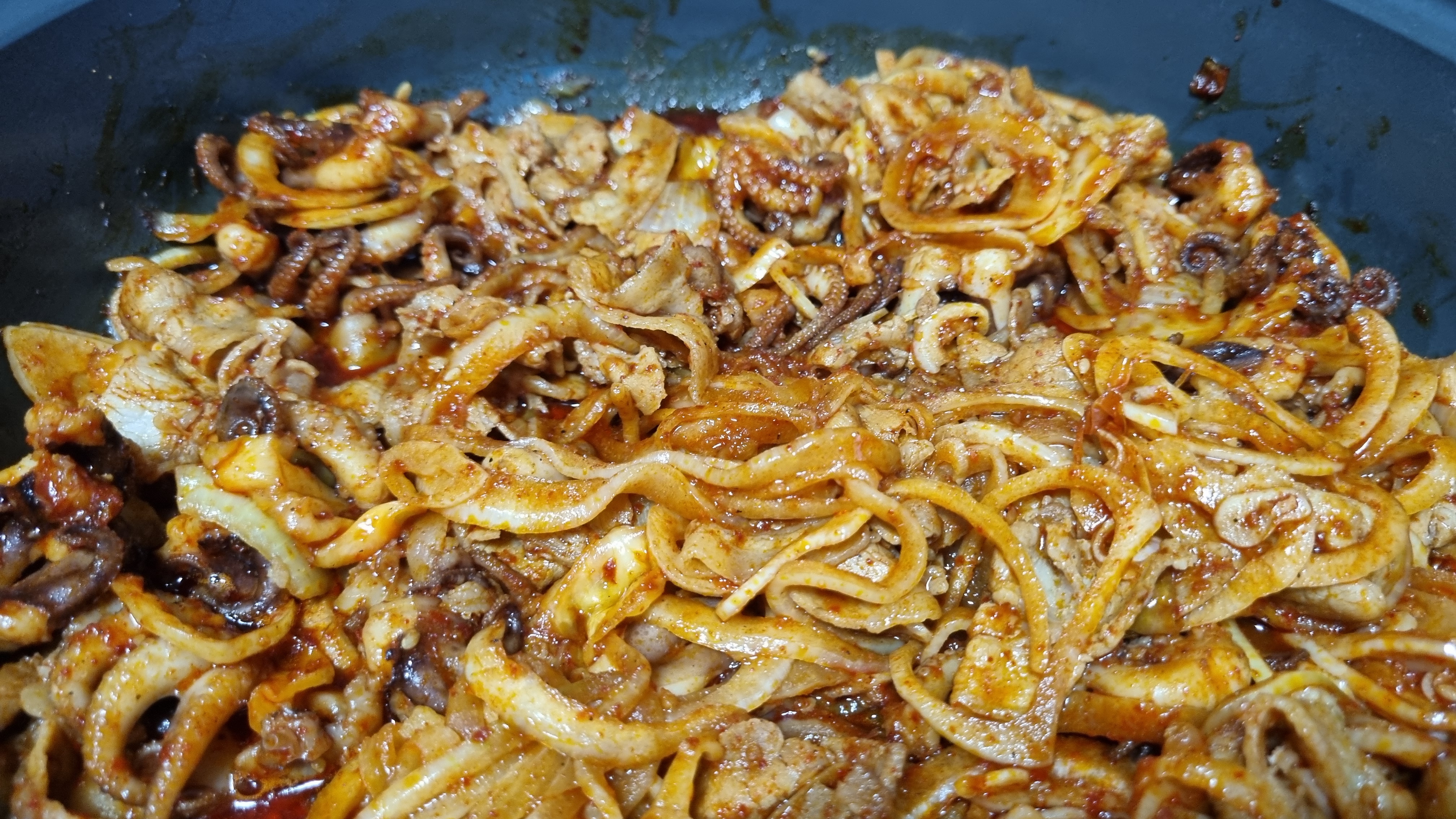쭈꾸미도 부었어요. 보통맛 2인분과 순한맛 2인분이 섞여 있어요. 간을 봤더니 매워요. 역시 저는 맵찔이에요. 하지만 맵찔이도 매운거 좋아해요. 다만 잘 못먹을 뿐이지!