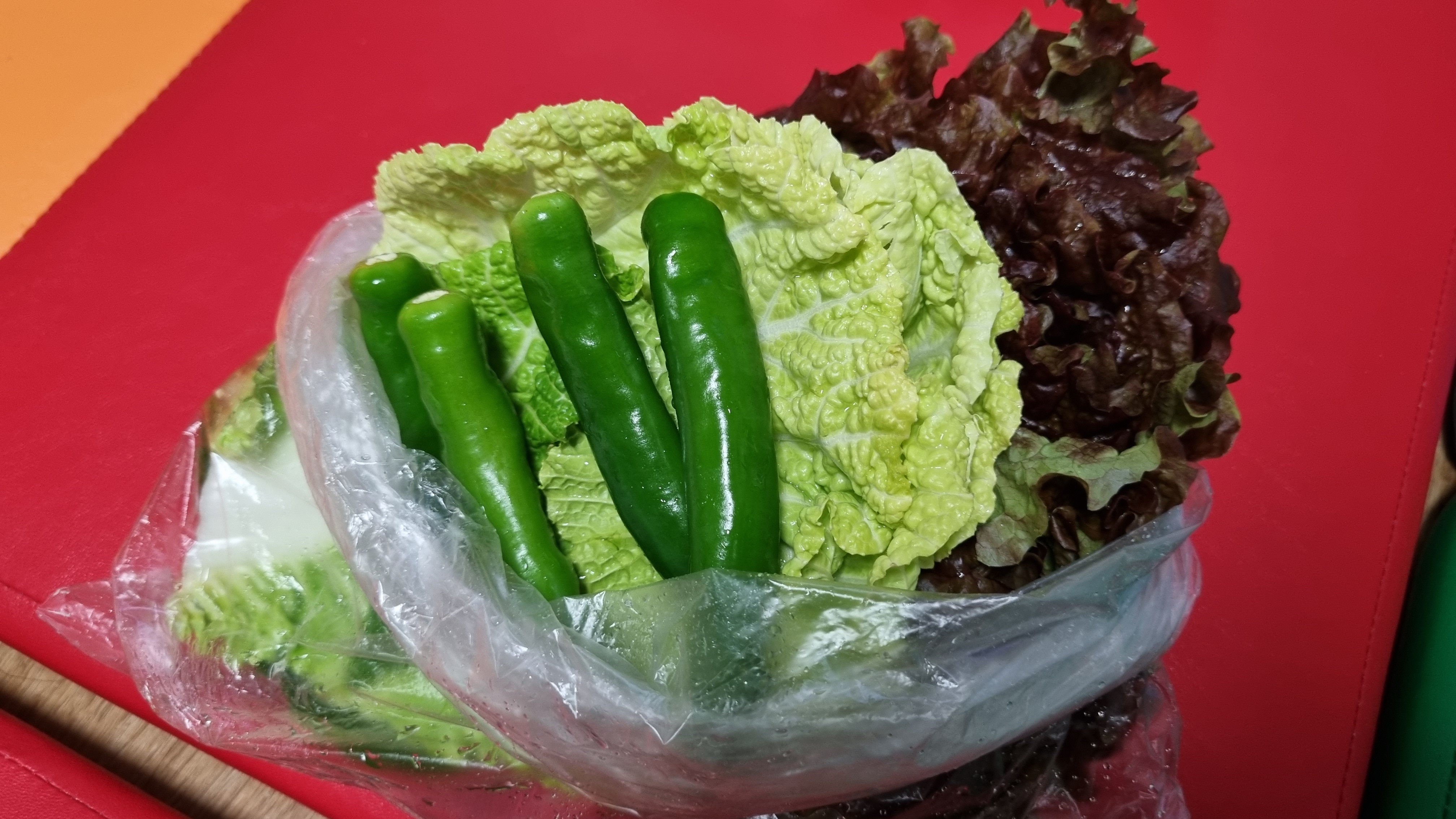 쌈채소도 줬어요. 고추, 배추, 상추, 깻잎. 하지만 역시 쌈채소도 좀 부족했어요. 집에 냉장고에 있는 배추를 더 꺼내다 먹었어요.