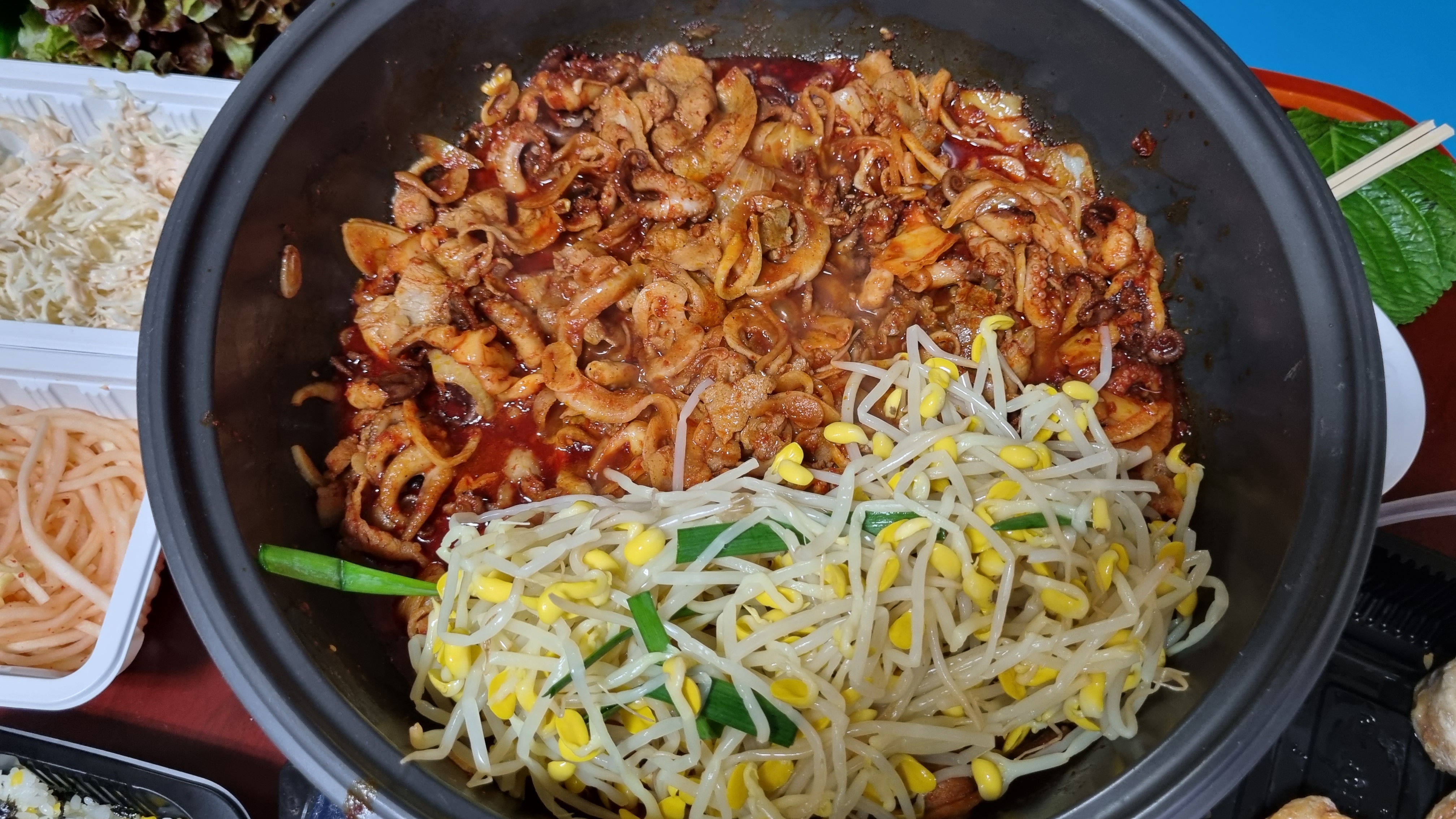 콩나물도 있어요. 간이 심심해요. 이것도 매운 쭈꾸미와 함께 먹으면 덜 맵고 아삭아삭해서 식감도 좋아요.