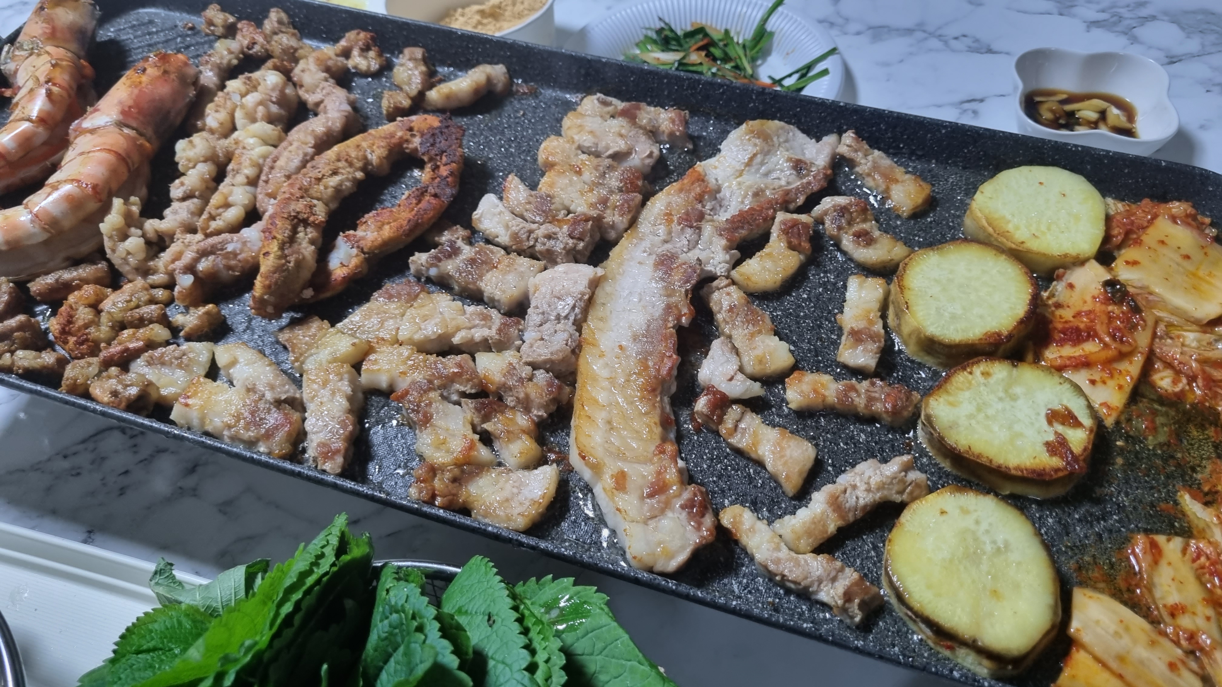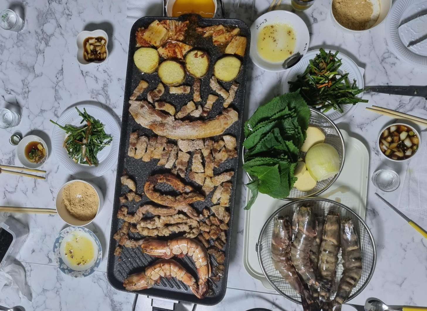 저녁엔 대 환장 파티를 시작했어요. 소곱창, 삼겹살, 고구마, 김치, 킹 블랙타이거 새우를 한 불판 위에 올려서 다 같이 구워 먹었어요. 킹 블랙타이거 새우를 이렇게 구워서 먹는게 맛있었어요. 다음날 숙취로 고생 좀 했죠^^*