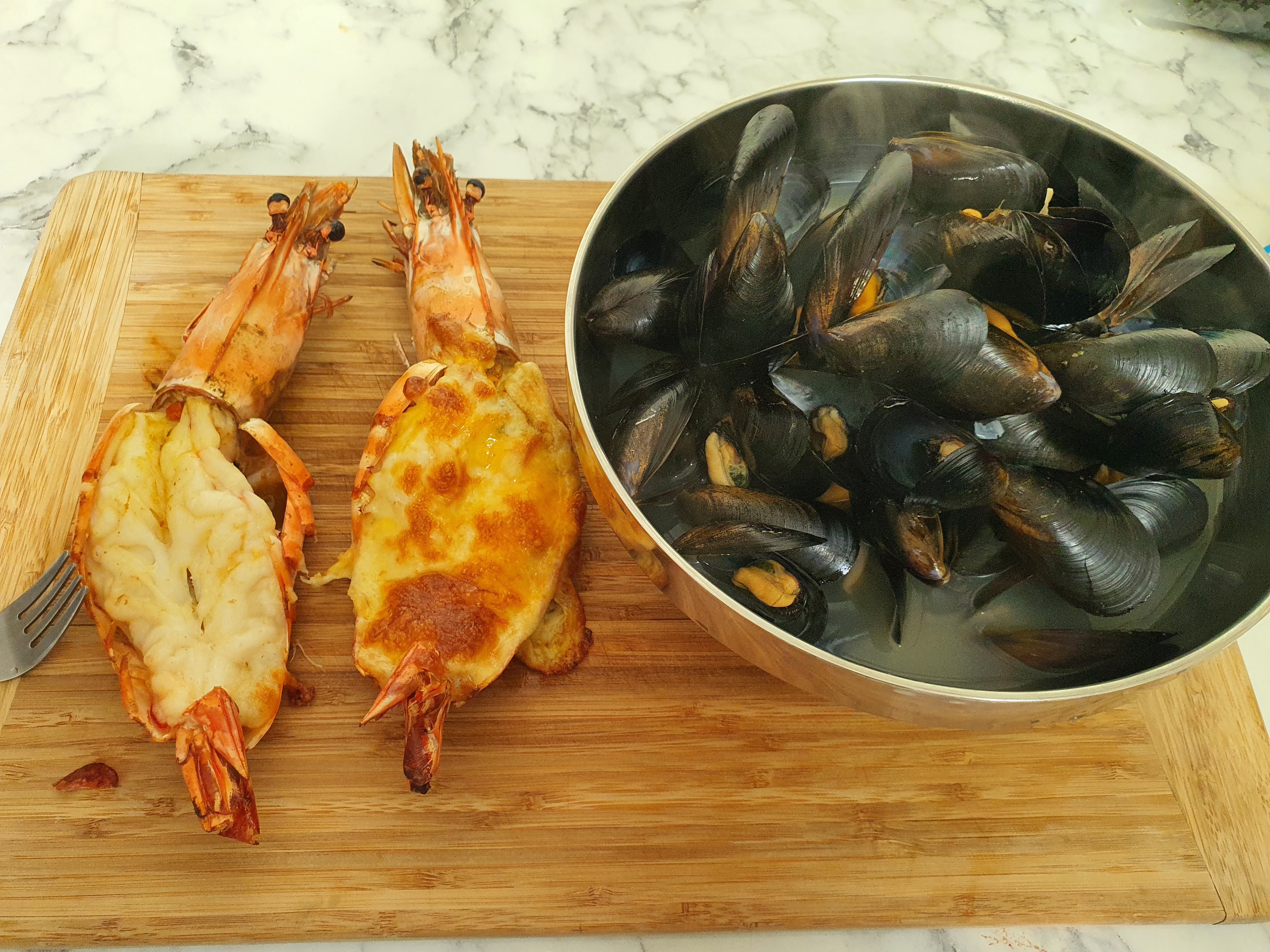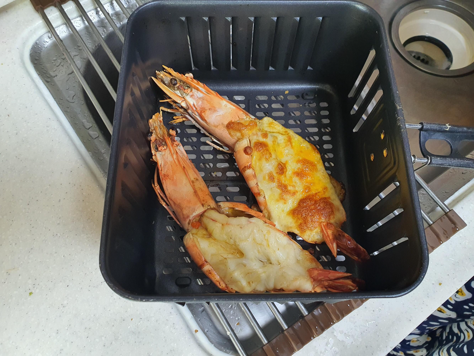 여기에 어떤 주종을 선택해야 할까요? 대낮이라 소주를 꺼내기도 그렇고. 음주는 저녁에 즐기기로 하고 맛만 봤어요. 음... 생각만큼 기대만큼 맛있진 않아요. 그냥 생새우 소금구이하는 게 더 맛있어요. 이건 그냥 새우맛이에요. 버터의 향과 새우맛. 치즈가 올라간 새우는 치즈맛이 강해요. 생각보다 새우 맛이 강하지 않았어요. 어쩌면 물로 너무 많이 씻어서 그런 걸 수도 있고요.