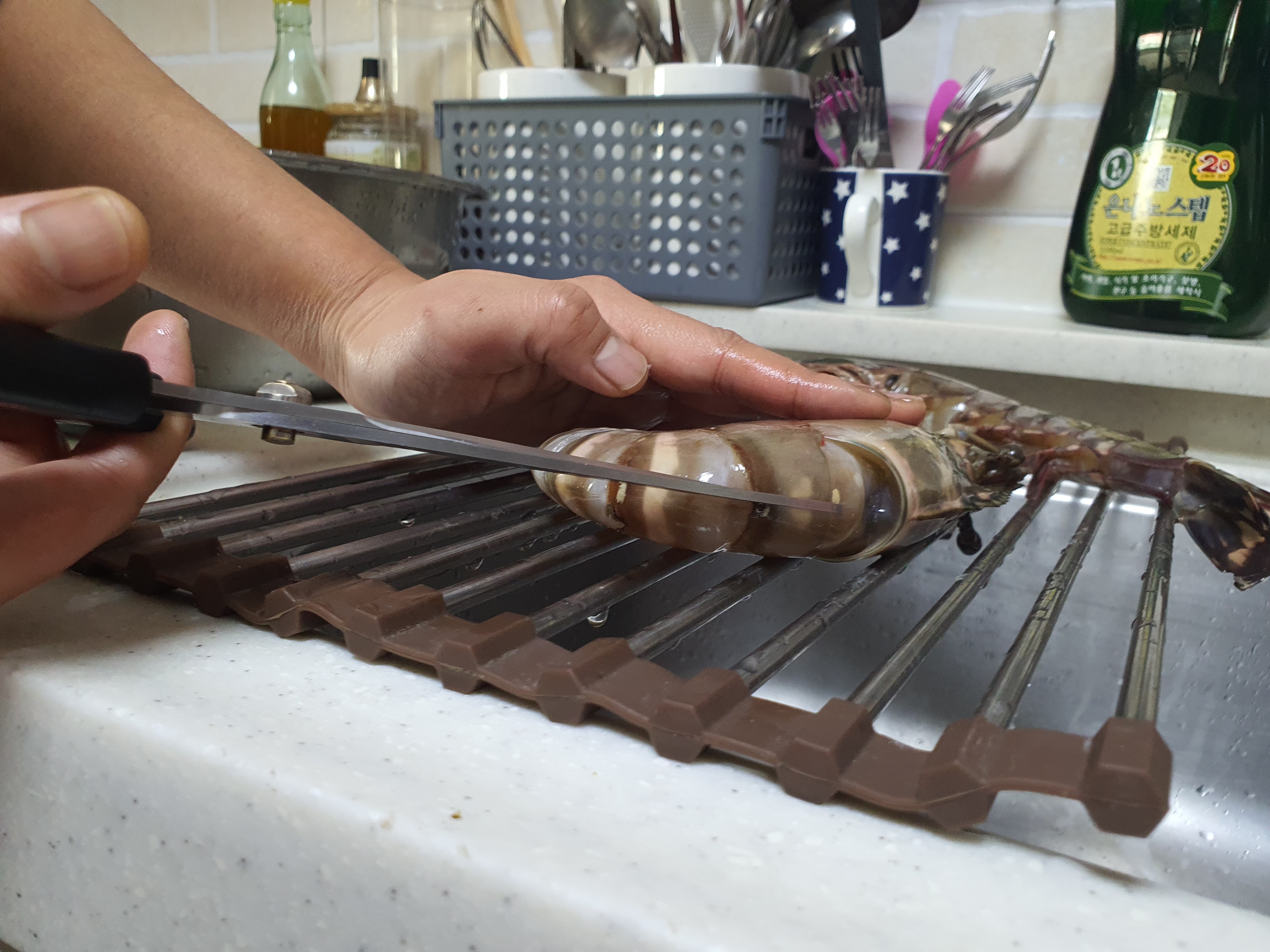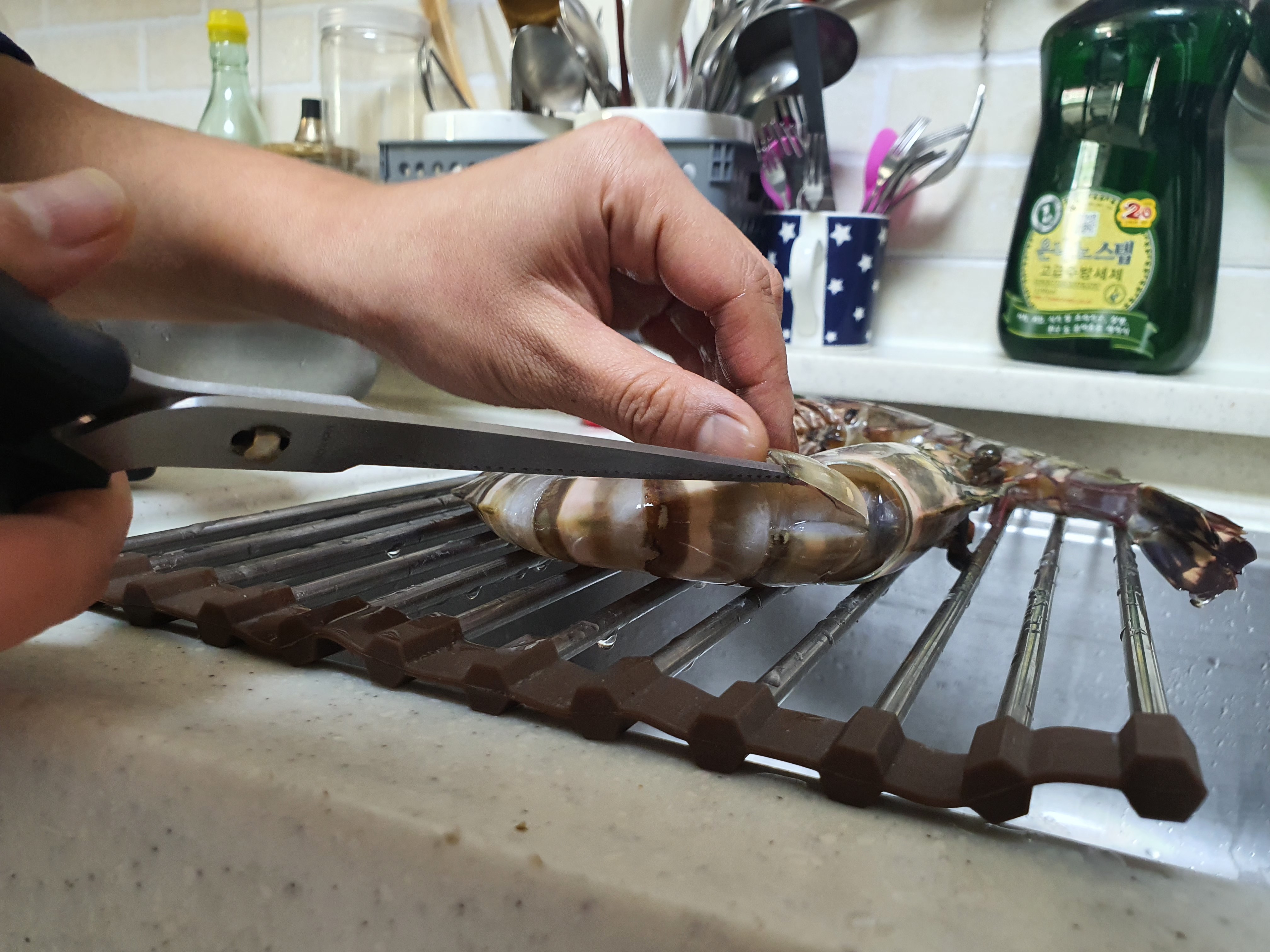 킹 블랙타이거 새우를 손질하기 위해 새우 등의 껍질을 잘라야 해요. 원래 칼로 자르면 될 줄 알았는데 칼은 너무 위험하고 잘 잘리지도 않아서 등의 껍질을 가위로 잘랐어요.