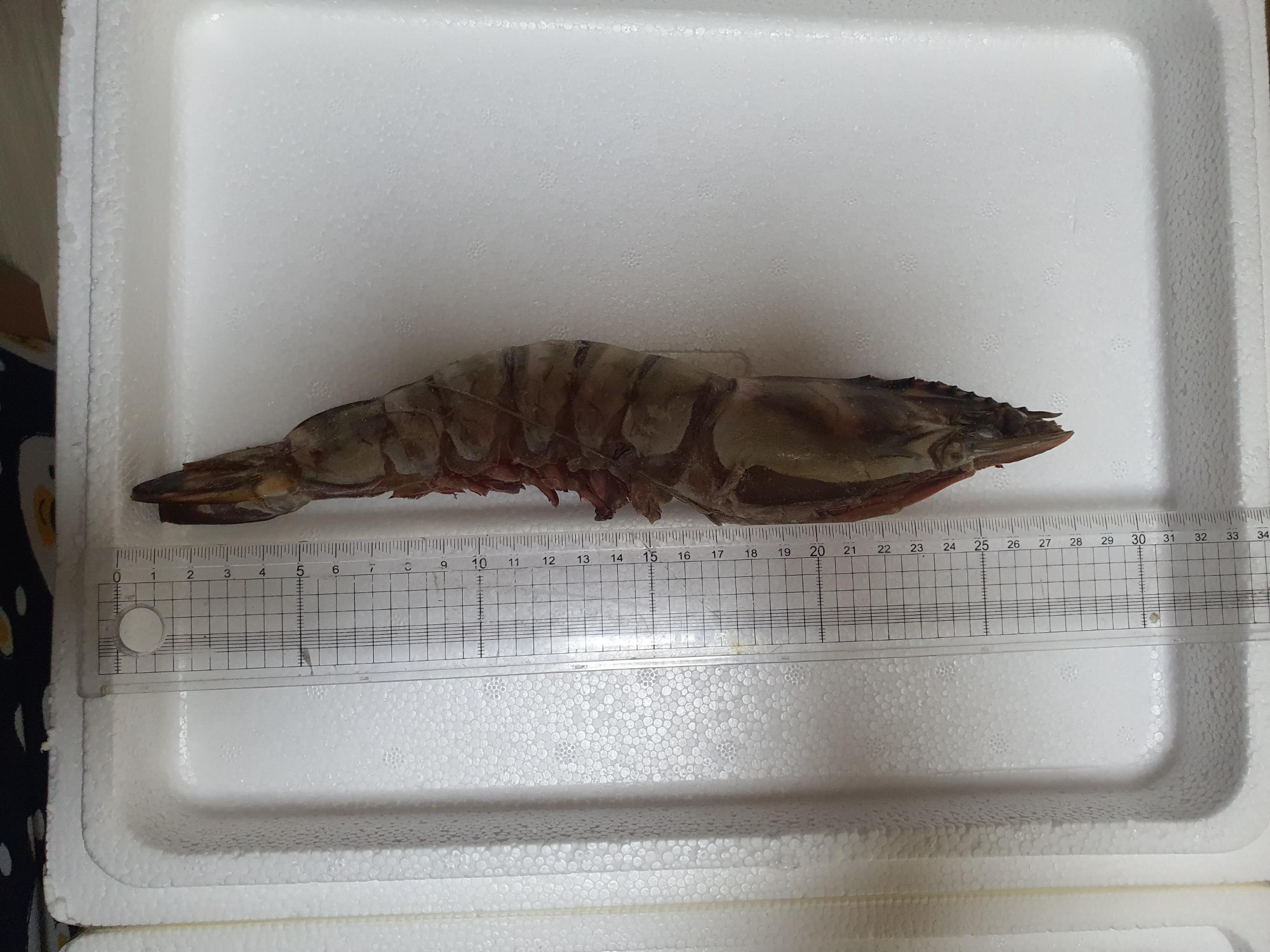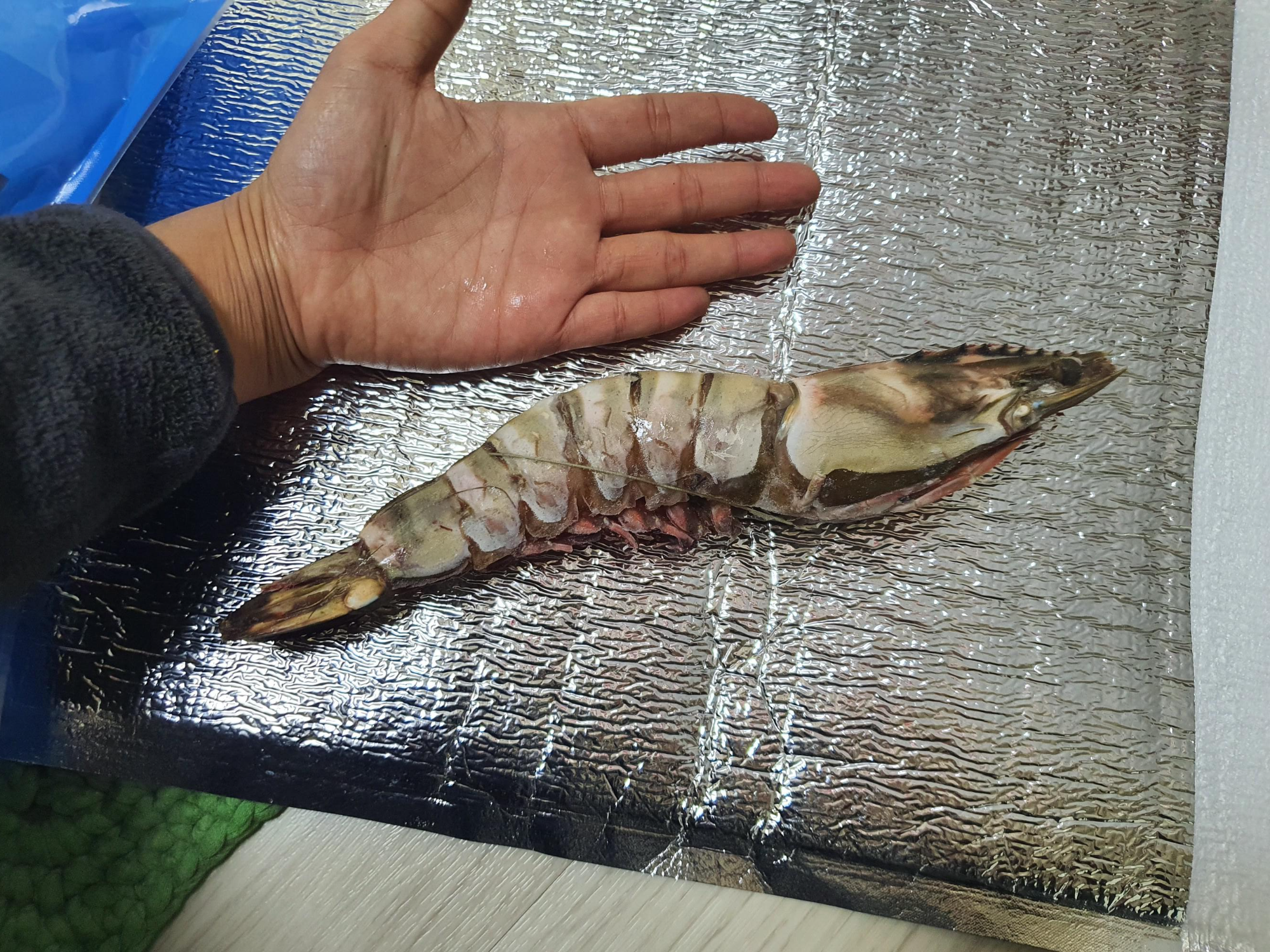 기다리고 기다리던 킹 블랙타이거 새우가 왔어요. 일단 크기가 어마어마하게 커요. 한 봉지에 1Kg이에요. 1Kg에 5마리. 1Kg에 5마리와 3마리는 크게 차이가 없다고 해서 5마리로 샀어요.