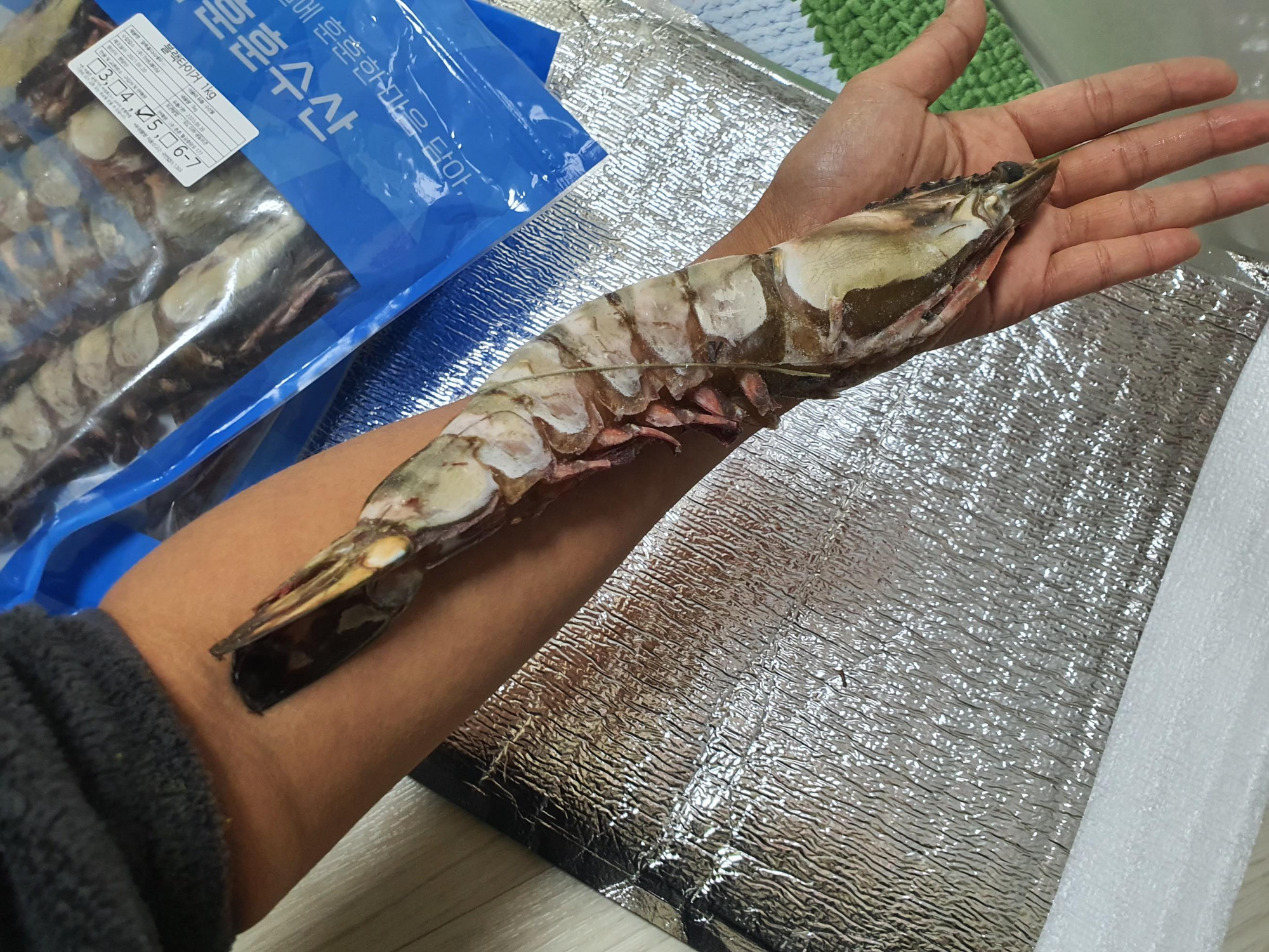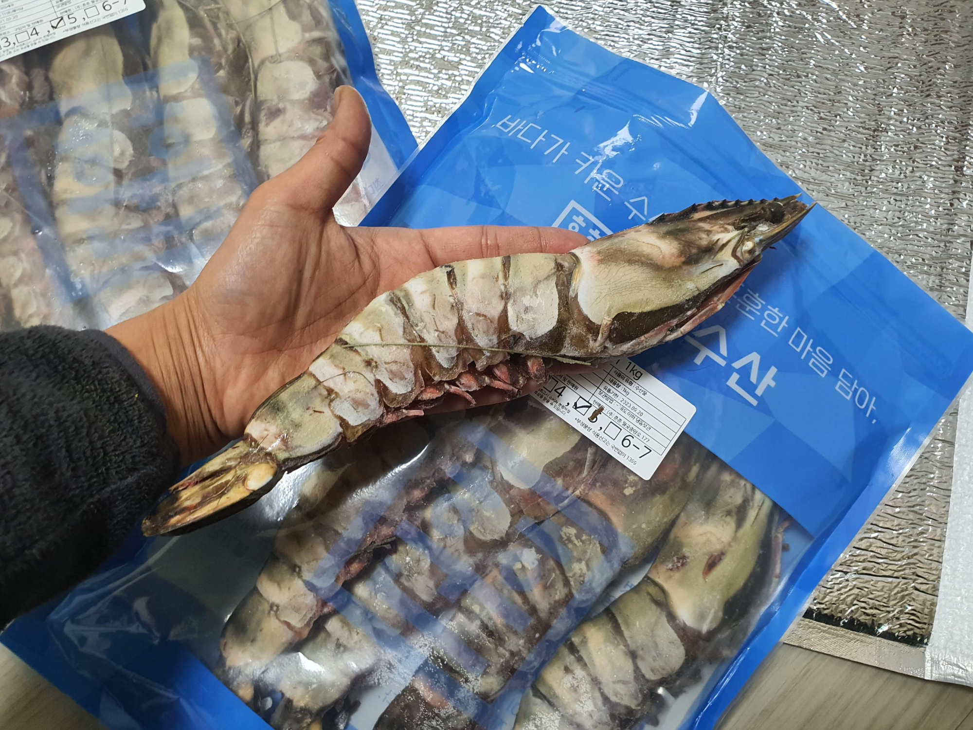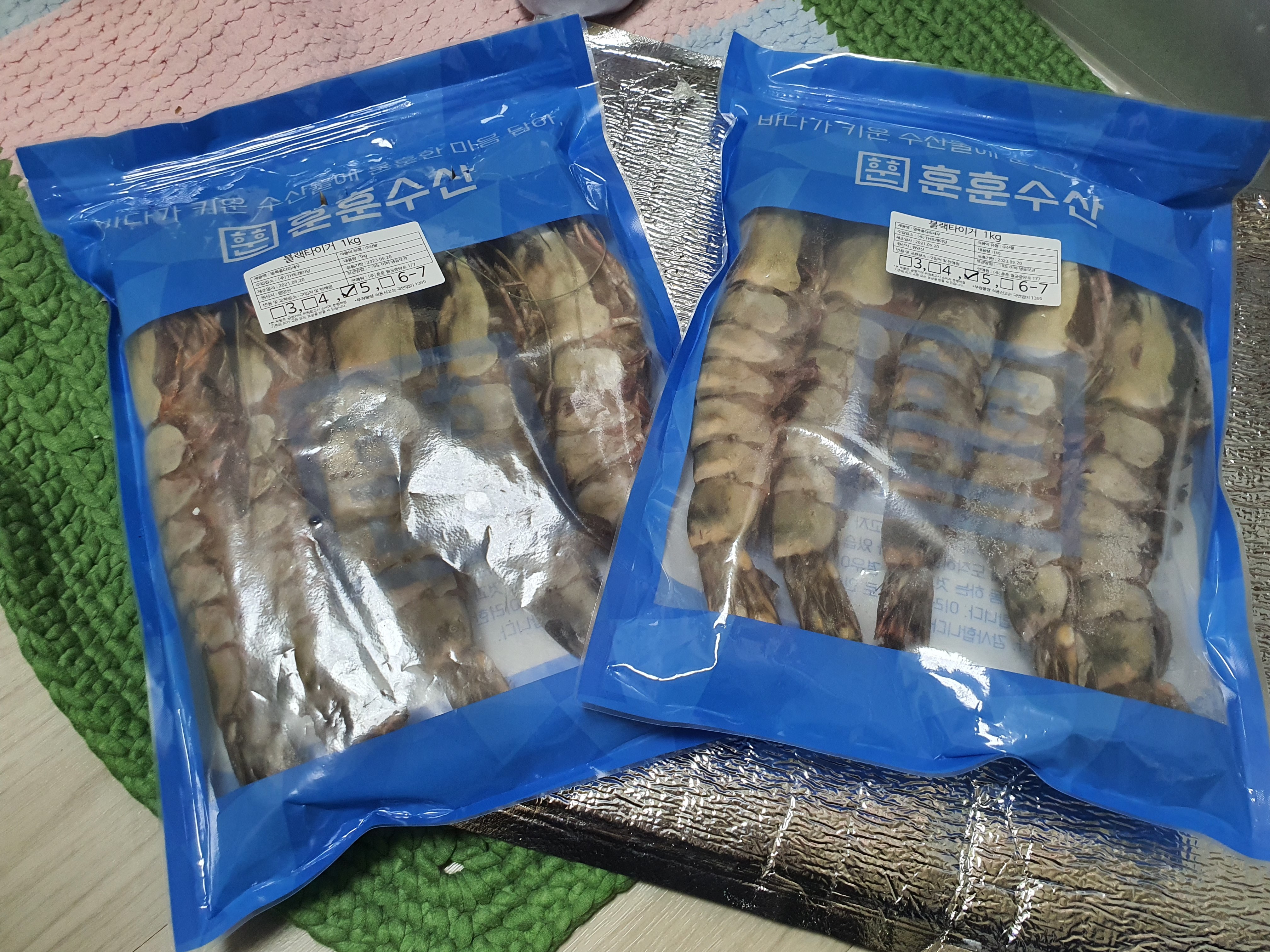 기다리고 기다리던 킹 블랙타이거 새우가 왔어요. 일단 크기가 어마어마하게 커요. 한 봉지에 1Kg이에요. 1Kg에 5마리. 1Kg에 5마리와 3마리는 크게 차이가 없다고 해서 5마리로 샀어요.