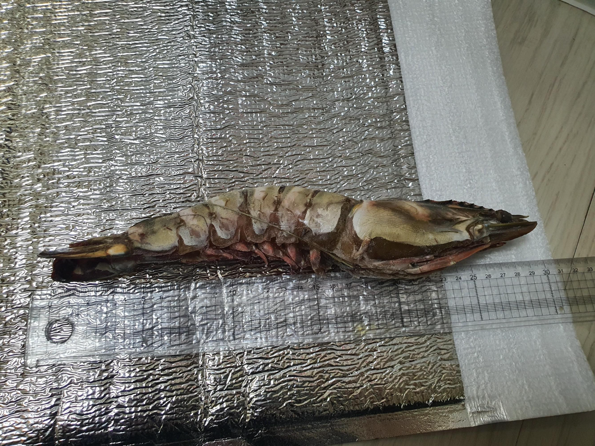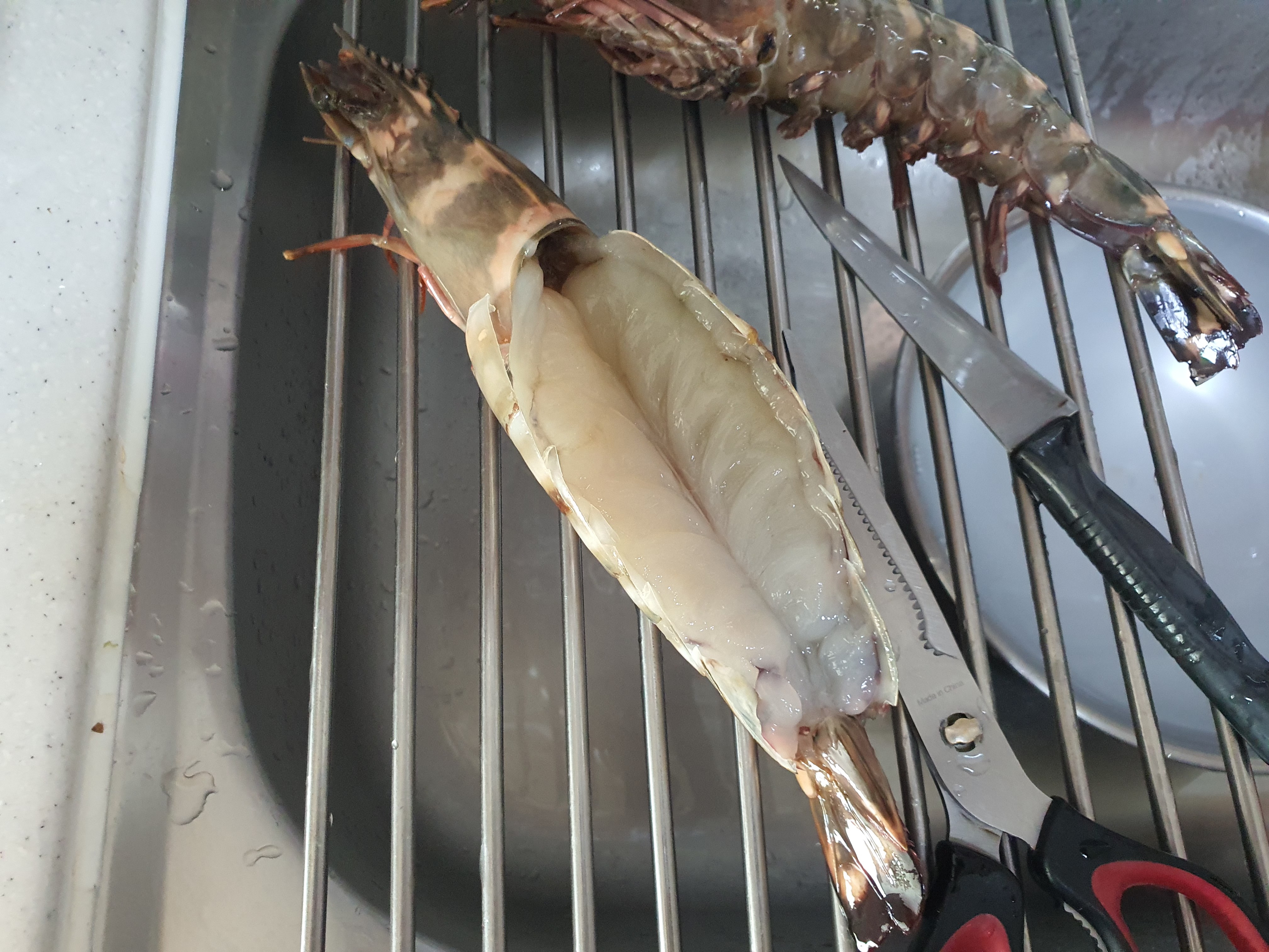 킹 블랙타이거 새우를 손질하기 위해 새우 등의 껍질을 잘라야 해요. 원래 칼로 자르면 될 줄 알았는데 칼은 너무 위험하고 잘 잘리지도 않아서 등의 껍질을 가위로 잘랐어요.