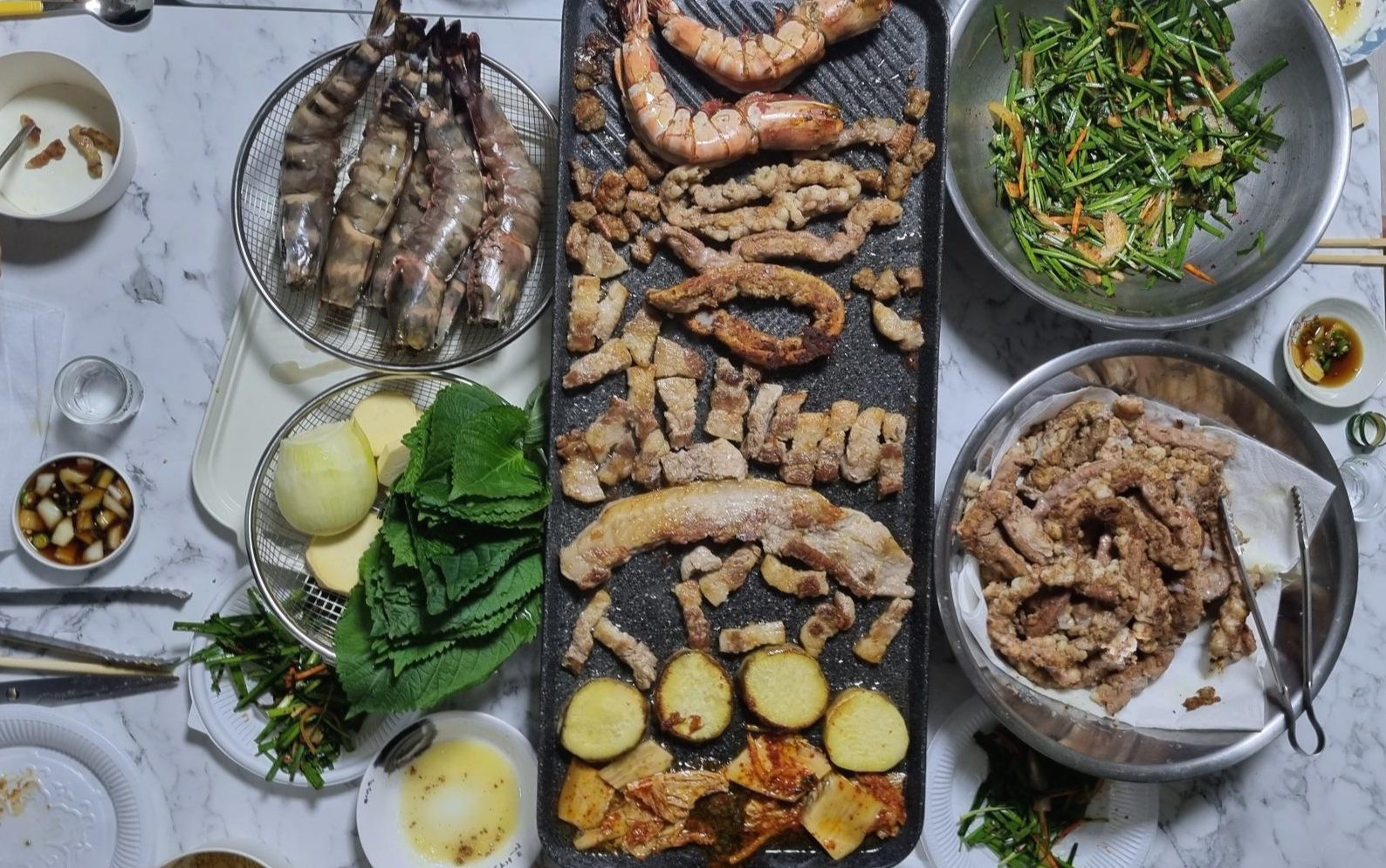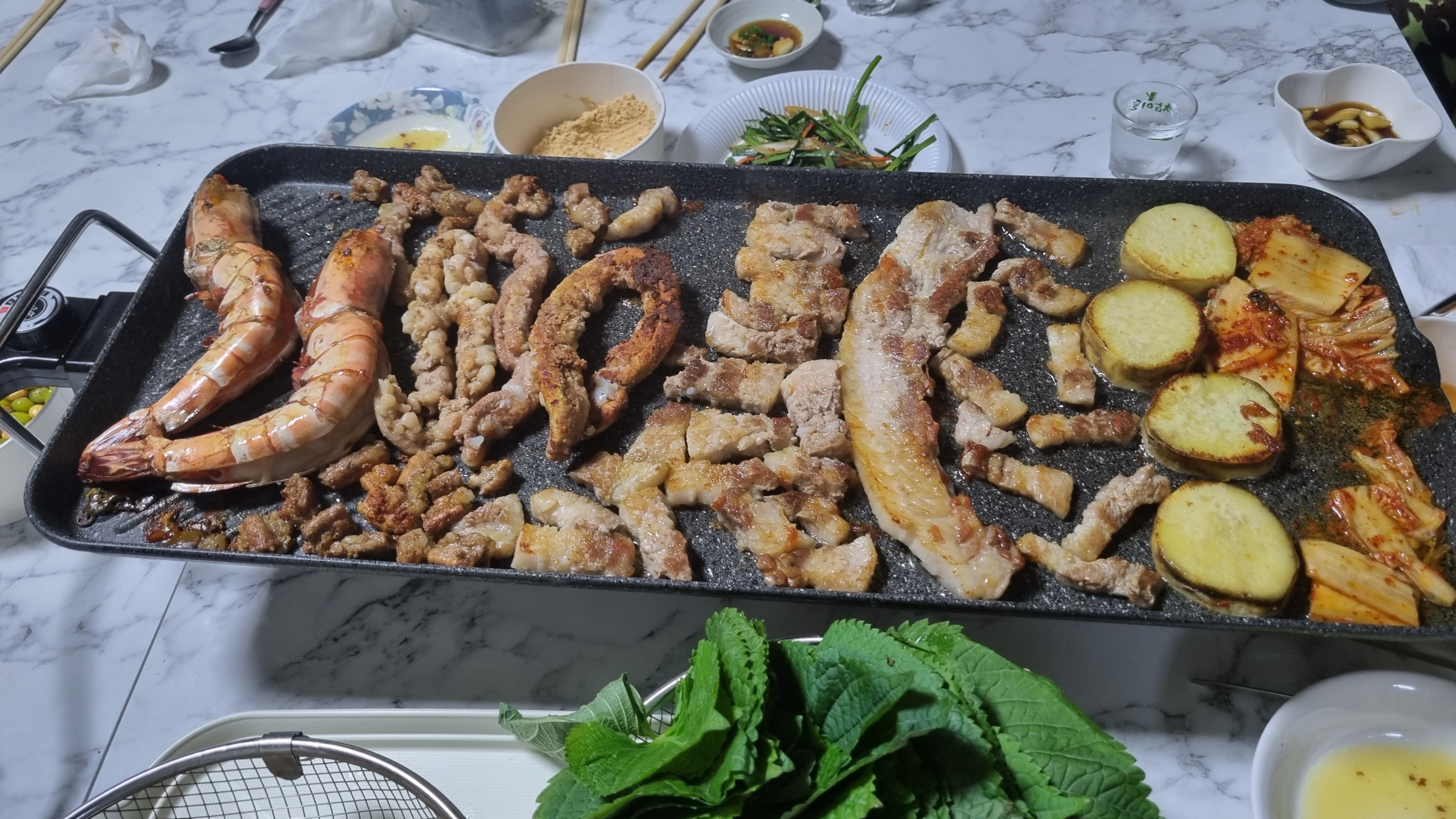 저녁엔 대 환장 파티를 시작했어요. 소곱창, 삼겹살, 고구마, 김치, 킹 블랙타이거 새우를 한 불판 위에 올려서 다 같이 구워 먹었어요. 킹 블랙타이거 새우를 이렇게 구워서 먹는게 맛있었어요. 다음날 숙취로 고생 좀 했죠^^*