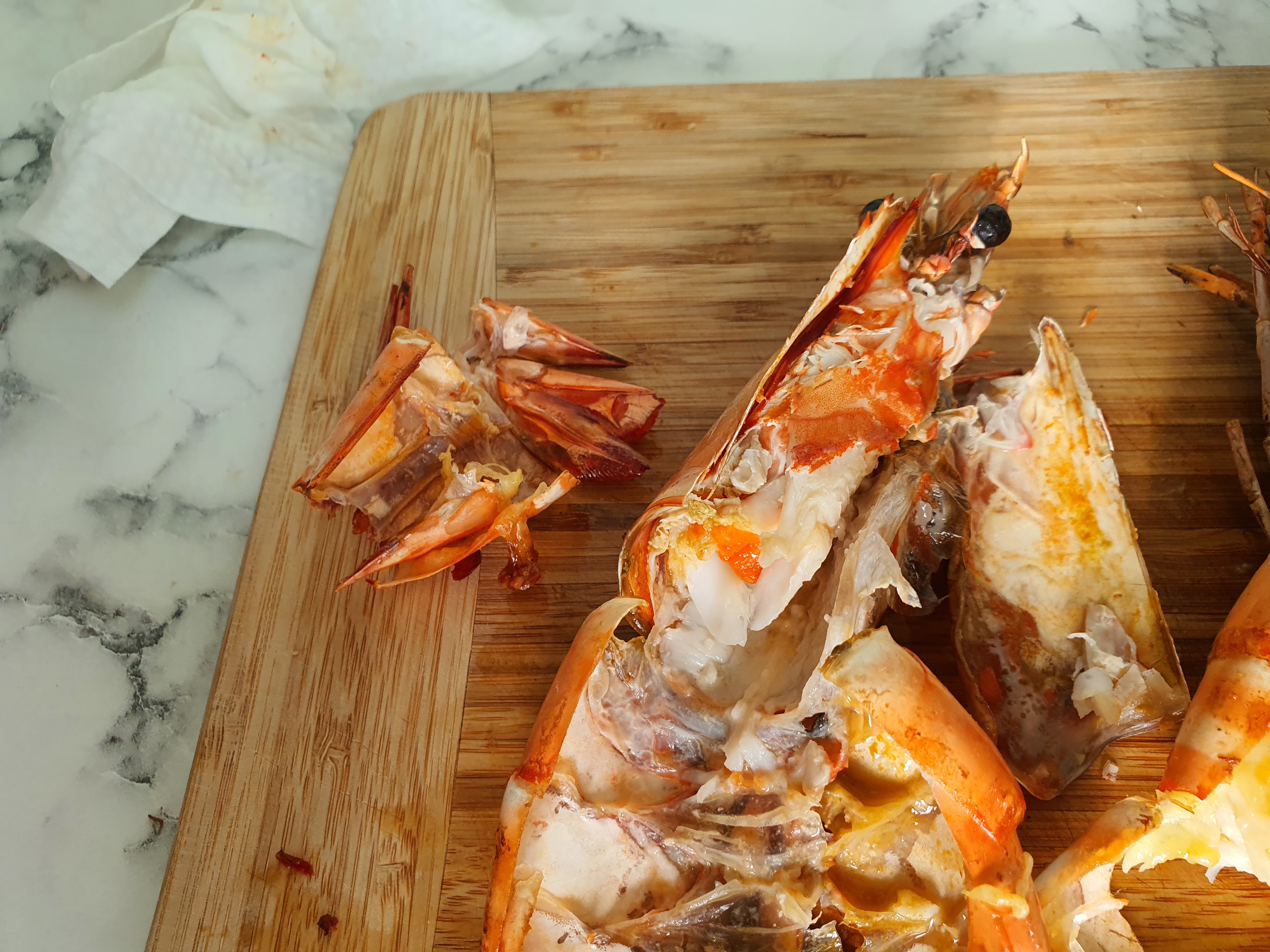 저는 킹 블랙타이거 새우 처음 먹어봐서 모르고 내장을 다 빼버렸어요. 하지만 남아있는 것들은 손질할 때 내장을 그대로 남겨 뒀어요. 내장이 맛있거든요.
