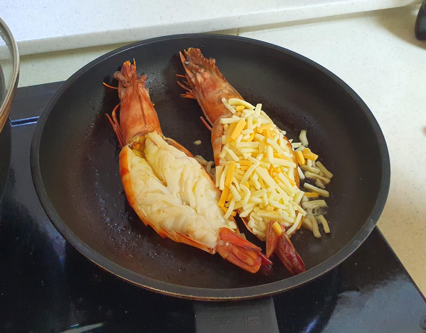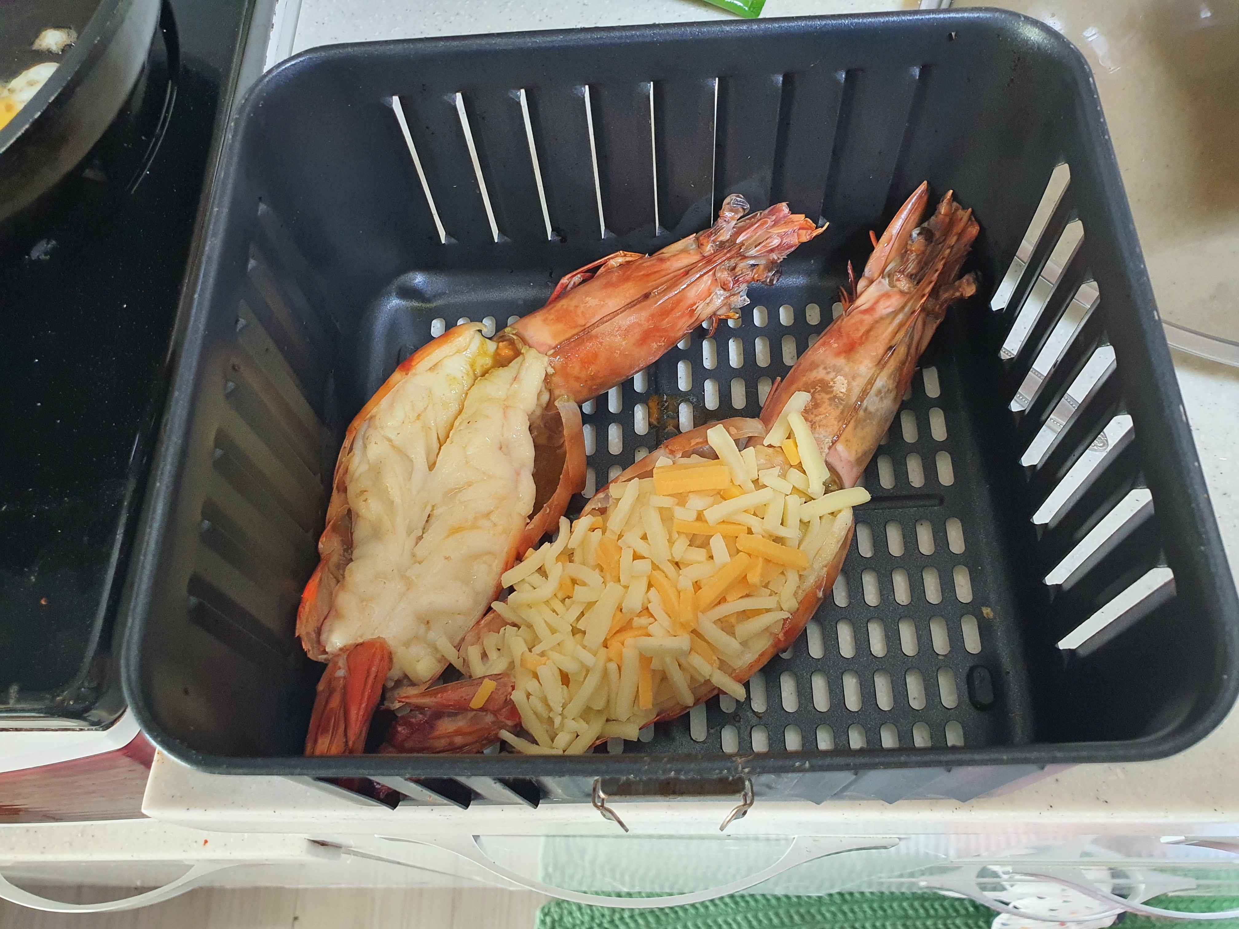 여기에 어떤 주종을 선택해야 할까요? 대낮이라 소주를 꺼내기도 그렇고. 음주는 저녁에 즐기기로 하고 맛만 봤어요. 음... 생각만큼 기대만큼 맛있진 않아요. 그냥 생새우 소금구이하는 게 더 맛있어요. 이건 그냥 새우맛이에요. 버터의 향과 새우맛. 치즈가 올라간 새우는 치즈맛이 강해요. 생각보다 새우 맛이 강하지 않았어요. 어쩌면 물로 너무 많이 씻어서 그런 걸 수도 있고요.