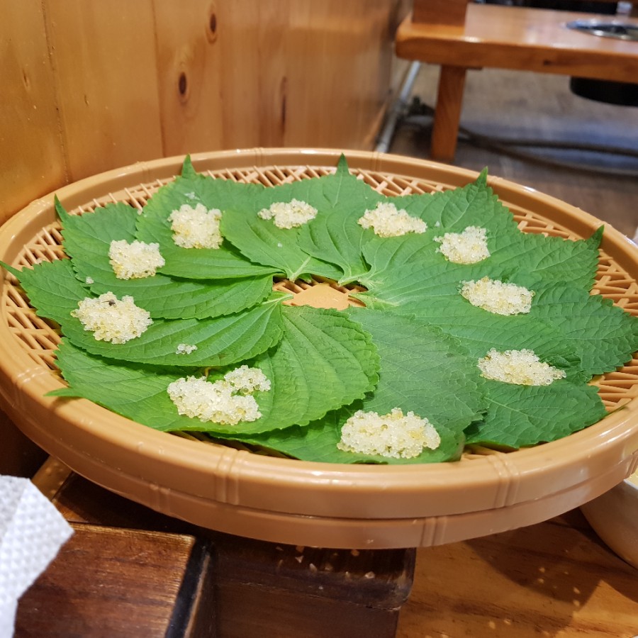 알쌈에 싸먹어야 진짜 맛있다. 그래서 그런지 처음부터 2판을 주시고 리필도 가능하다. 사진에선 잘 안 보이지만 깻잎 위에 알과 땅콩버터가 함께 올라가 있다.