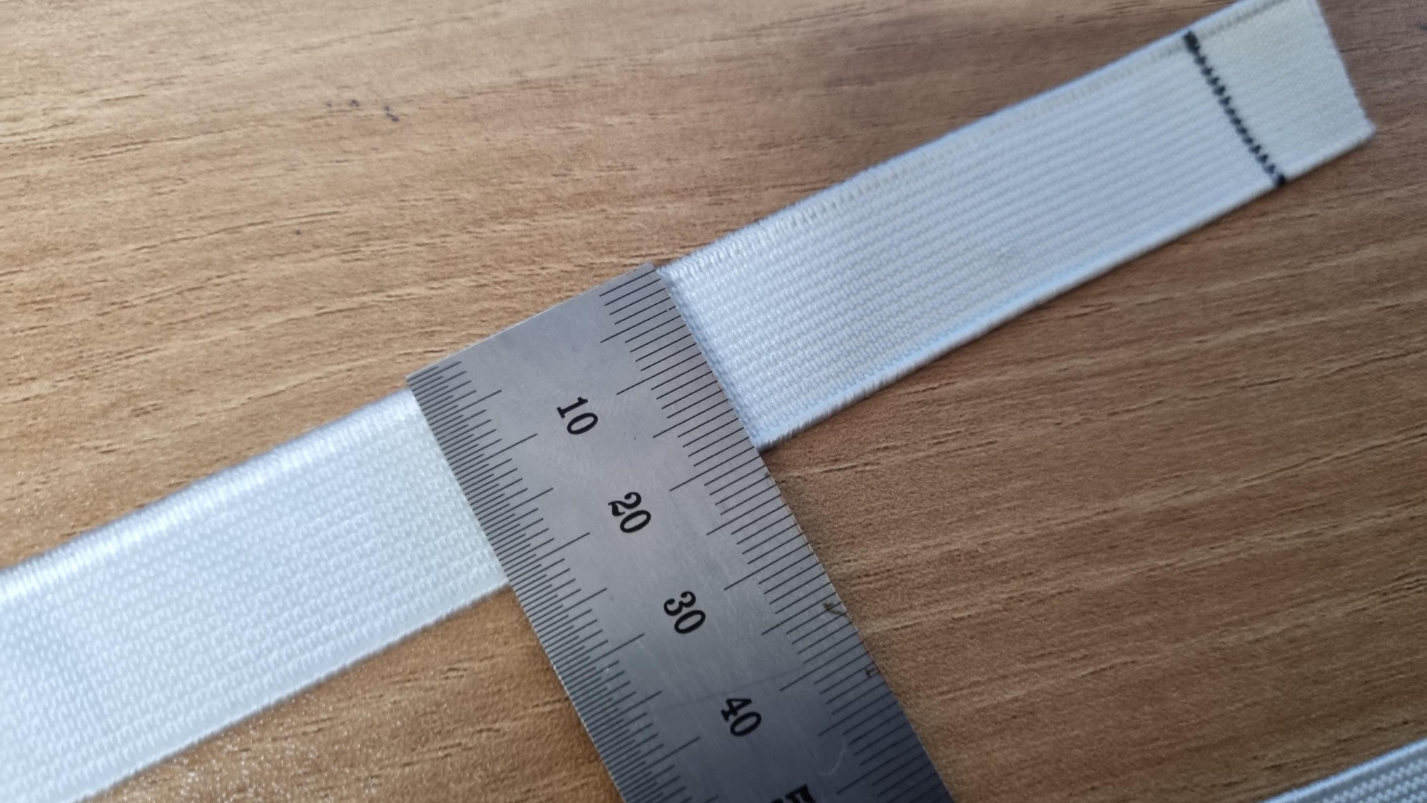 허리에 넣을 고무줄은 단면 28.5cm에요. 총길이는 57cm. 양 옆에 1.5cm 정도는 시접으로 남겨뒀어요. 그러니깐 시접을 포함해서 고무줄 길이는 총 60cm에요.