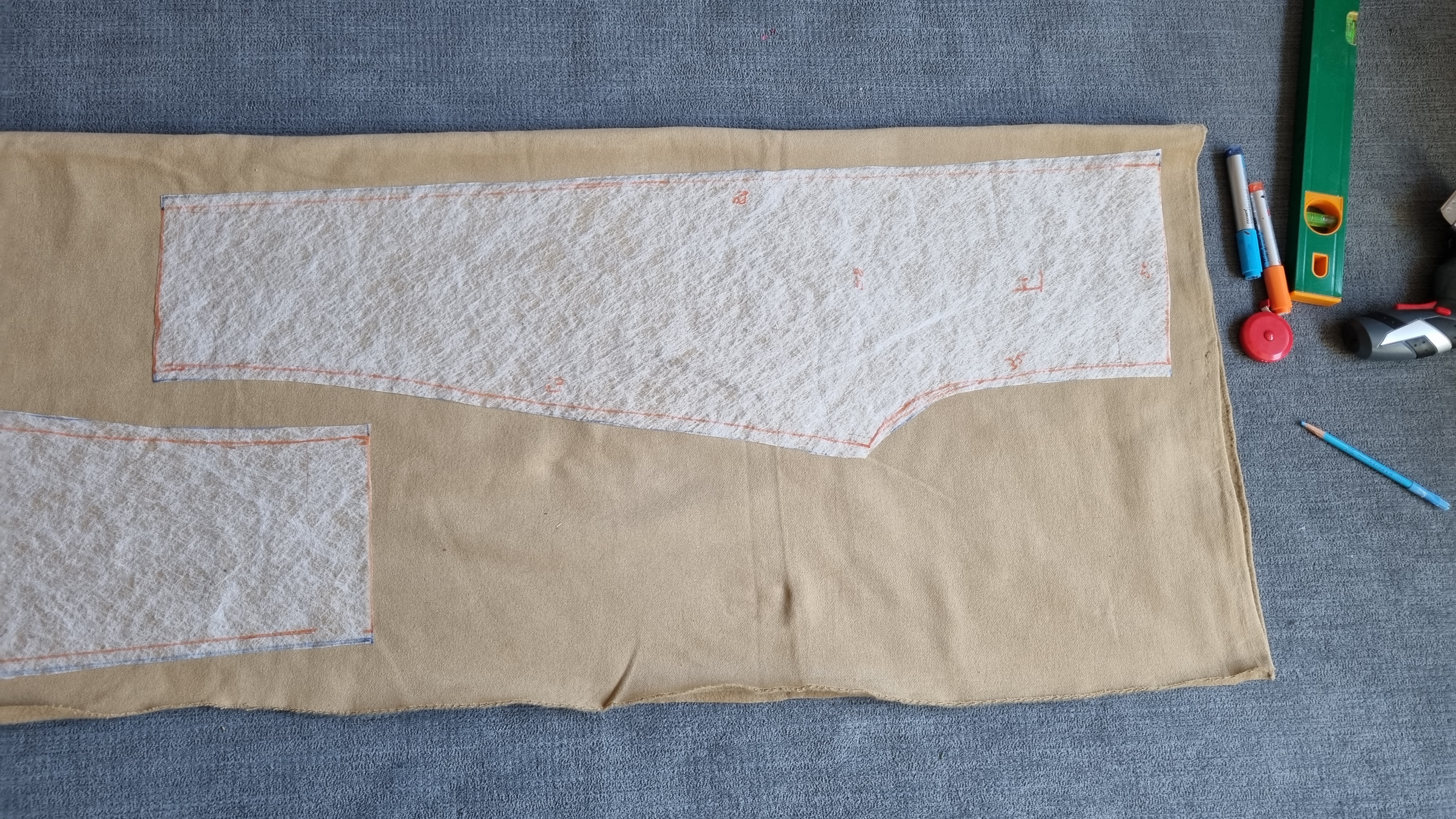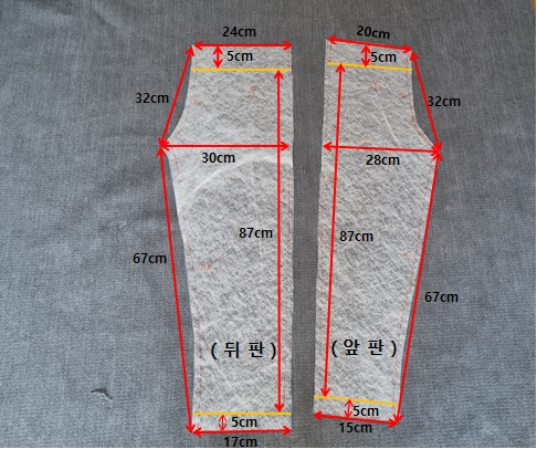일단 바지부터 만들기로 했어요. 그리고 부직포에 패턴을 그렸어요. 바지를 부직포에 올리고 열심히 그렸죠. 패턴을 잘 그려야 예쁜 옷을 만들 수 있어요. 하지만 이런 츄리닝의 경우 패턴에 오차가 좀 생겨도 크게 불편하지도 않고 티도 안 나요. 그래요. 초보자도 얼마든지 쉽게 만들 수 있는 옷이에요.