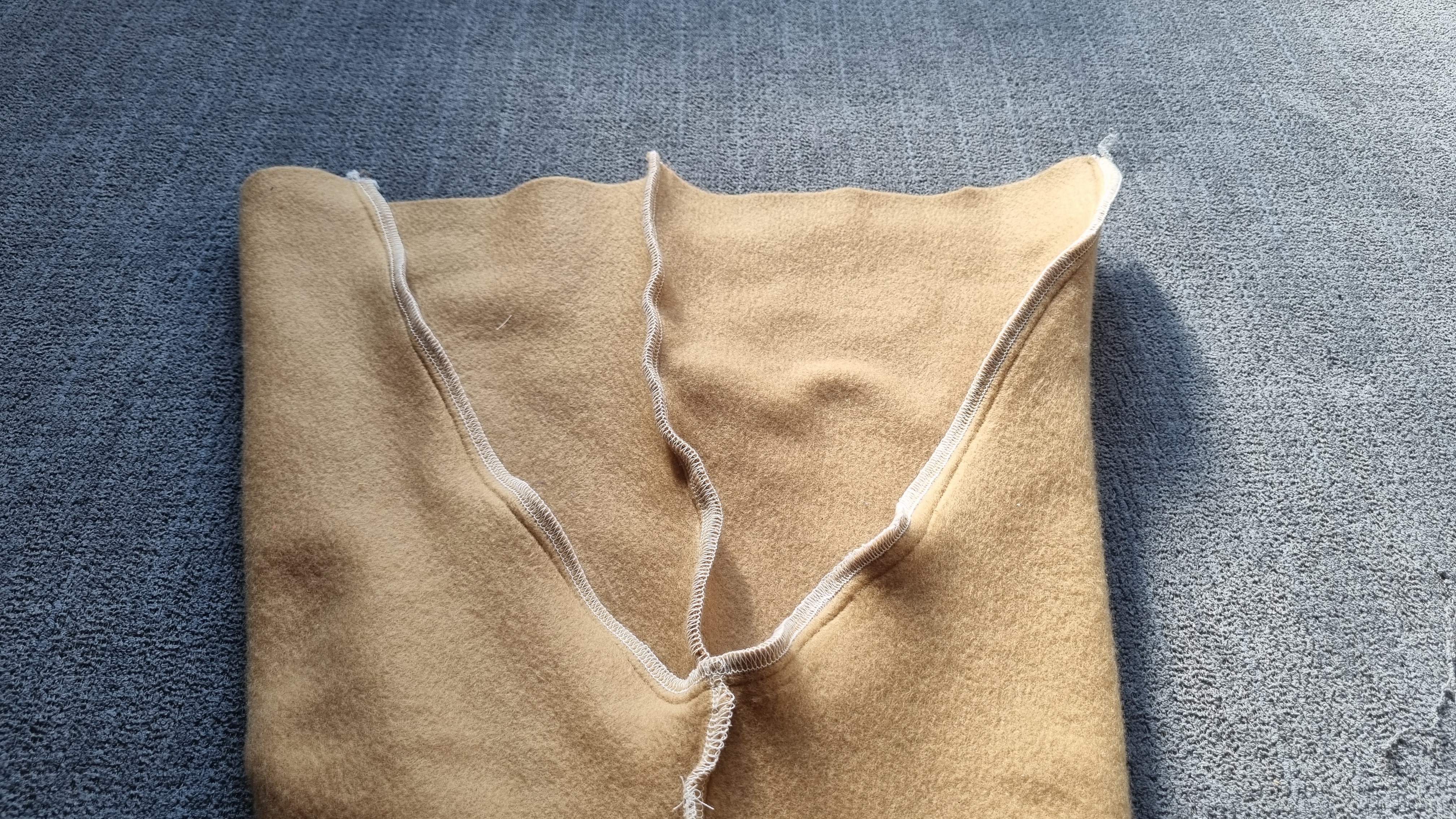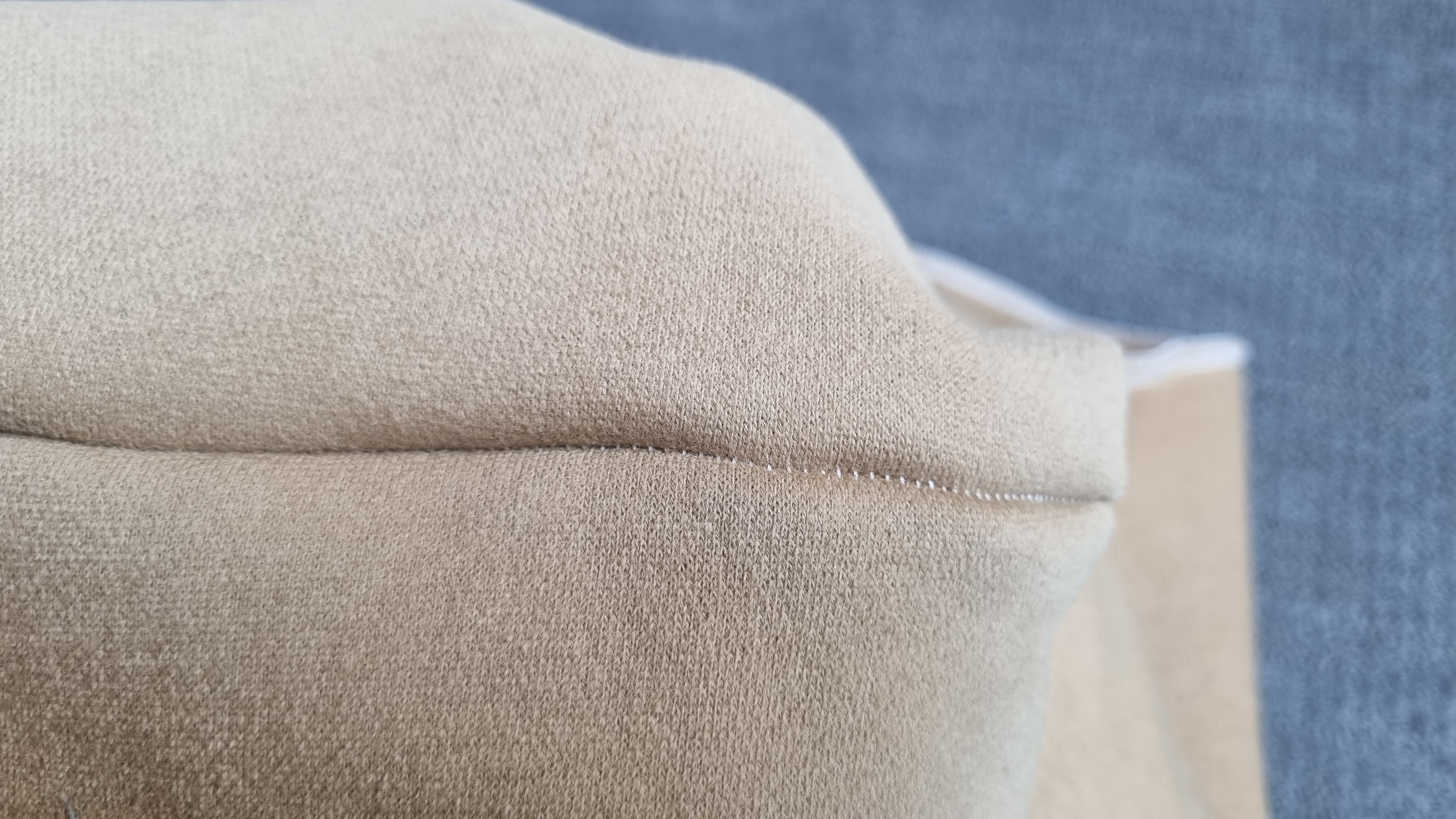 위의 사진은 직선 재봉을 한 후 겉에서 찍은 사진이에요. 힘주어 당기지 않으면 바늘 실이 전혀 보이지 않아요. 이렇게 실이 겉에서 보이지 않아야 예뻐요. 실이 보이면 뭔가 옷이 뜯어질 것 같고 불안해요. 직선 재봉을 한 번 더 해줌으로써 더욱 튼튼하게 만들 수 있어요.