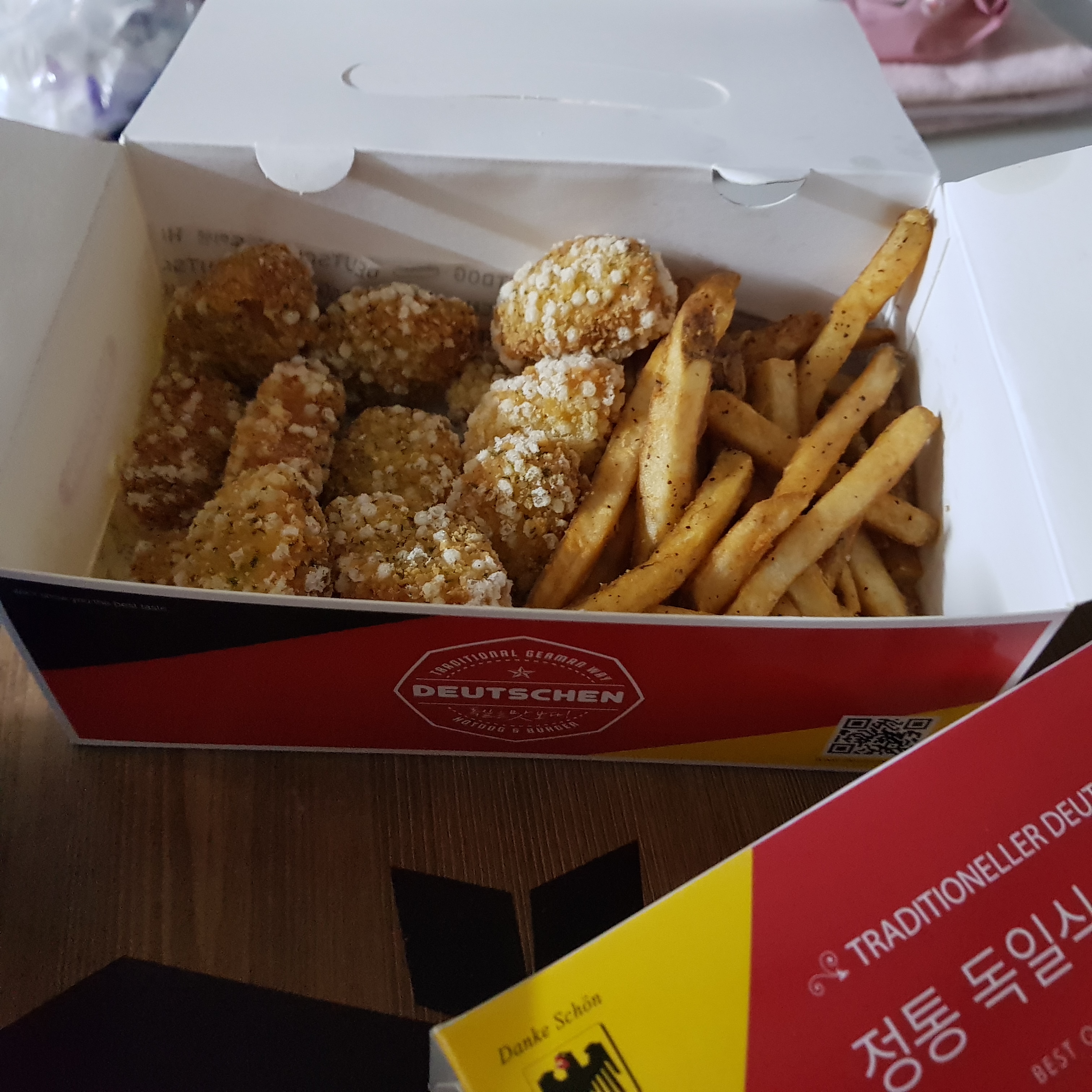 크런치 순살치킨은 겉은 매우 바삭하고 속은 육즙이 가득하다. 원래 순살은 퍽퍽함 때문에 별로 좋아하진 않지만 도이첸 크런치 순살치킨은 부드러워서 맛있었다. 감자튀김은 맘스터치 감자튀김과 비슷하다. 케찹은..... 롯데리아가 맛있다. 크런치 순살치킨 M: 8,000원, L: 15,000원, 케이준 감자 3,500원