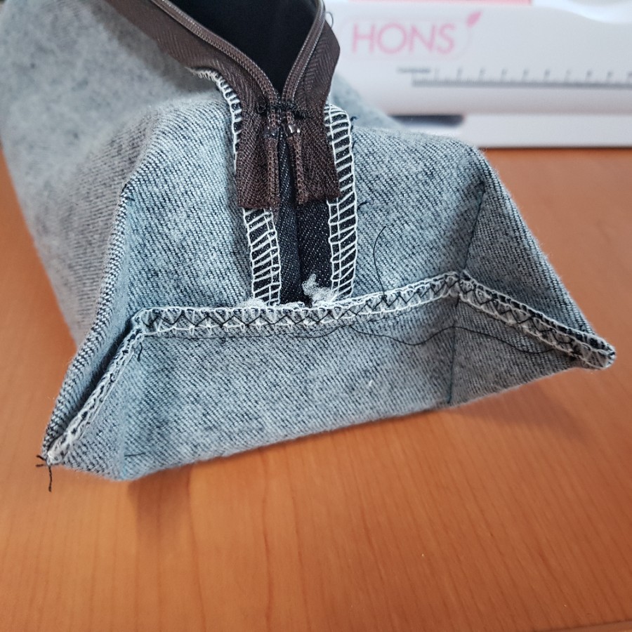 아래 사진은 오버록을 완성한 모습니다. 그리고 뒤집으면 완성이다. 생각보다 엄청 지저분하다. 그래도 안쪽이라 다행이다. 그리고 뒤집으면 혼스 미싱 지퍼 달기 노루발을 사용하여 필통 만들기 완성이다.