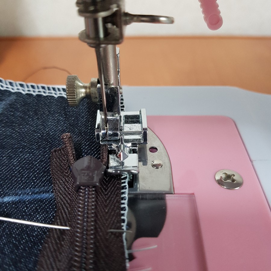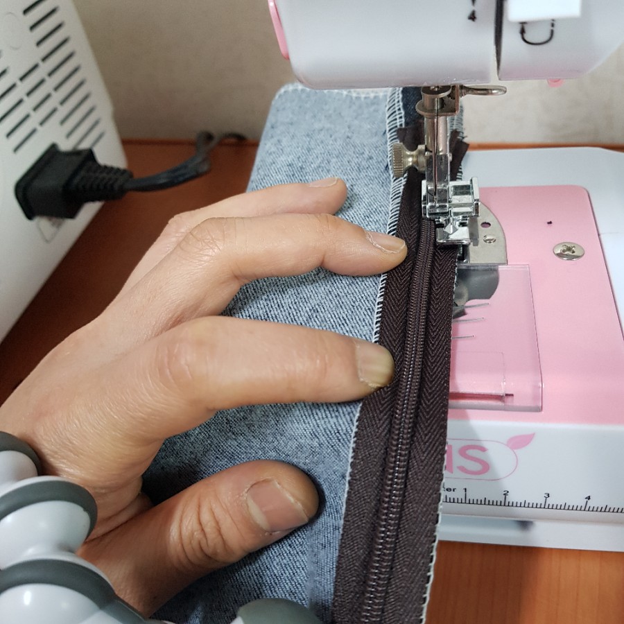 지퍼 달기 노루발을 왼쪽에서 오른쪽으로 바꿔 끼면 위, 아래 편하게 박음질할 수 있다.