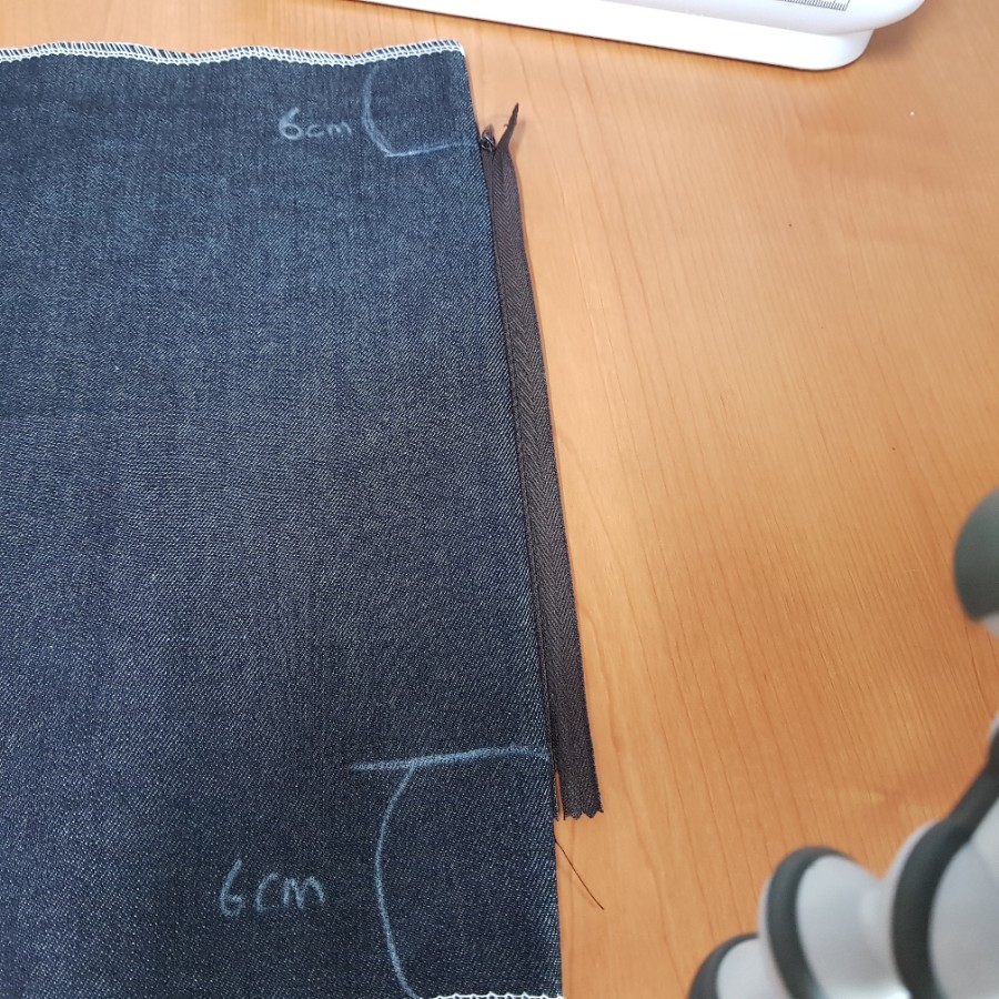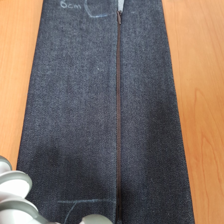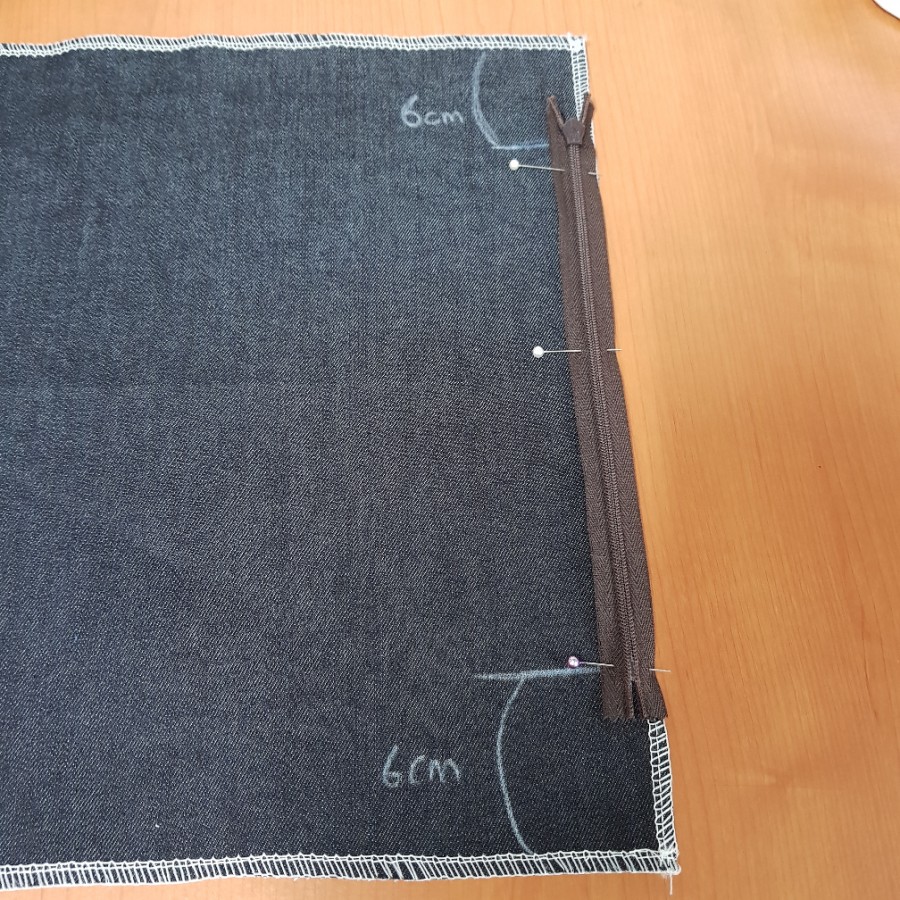 지퍼가 위치할 곳을 초크로 표시해 주고 지퍼와 원단을 시침핀으로 고정한다.