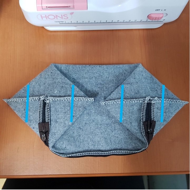 아래 사진처럼 모양을 만든 다음 파란색 사인펜으로 표시한 부분(6cm)을 평발로 박음질한다.