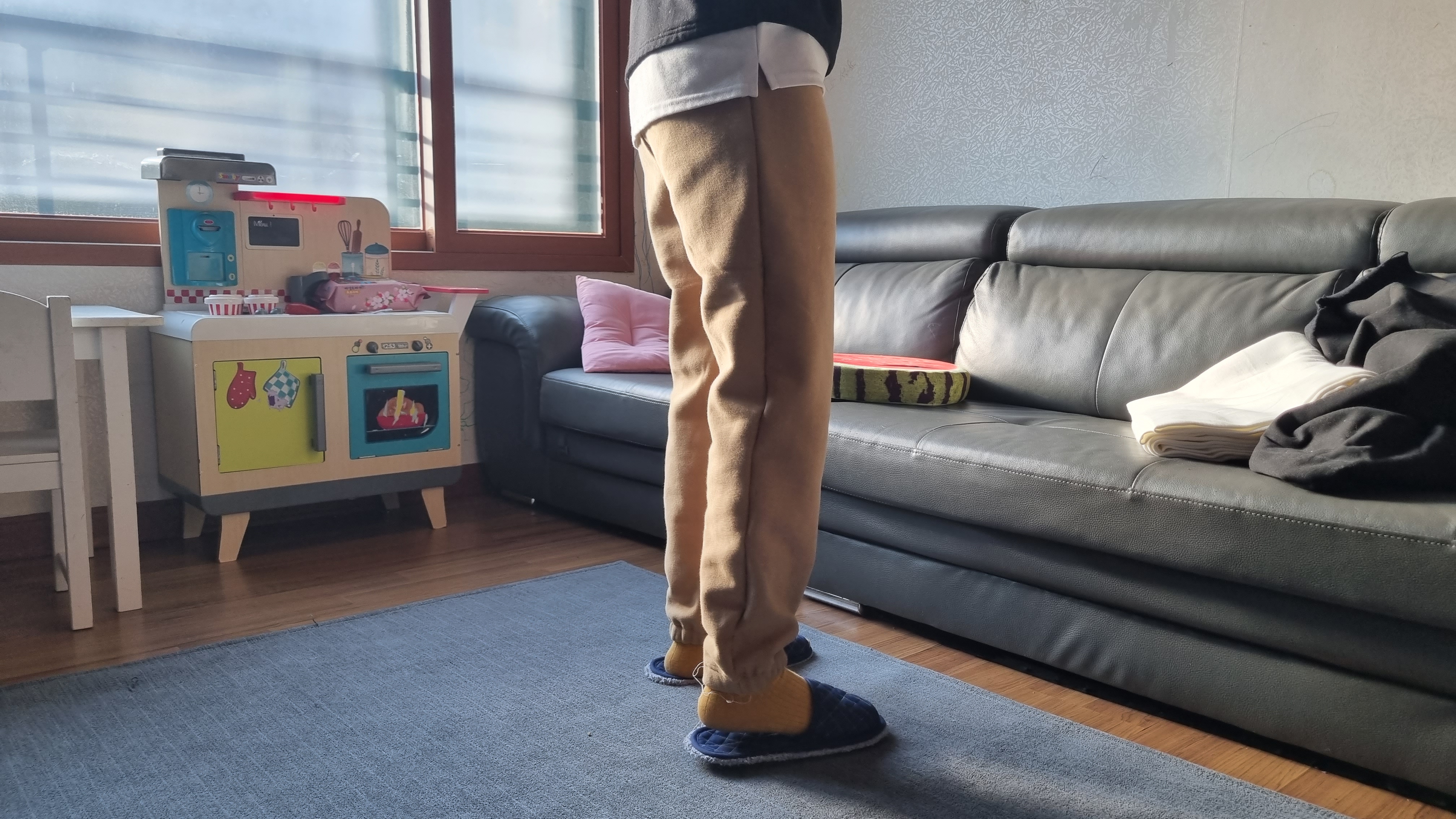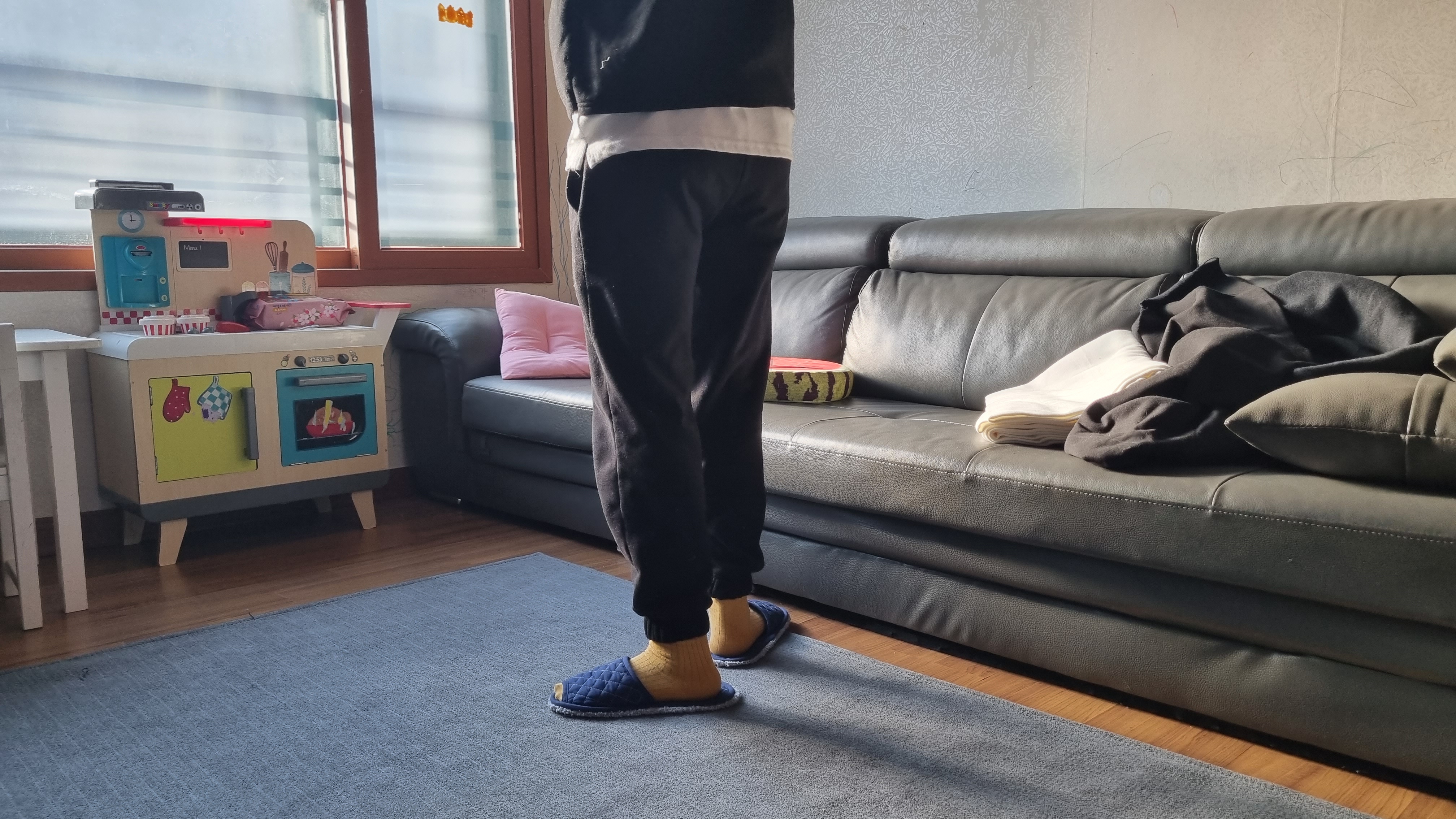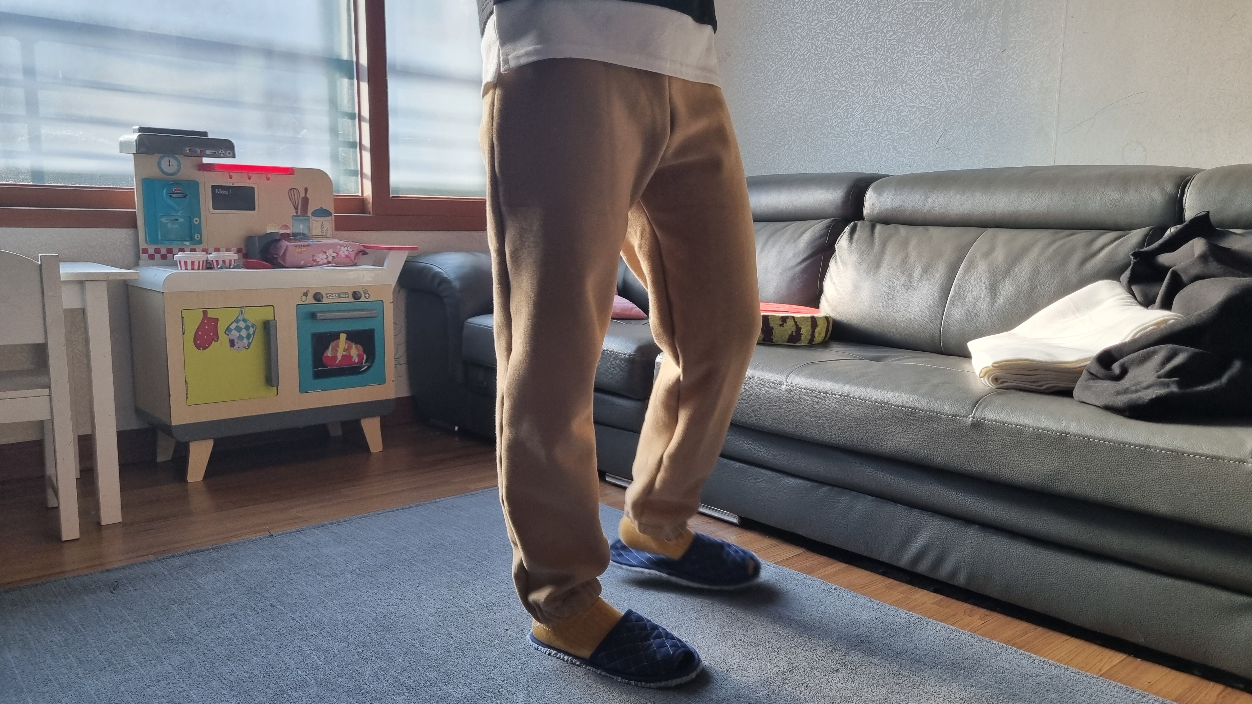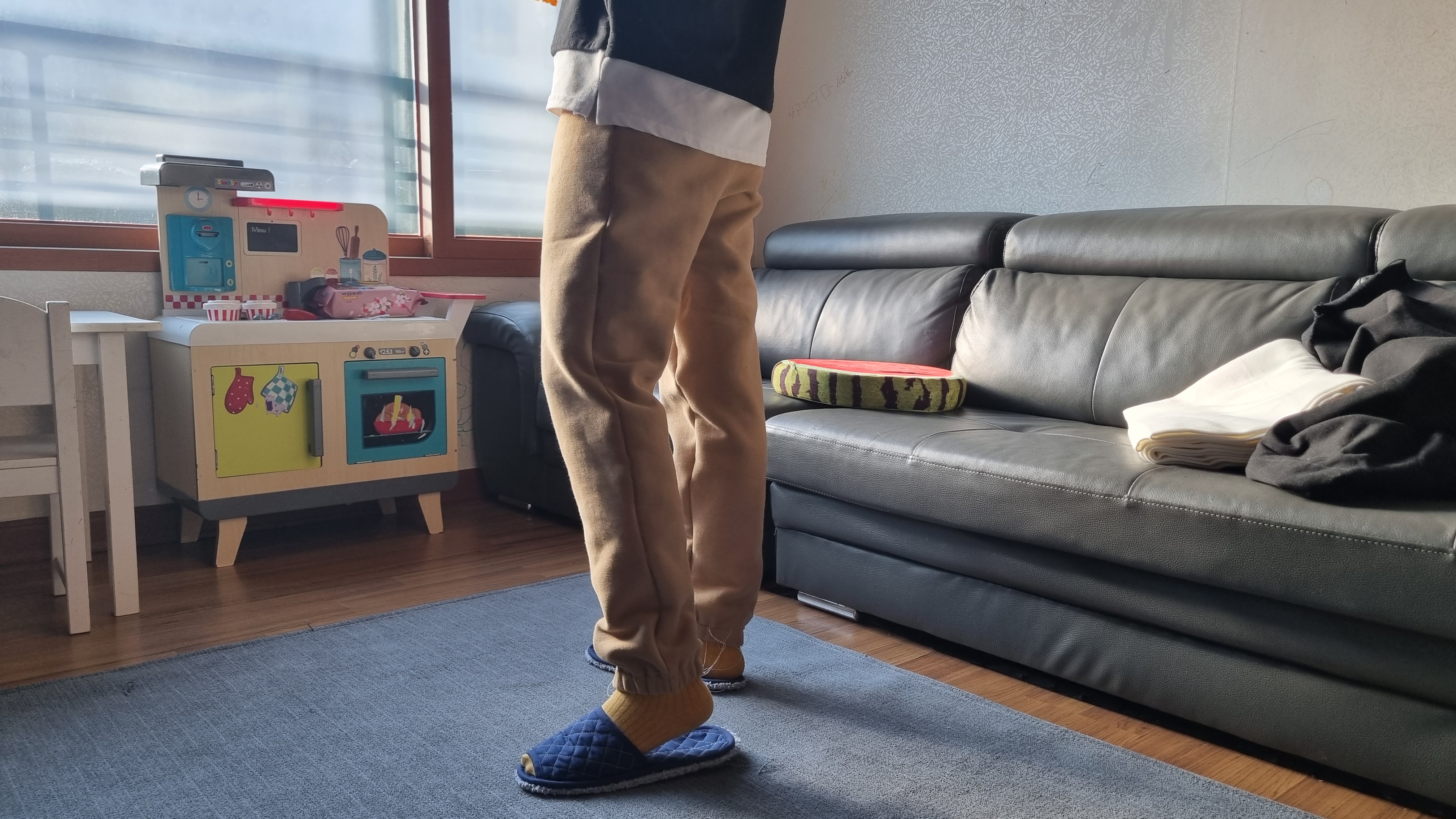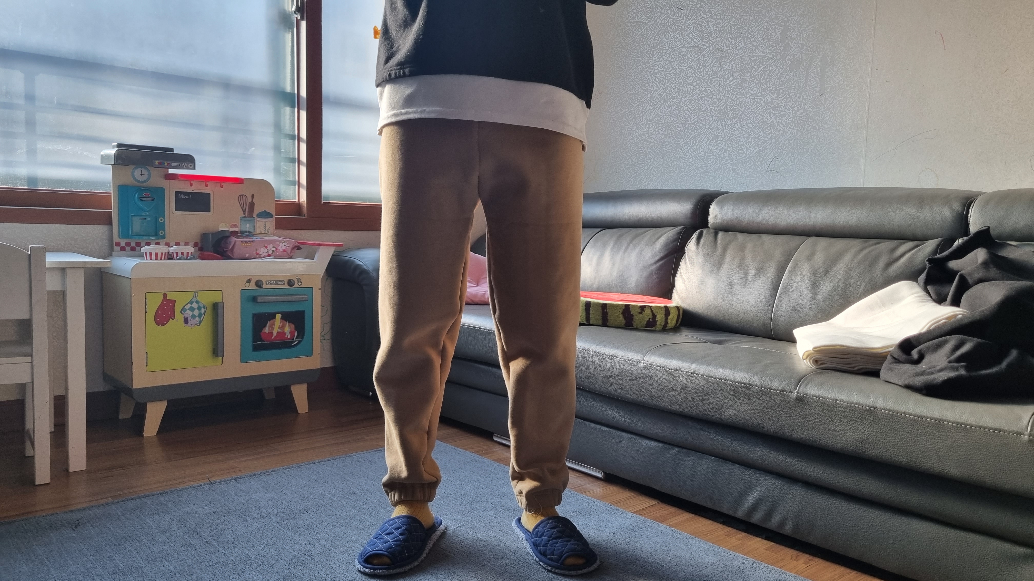 만든 조거팬츠 입어봤어요. 그리고 착용샷을 열심히 찍었어요. 밑단에 실밥 너덜거리는 거 혹시 보이시나요? 실밥은 왜 아직도 마무리를 안했냐고요? 급해서, 너~~~~무 궁금해서 빨리 입어봤어요. 일단 착용샷부터 보여드릴게요.