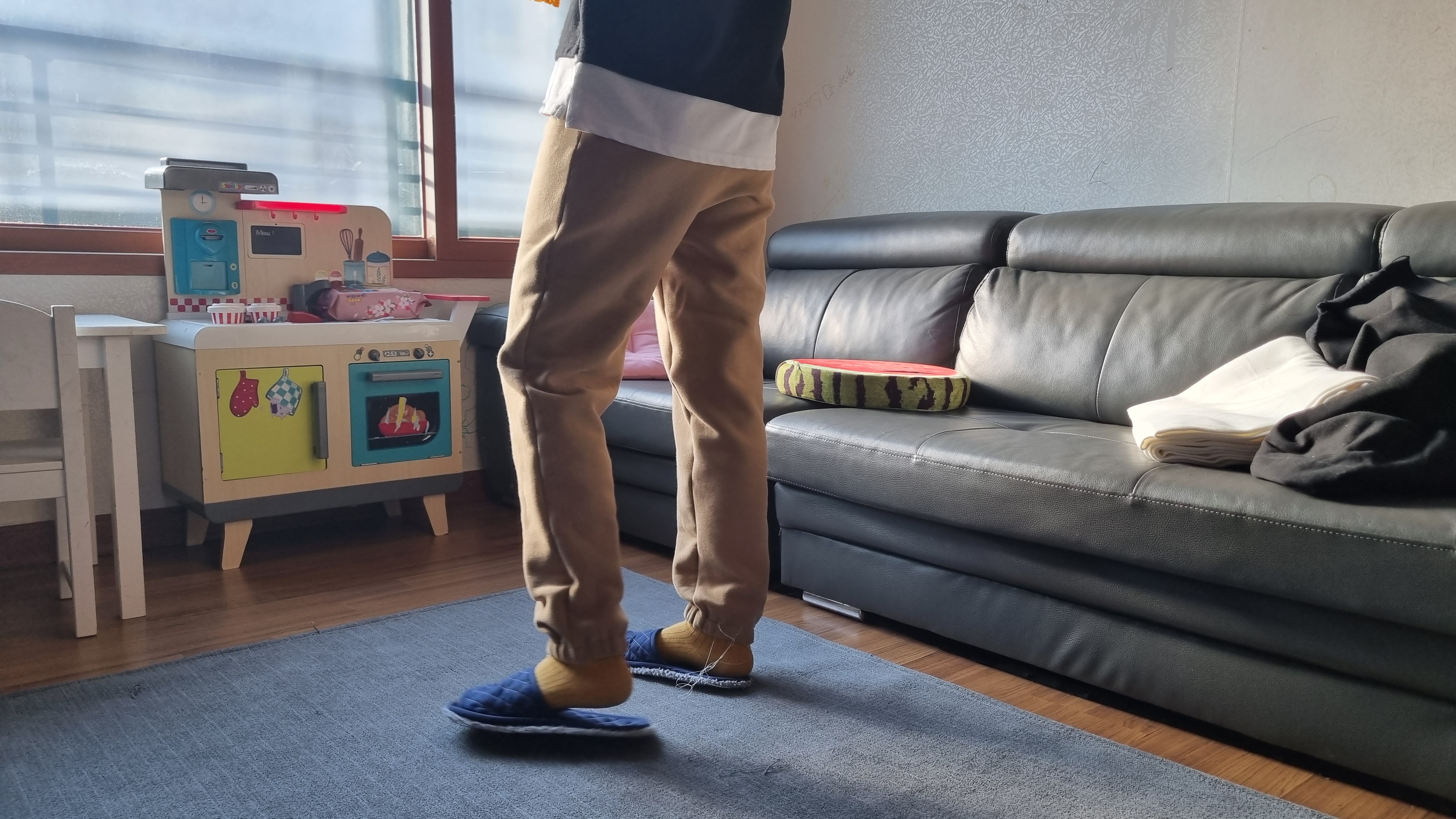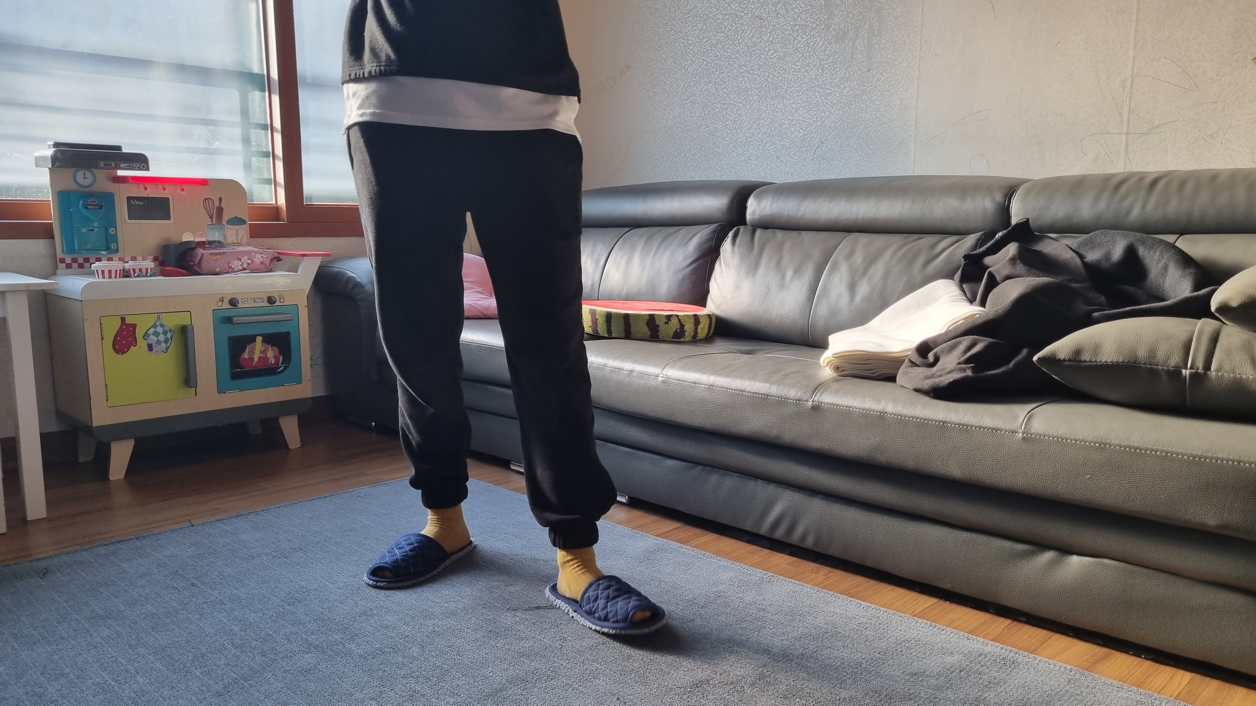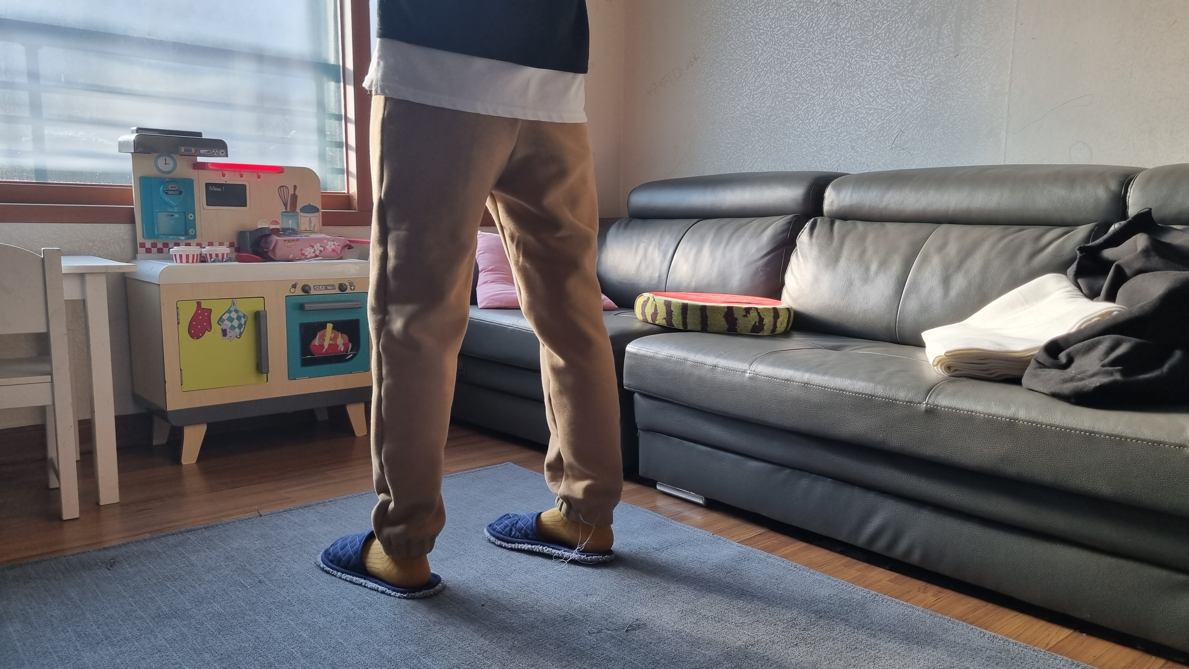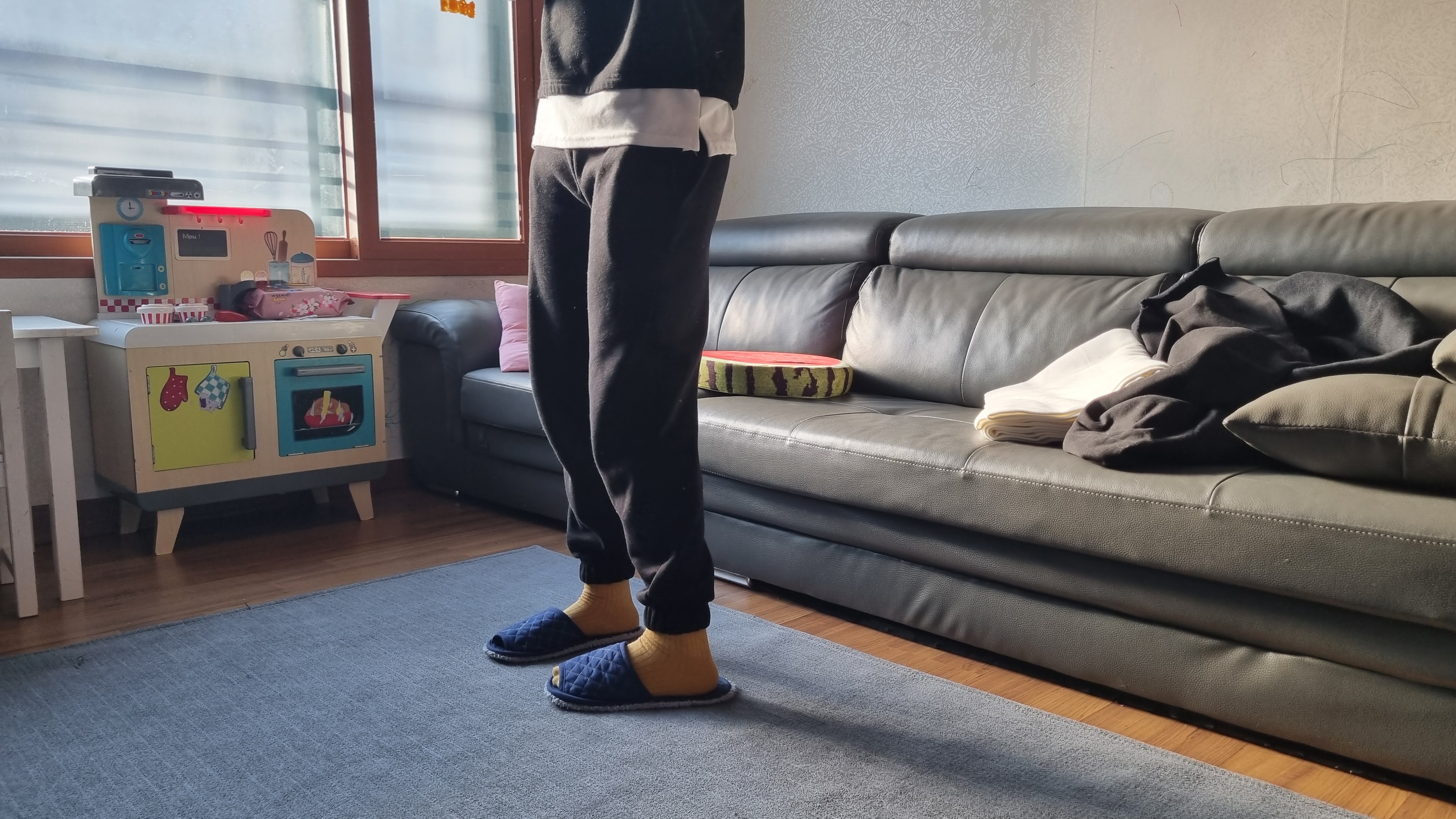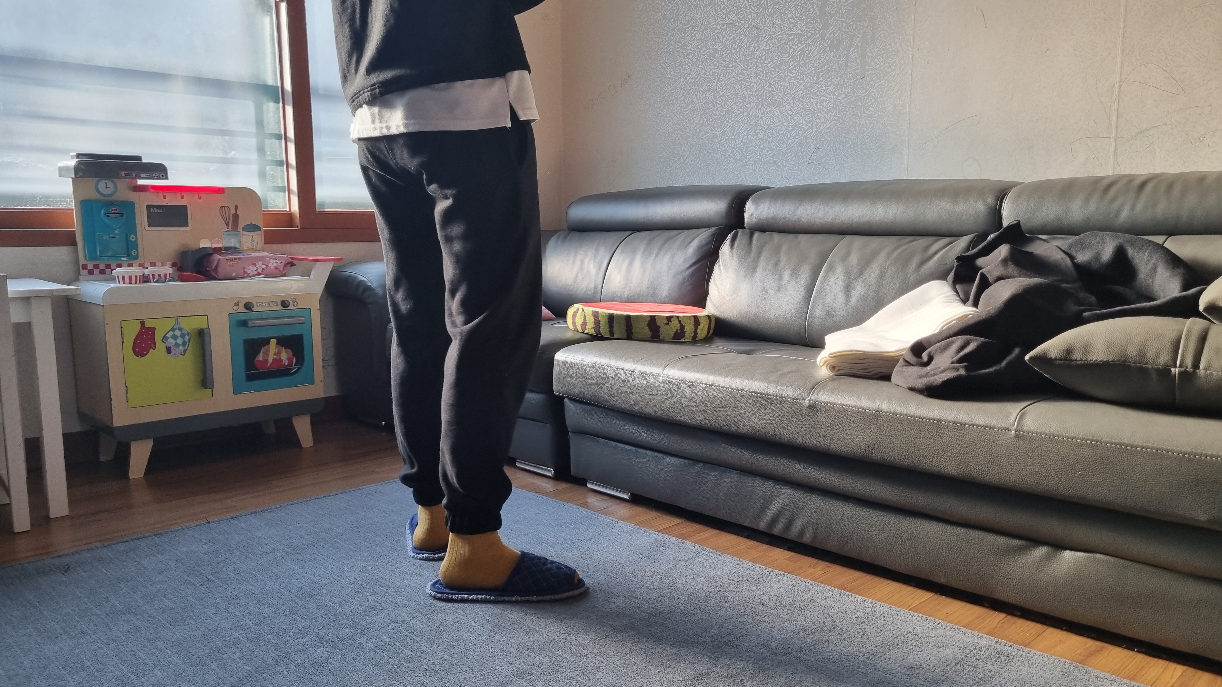 만든 조거팬츠 입어봤어요. 그리고 착용샷을 열심히 찍었어요. 밑단에 실밥 너덜거리는 거 혹시 보이시나요? 실밥은 왜 아직도 마무리를 안했냐고요? 급해서, 너~~~~무 궁금해서 빨리 입어봤어요. 일단 착용샷부터 보여드릴게요.