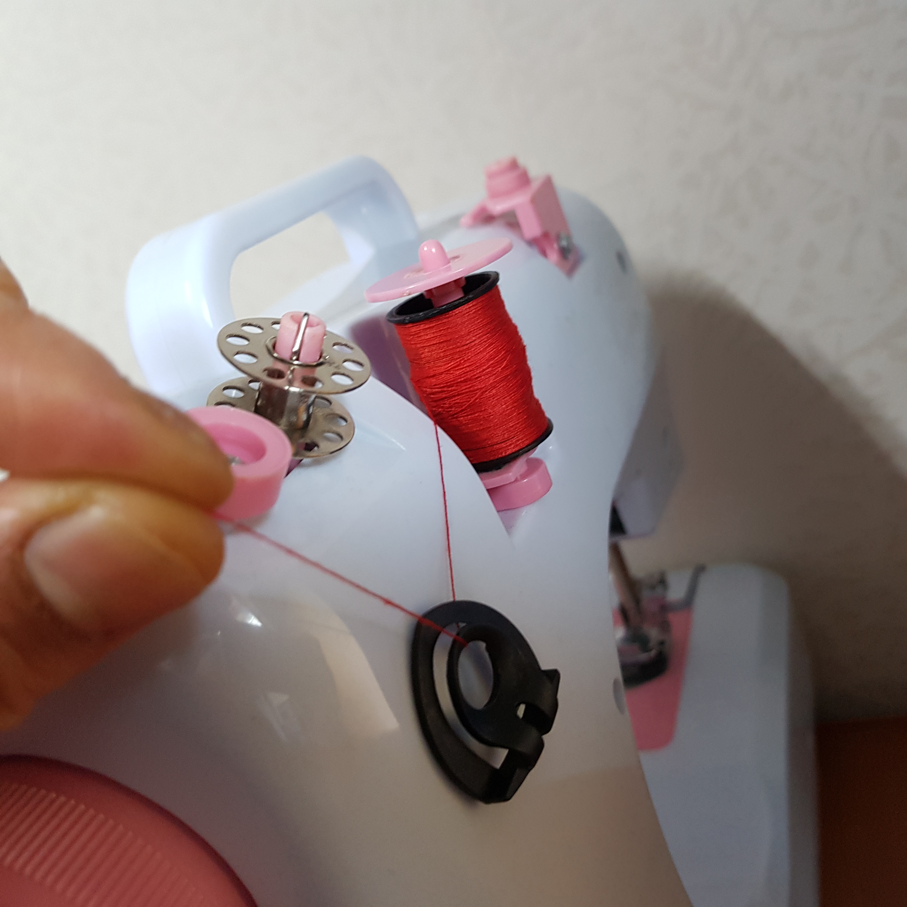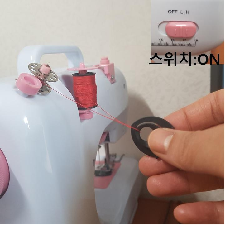 ⑦ 스위치 ON. 빈 실패(북알, 보빈)에 실이 감기는 동안 실패 감기 도구를 살살 당기면서 위, 아래로 왔다 갔다 하면 빈 실패에 실이 탱탱하게 감긴다.