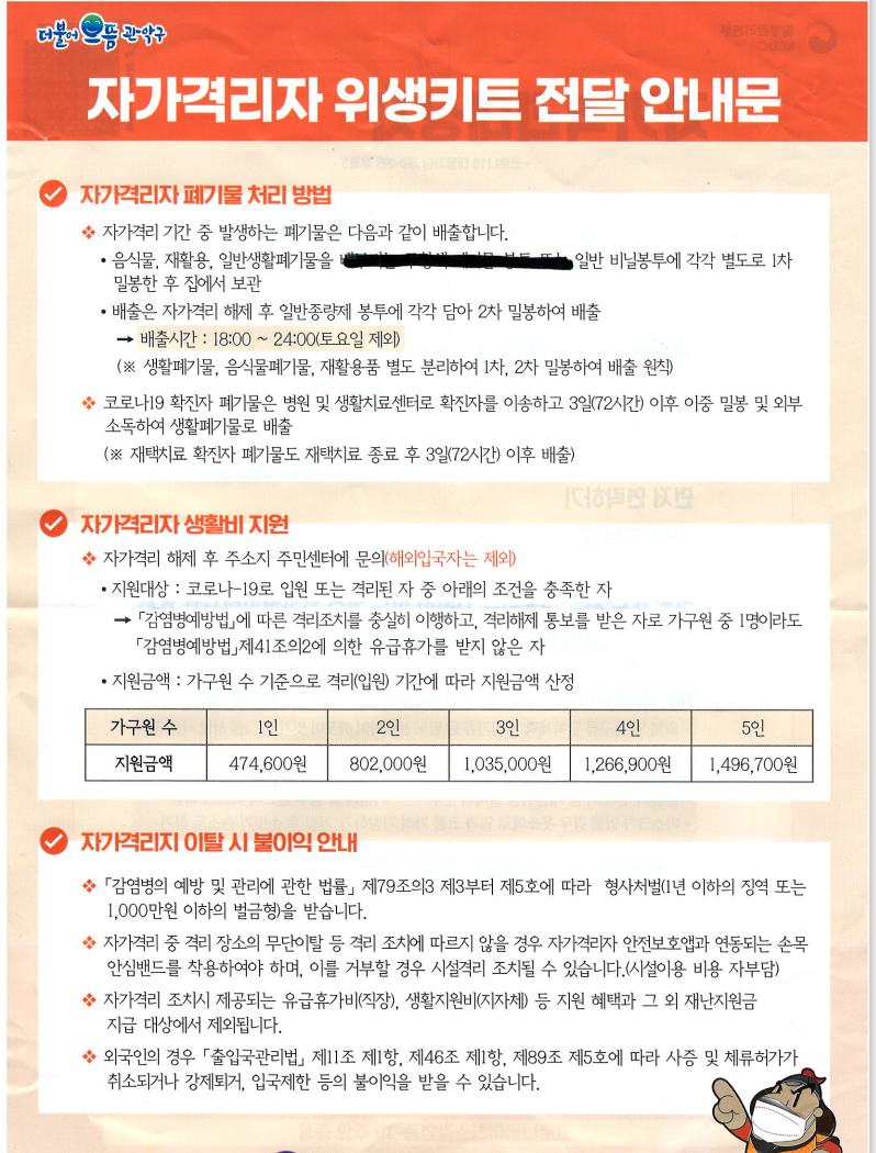 자가 격리자 안내문에 폐기물 처리 방법, 생활비 지원, 이탈 시 불이익에 대한 안내가 있어요. 자가격리 기간이 10일에서 7일로 변경되면서 자가격리자 생활비 지원도 줄어들 것 같아요. 아마 위에 있는 안내문은 14일 기준으로 지원하는 금액인 것 같아요. 아마도 저 금액에서 절반만 나올 것 같아요. 지원금 받으면 정확히 얼마 받았는지 포스팅할게요.
